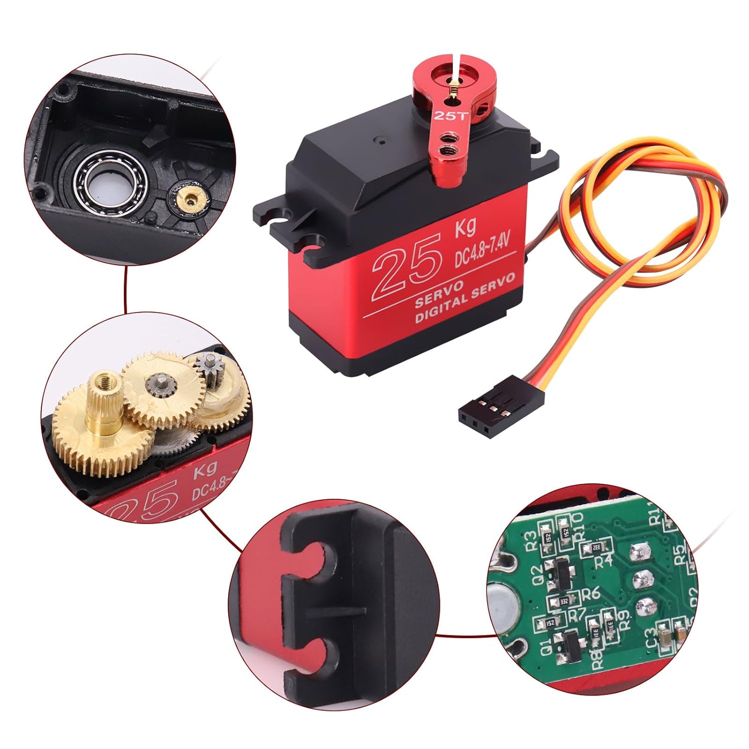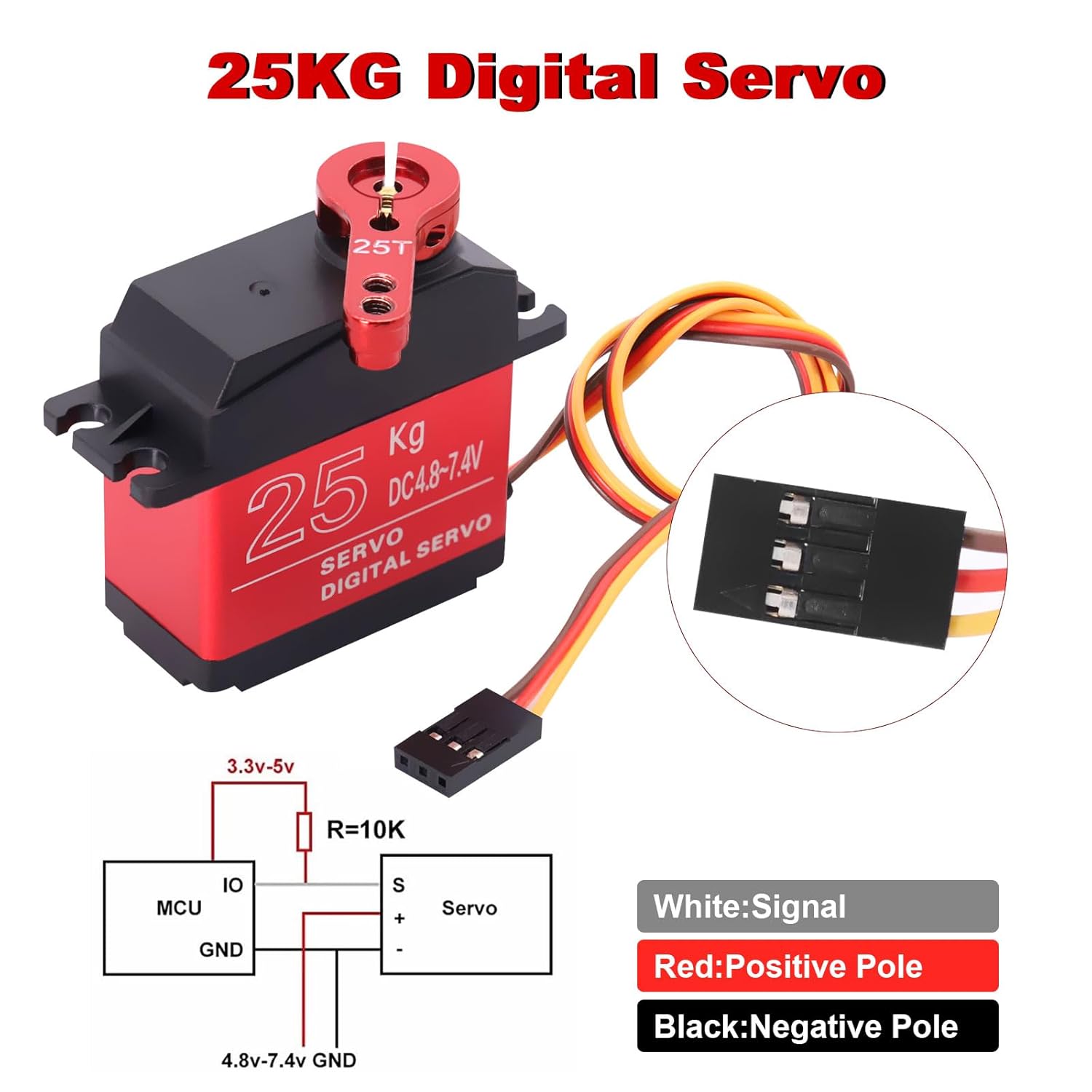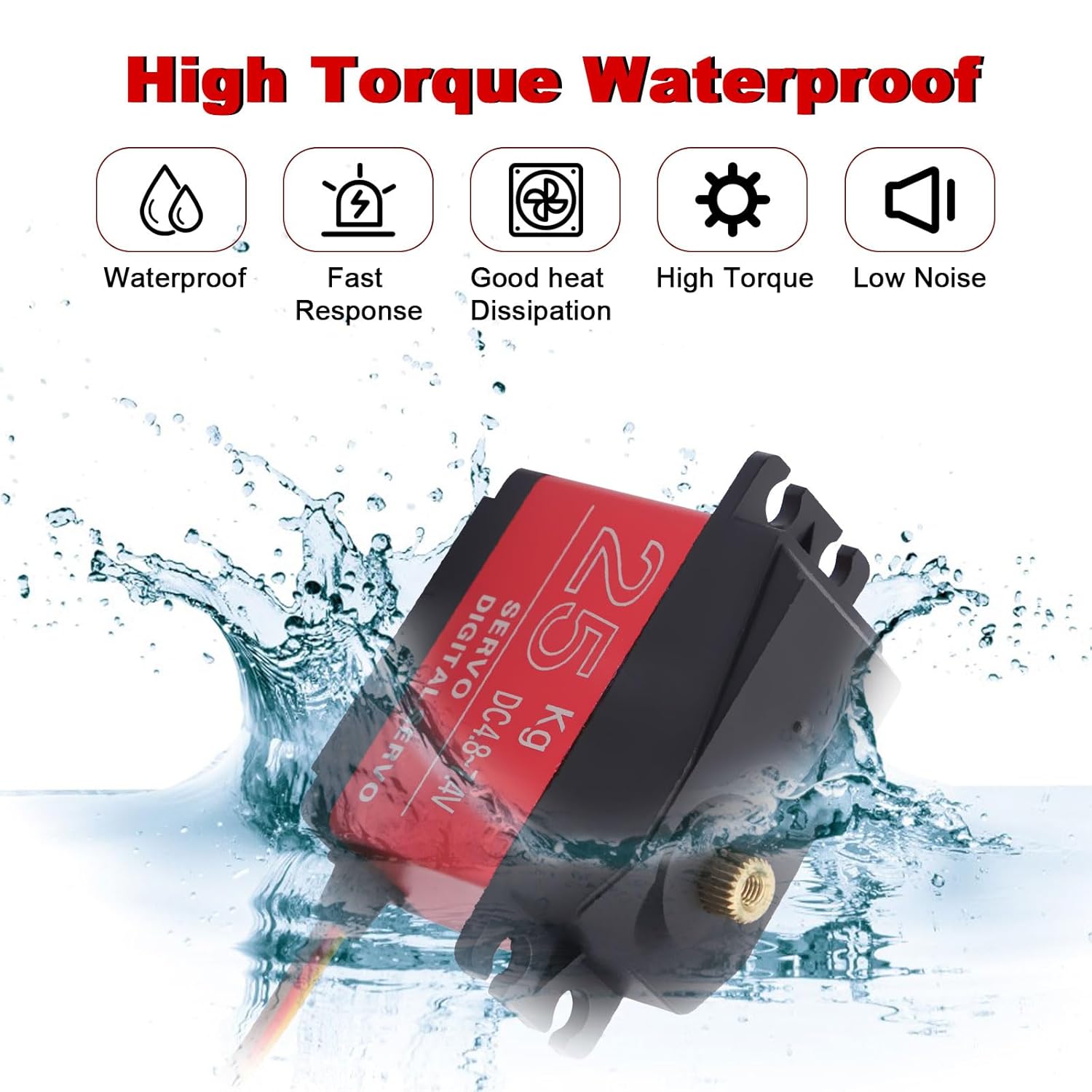 【Rendimiento de alto torque】Este servo RC de 25 kg con engranaje de acero inoxidable sin núcleo es completamente impermeable y está diseñado para aplicaciones de alto torque. El servomotor es ideal para brazos robóticos, coches RC, barcos y otras aplicaciones exigentes. 【Servomotor de alta calidad】Servomotor Con un tiempo de respuesta rápido, alta precisión y funcionamiento silencioso, este servo digital ofrece un excelente equilibrio de potencia a través del diseño de doble eje, tecnología antivibración y una carcasa de metal robusta para una disipación de calor óptima. 【Soporte de voltaje versátil】El servomotor es compatible con un voltaje de funcionamiento de 3,7 V a 7,2 V, lo que permite una fuente de alimentación flexible para diferentes aplicaciones y aumenta la versatilidad del motor. 【IP66 resistente al agua y duradero】Gracias a la mano de obra precisa y a los sellos de alta calidad, este servomotor digital ofrece una protección confiable contra el agua y el polvo. La carcasa de aluminio mecanizada por CNC garantiza una disipación del calor eficiente y una estabilidad a largo plazo. 【Control preciso y aplicación versátil】Gracias al control PWM con un ancho de pulso de 500-2500μs, el servomotore garantiza una respuesta rápida y precisa. Perfecto para modelos RC, drones, brazos robóticos, vehículos de escalada, barcos y otros proyectos de bricolaje.