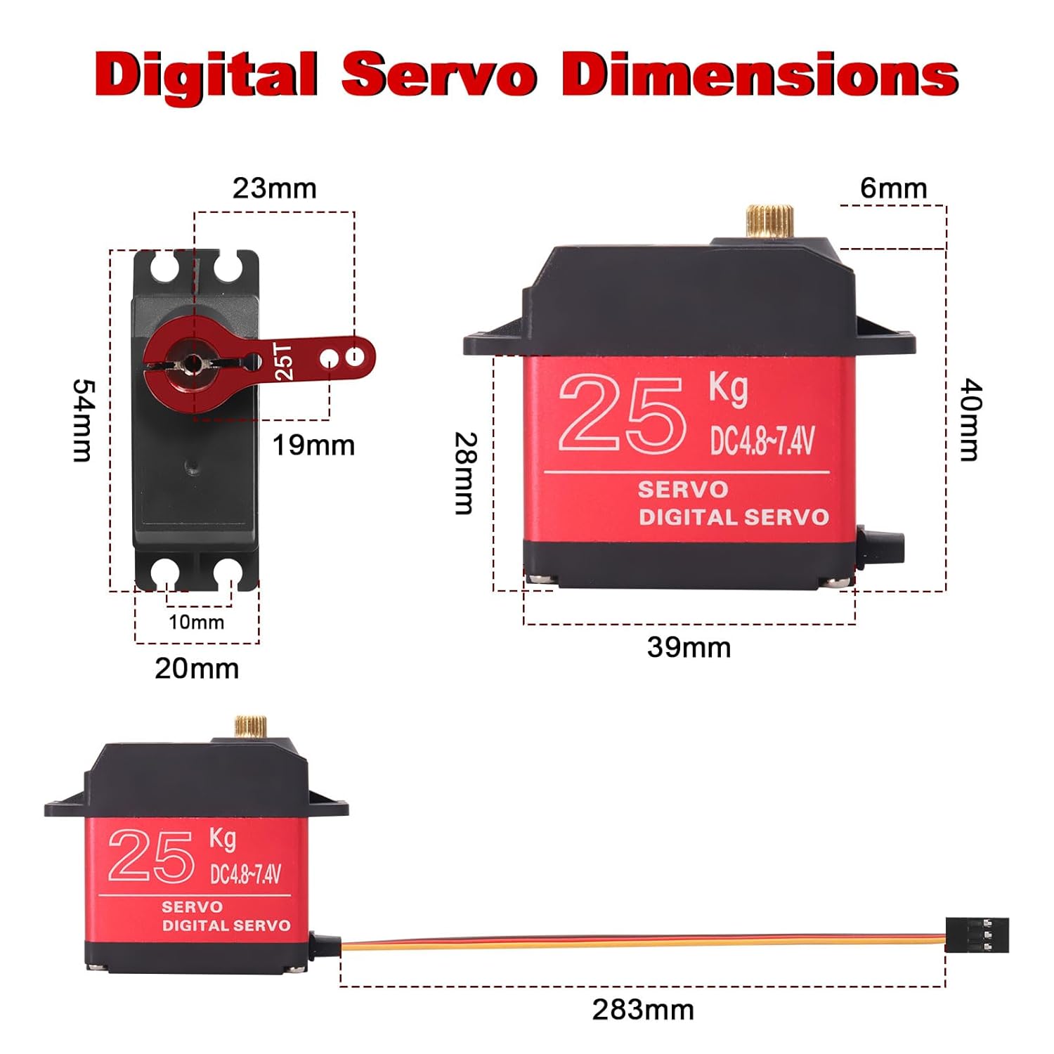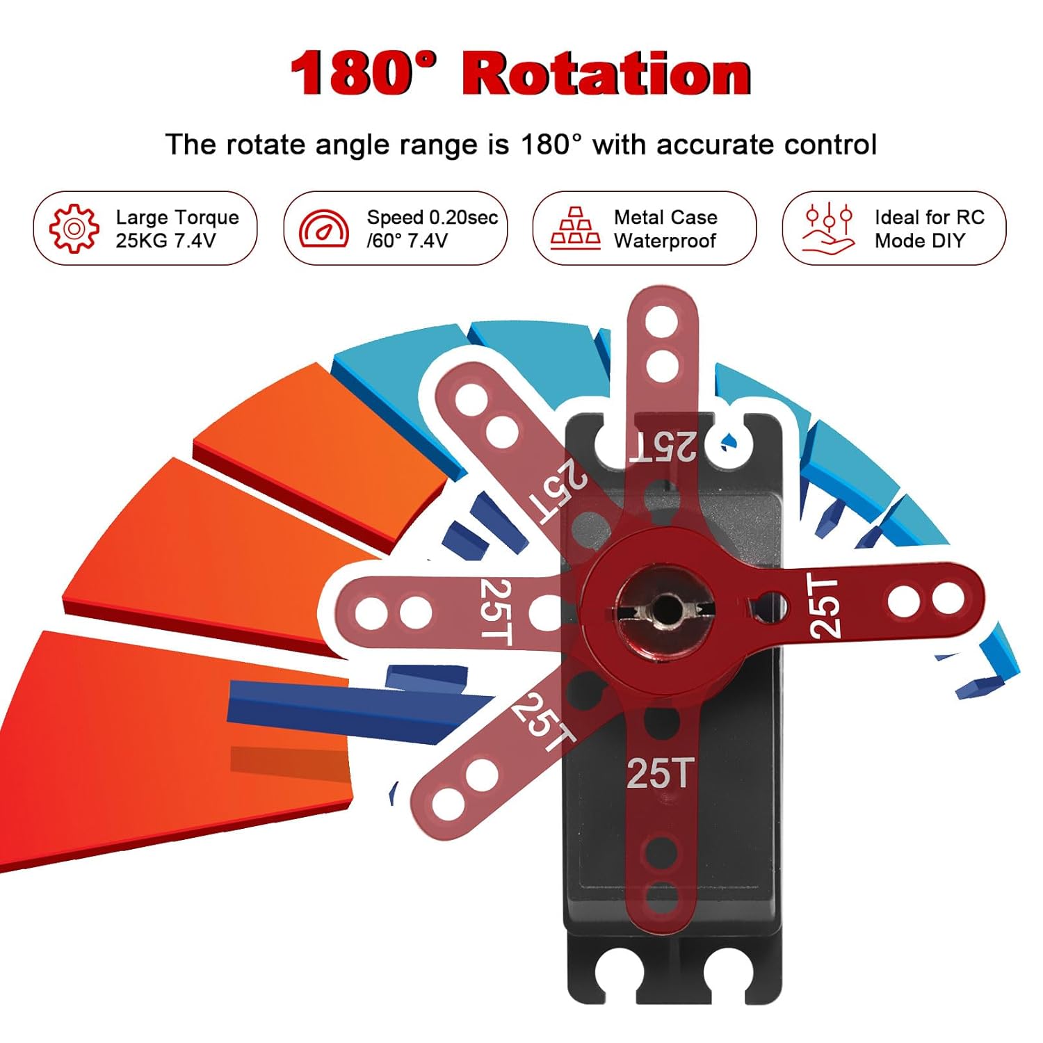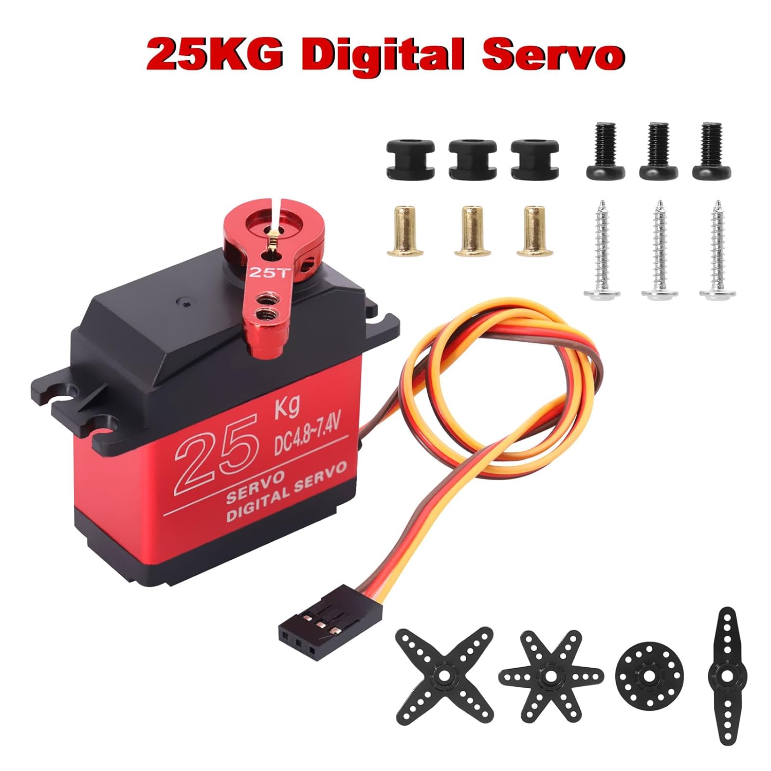 【Rendimiento de alto torque】Este servo RC de 25 kg con engranaje de acero inoxidable sin núcleo es completamente impermeable y está diseñado para aplicaciones de alto torque. El servomotor es ideal para brazos robóticos, coches RC, barcos y otras aplicaciones exigentes. 【Servomotor de alta calidad】Servomotor Con un tiempo de respuesta rápido, alta precisión y funcionamiento silencioso, este servo digital ofrece un excelente equilibrio de potencia a través del diseño de doble eje, tecnología antivibración y una carcasa de metal robusta para una disipación de calor óptima. 【Soporte de voltaje versátil】El servomotor es compatible con un voltaje de funcionamiento de 3,7 V a 7,2 V, lo que permite una fuente de alimentación flexible para diferentes aplicaciones y aumenta la versatilidad del motor. 【IP66 resistente al agua y duradero】Gracias a la mano de obra precisa y a los sellos de alta calidad, este servomotor digital ofrece una protección confiable contra el agua y el polvo. La carcasa de aluminio mecanizada por CNC garantiza una disipación del calor eficiente y una estabilidad a largo plazo. 【Control preciso y aplicación versátil】Gracias al control PWM con un ancho de pulso de 500-2500μs, el servomotore garantiza una respuesta rápida y precisa. Perfecto para modelos RC, drones, brazos robóticos, vehículos de escalada, barcos y otros proyectos de bricolaje.