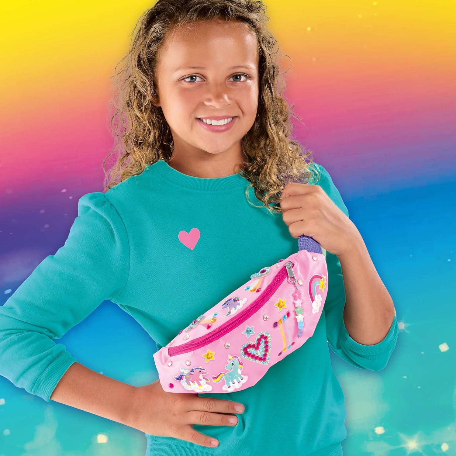 Progetta la tua borsa alla moda Galaxy alla moda con questo set creativo. Include un marsupio rosa da personalizzare con matite colorate e adesivi. Decorare con 180 adesivi diamantati, 84 adesivi di perle e adesivi glitter unicorno. Usa il foglio adesivo d'argento e le perline a stella per aggiungere un fascino personalizzato. Perfetto per i bambini che amano il fai da te, la moda e la creazione di accessori unici!