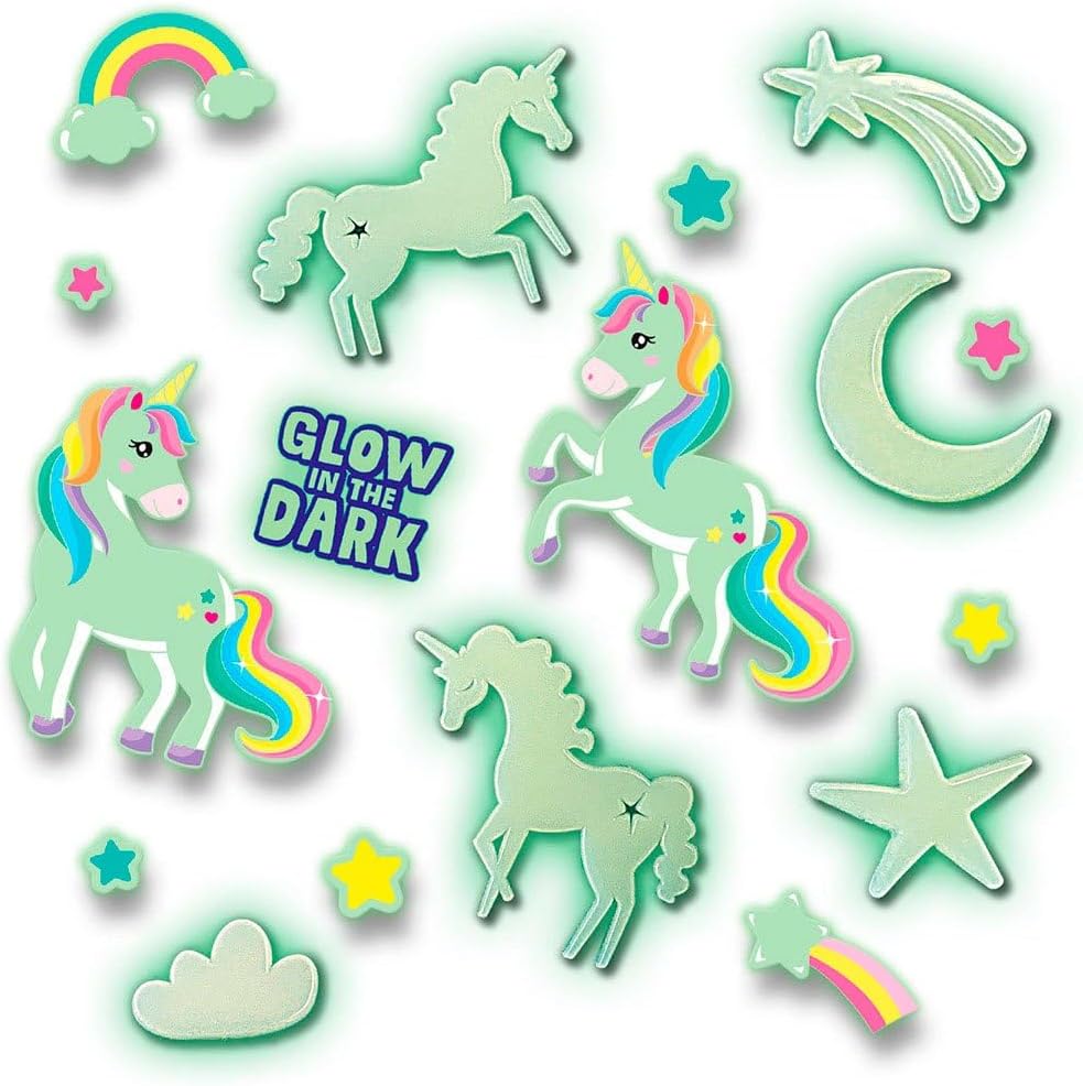 UNICORNO CHE BRILLANTE AL BUIO: questo kit creativo Explore SES trasforma la camera da letto in un mondo magico con 4 unicorni luminosi e 20 forme fosforescenti. Una decorazione a forma di unicorno per la cameretta di una ragazza, facile da installare e che non richiede collegamenti. ADESIVI PER LA CAMERA DA LETTO DELLA RAGAZZA UNICORNO: Personalizza il tuo arredamento con gli adesivi da soffitto con unicorno e gli adesivi lucidi inclusi. Grazie ai cuscinetti in schiuma bifacciali, si fissano saldamente alla parete o al soffitto. DECORAZIONE DA PARETE FOSFORESCENTE: Ogni oggetto si illumina al buio senza batterie o elettricità. Questi adesivi murali fosforescenti offrono un'atmosfera morbida, una perfetta alternativa alla luce notturna dell'unicorno per rassicurare i bambini. ATTIVITÀ SERATA TRANQUILLA PER BAMBINI: Fissare gli unicorni e le stelle è un momento divertente e rilassante. Questo giocattolo a forma di unicorno luminoso promuove l'indipendenza serale e crea un magico rituale della buonanotte in una camera da letto a tema magico. IDEA REGALO – REALIZZATO NEI PAESI BASSI: questo set di unicorni che si illuminano al buio è stato progettato da SES Creative a Enschede. Prodotto CO₂ neutro, sicuro, decorativo e conforme agli standard per bambini dai 5 anni in su.