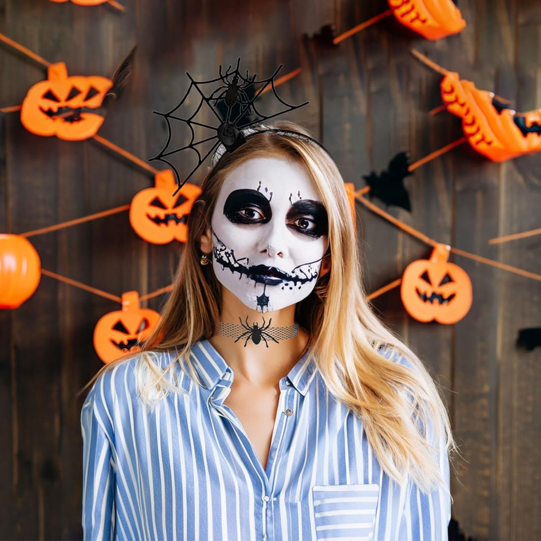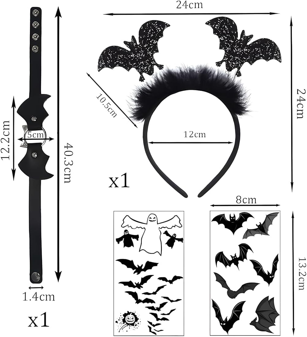 Set Vampiro Donna: Trasformati in un attimo con questo kit di accessori a 4 pezzi, che include un cerchietto con pipistrello, un elegante collare in stile choker e due fogli di tatuaggi temporanei versatili per viso e corpo. Accessori Misteriosi per Capelli: Il cerchietto nero è decorato con due pipistrelli scintillanti e una base soffice, creando un look misterioso e giocoso, ideale per attirare l'attenzione. Dettagli Eleganti: La collana vampiro in similpelle è regolabile e completa qualsiasi outfit gotico o da vampiro, i tatuaggi inclusi si applicano facilmente sulla pelle per un tocco di stile personalizzato. Versatile: Perfetto come accessori Halloween donna vampiro, per Carnevale o feste a tema, questo set è l'ideale per donne e ragazze che vogliono incarnare un tema vampiro, strega o gotico. Facile ed Efficace: Una soluzione rapida ed efficace per creare un costume Halloween vampiro donna senza sforzo, gli accessori sono robusti e adatti a più eventi, così sarai pronta per ogni festa.