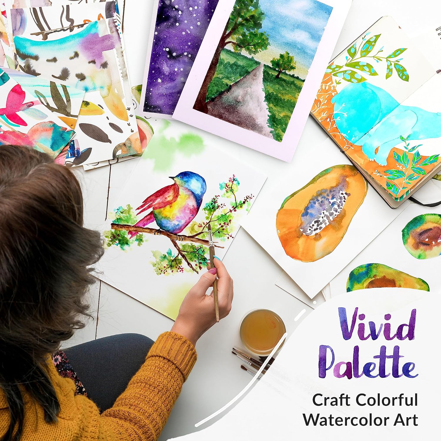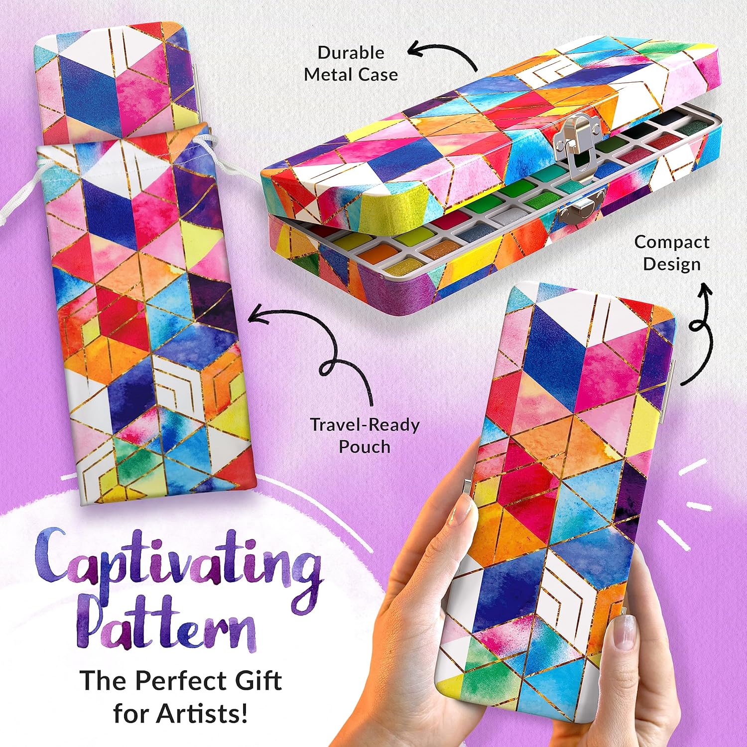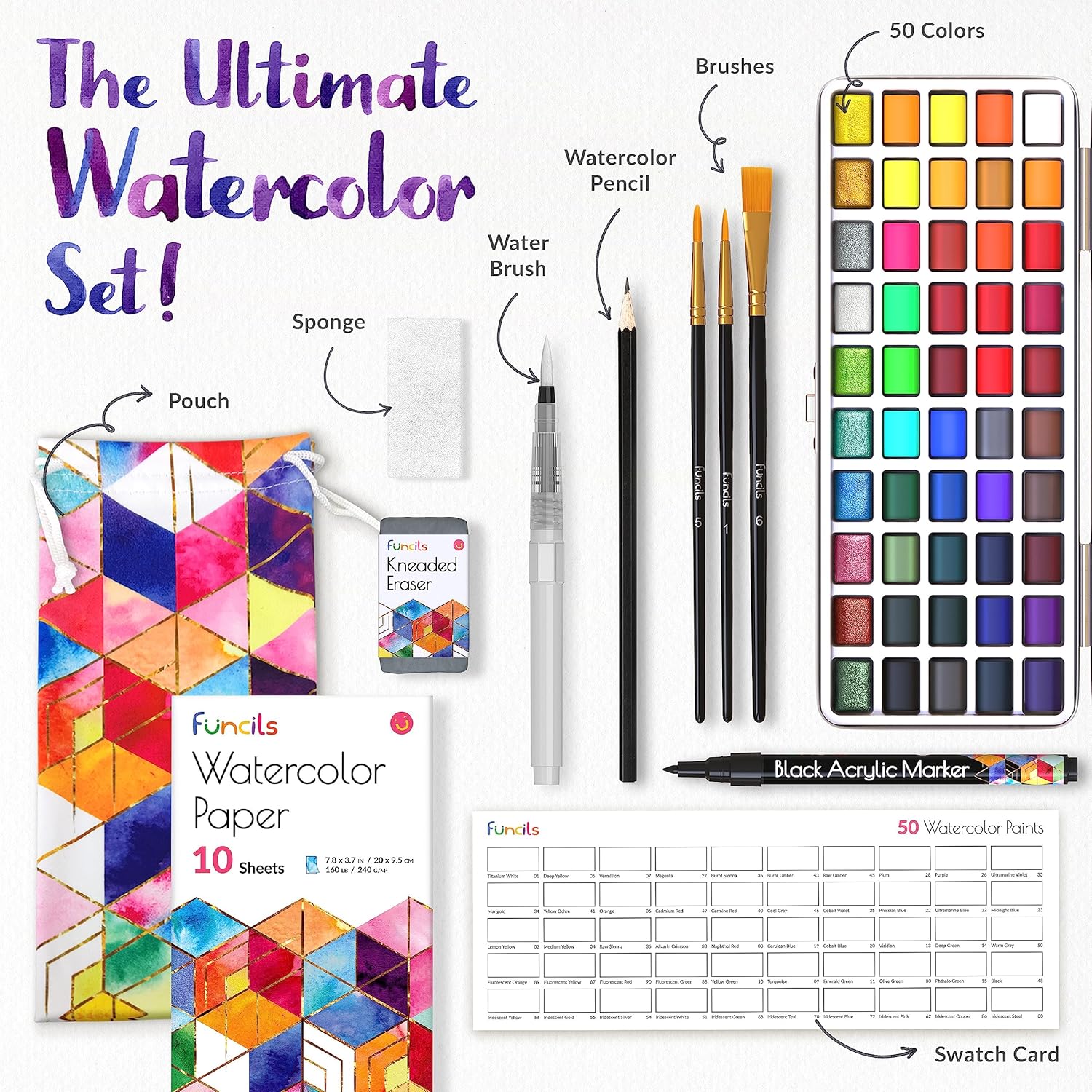 Set Di Acquerelli Per Adulti - 50 colori (inclusi acquerelli metallizzati professionali), 3 pennelli per acquerello, 10 fogli di carta, 1 matita, 1 gomma impastata, 1 penna per acquarelli, 1 pennarello nero e 1 spugna Set Acquerelli Professionali per Adulti - Ampia selezione di colori di alta qualità, scatola acquerelli acquerello di livello professionale - Acquerelli per adulti, per principianti e professionisti Set Di Pittura Ad Acquerello Per Principianti - Kit acquerelli professionali per principianti sono perfette acquerelli liquidi da aggiungere alla tua collezione oggi! I acquerelli set perfetti per gli artisti Set Di Pittura Ad Acquerello Per Adulti - Sicuro e non tossico - Il miglior set di pittura ad acquerello per bambini privo di acidi conforme a ASTM D4236 e EN71. Questi possono essere usati per dipingere con acqua su tamponi per acquerello. Set Di Acquerelli Da Viaggio Pieghevoli Di Alta Qualità: i colori ad acquerello portatili tutto in uno per adulti. Questo kit acquerello è adatto anche come acquarelli set da viaggio e acquerelli per bambini.