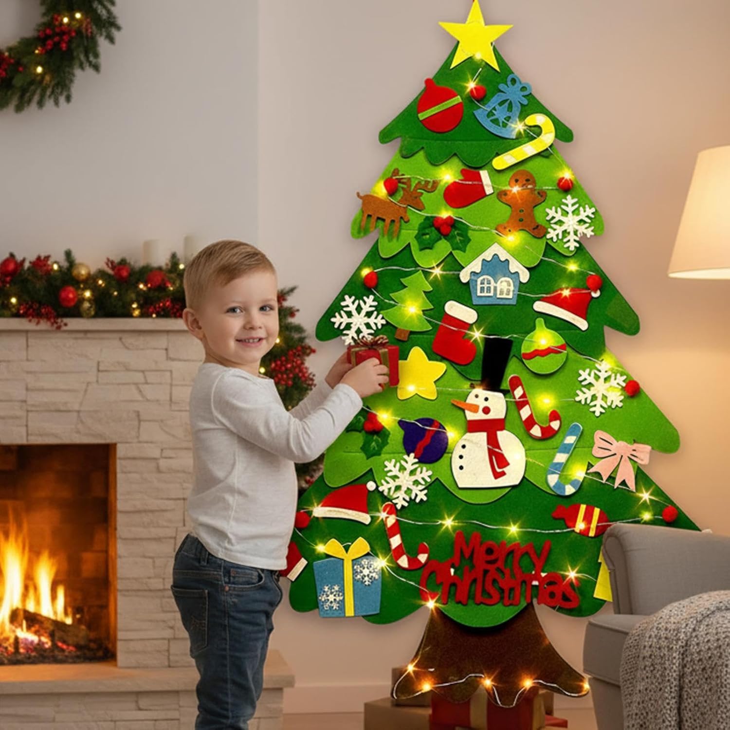 di fissaggio sicuro: questo albero di Natale in feltro è dotato di un di fissaggio affidabile che mantiene gli ornamenti saldamente in posizione, prevenendone la perdita e favorendo la creatività mentre i bambini riorganizzano le decorazioni in modo sicuro durante le attività festive o le riunioni di famiglia Preparazione senza problemi: caratterizzato da un design di installazione rapida, questo albero di Natale in feltro per bambini garantisce un assemblaggio facile e senza stress, adatto a utenti di tutti i livelli e fornendo opportunità di posizionamento adattabili sia per feste vivaci che per ambienti domestici confortevoli Strumento di apprendimento pratico: con il set di alberi di Natale in feltro fai-da-te, i bambini si impegnano in un apprendimento pratico disponendo pezzi di feltro riutilizzabili, che supportano la crescita cognitiva e offrono intrattenimento senza fine durante i momenti di familiare durante le vacanze Artigianato natalizio facile da trasportare: caratterizzato da un design portatile e leggero, questo albero di Natale in feltro fai-da-te consente ai bambini di portare l'allegria ovunque, migliorando il loro divertimento durante le vacanze sia che venga utilizzato all'interno di casa o condiviso in un ambiente scolastico Soluzione di decorazione istantanea: con il set per albero di Natale in feltro, gli utenti possono creare rapidamente splendide decorazioni utilizzando diversi motivi festivi e luci a batteria alimentate a batteria, risparmiando e aggiungendo fascino a riunioni, feste di famiglia o feste stagionali in qualsiasi ambiente interno