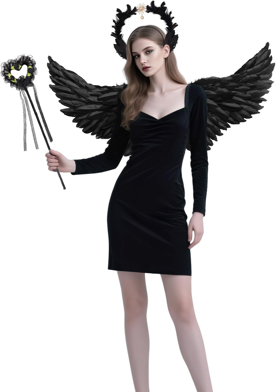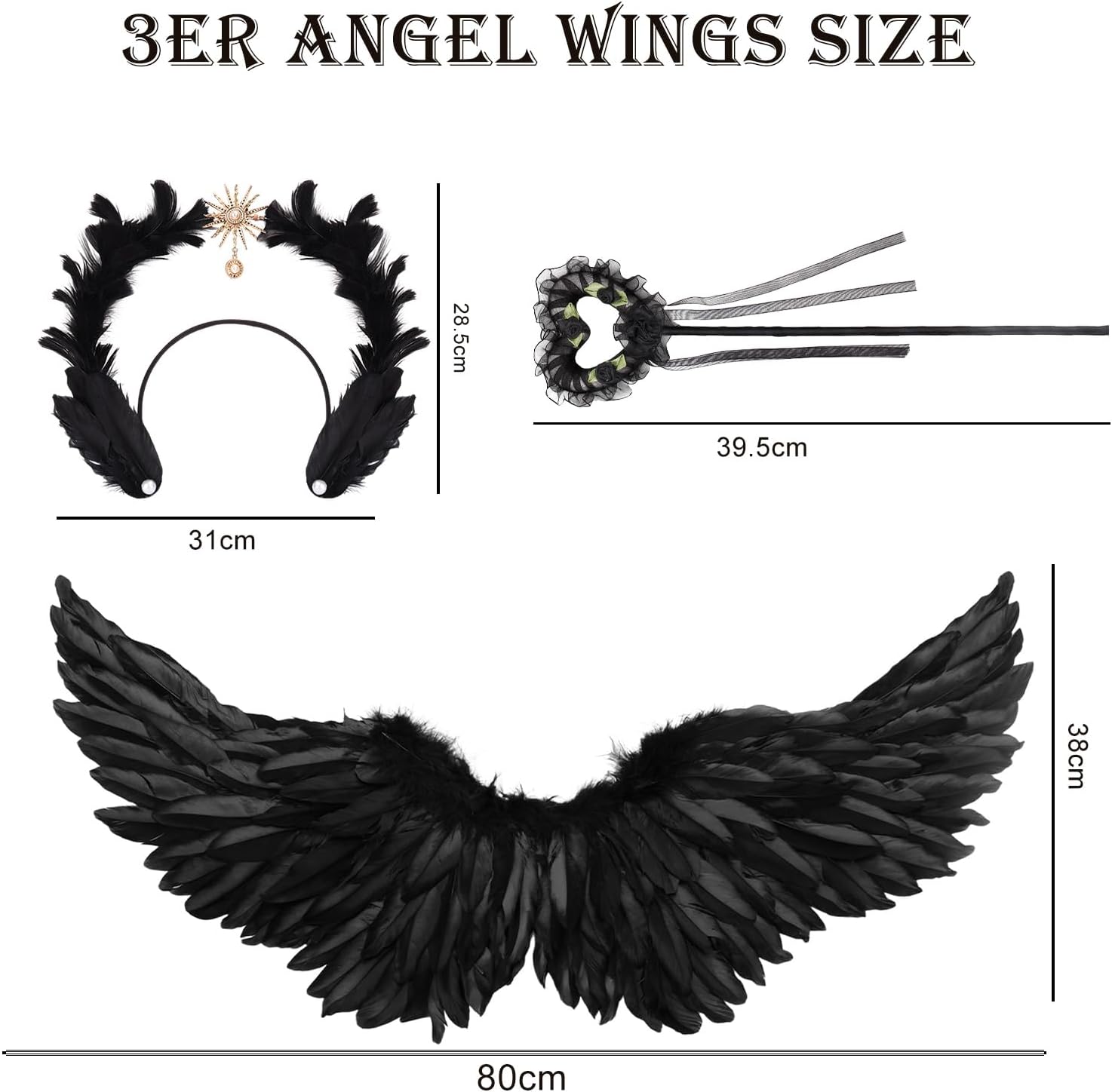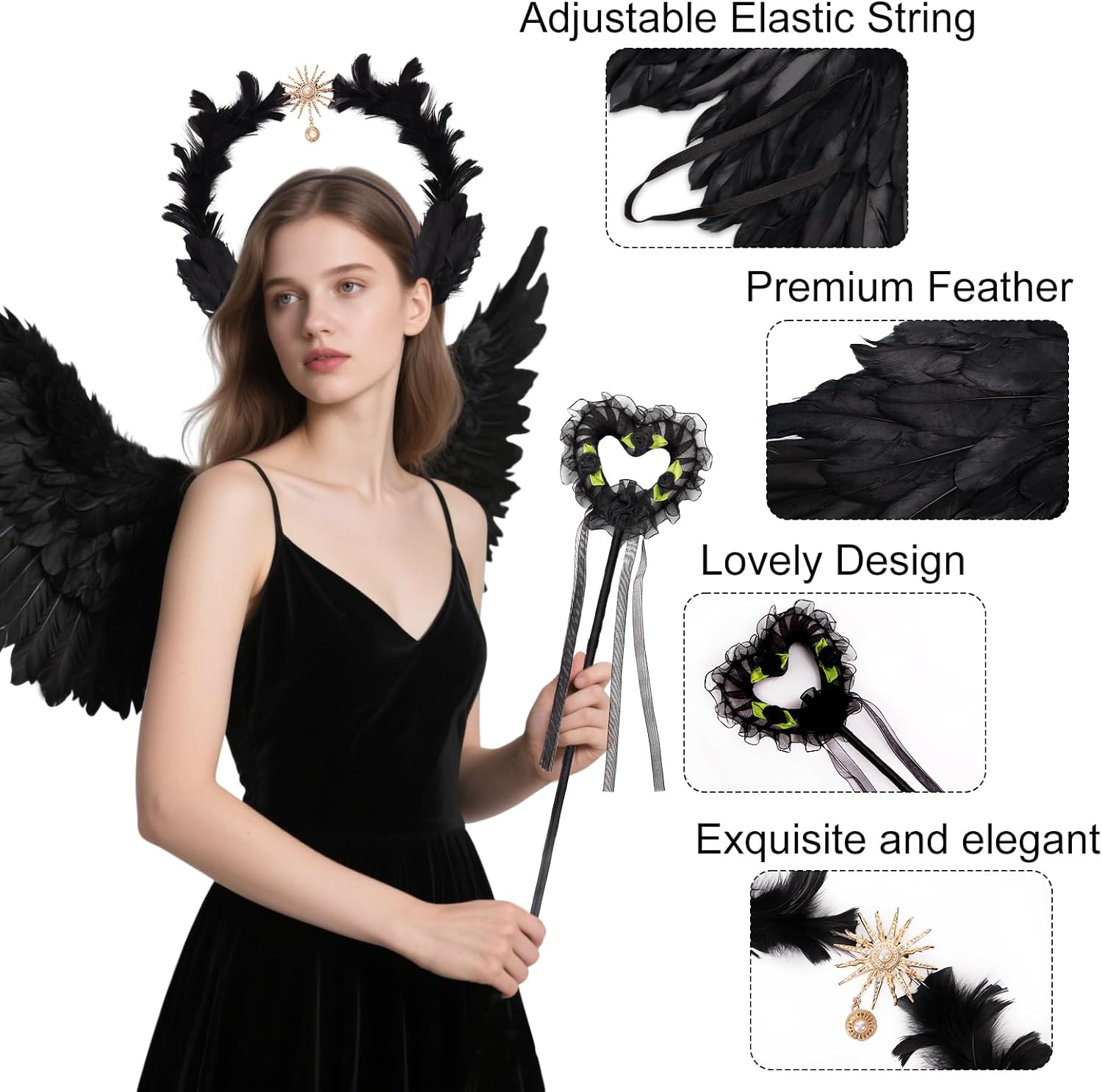 👑 Set costume da angelo: il set angelico divino contiene 1 elegante paio di ali da angelo nere (circa 80 cm x 35 cm), 1 corona da donna Black Swan realizzata a mano con piume e amuleto dorato a forma di sole e 1 bacchetta magica mistica. 🌙 Corona nera reale: copricapo angelico gotico, l'anello esterno è avvolto da morbide piume e presenta un amuleto solare dorato con una perla incastonata per un tocco mitologico elegante e senza tempo. I dettagli curati e il pizzo di perle conferiscono un aspetto lussuoso. 💎Materiali: le ali nere e il copricapo da elfo sono realizzati con piume naturali di alta qualità, il copricapo ha una struttura in metallo robusta ma leggera, ogni pezzo è realizzato con cura per garantire durata e comfort. ✨ Design Angel Wings: ali nere che si dispiegano in un gesto aggraziato e divino, ma catturate nell'eleganza senza tempo di una dea fluttuante, per conferirvi l'aspetto maestoso di una divinità. 🌟Occasioni diverse: trasformati in una dea della mitologia durante il carnevale, le feste di Halloween, gli eventi cosplay, i matrimoni a tema, gli spettacoli teatrali o le feste di compleanno. Il set di costumi da angelo nero attira sicuramente l'attenzione e conferisce alla tua apparizione un'aura magica.