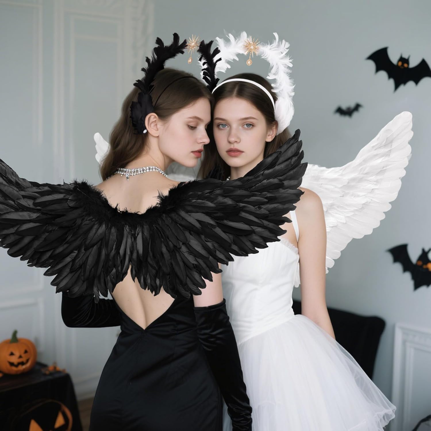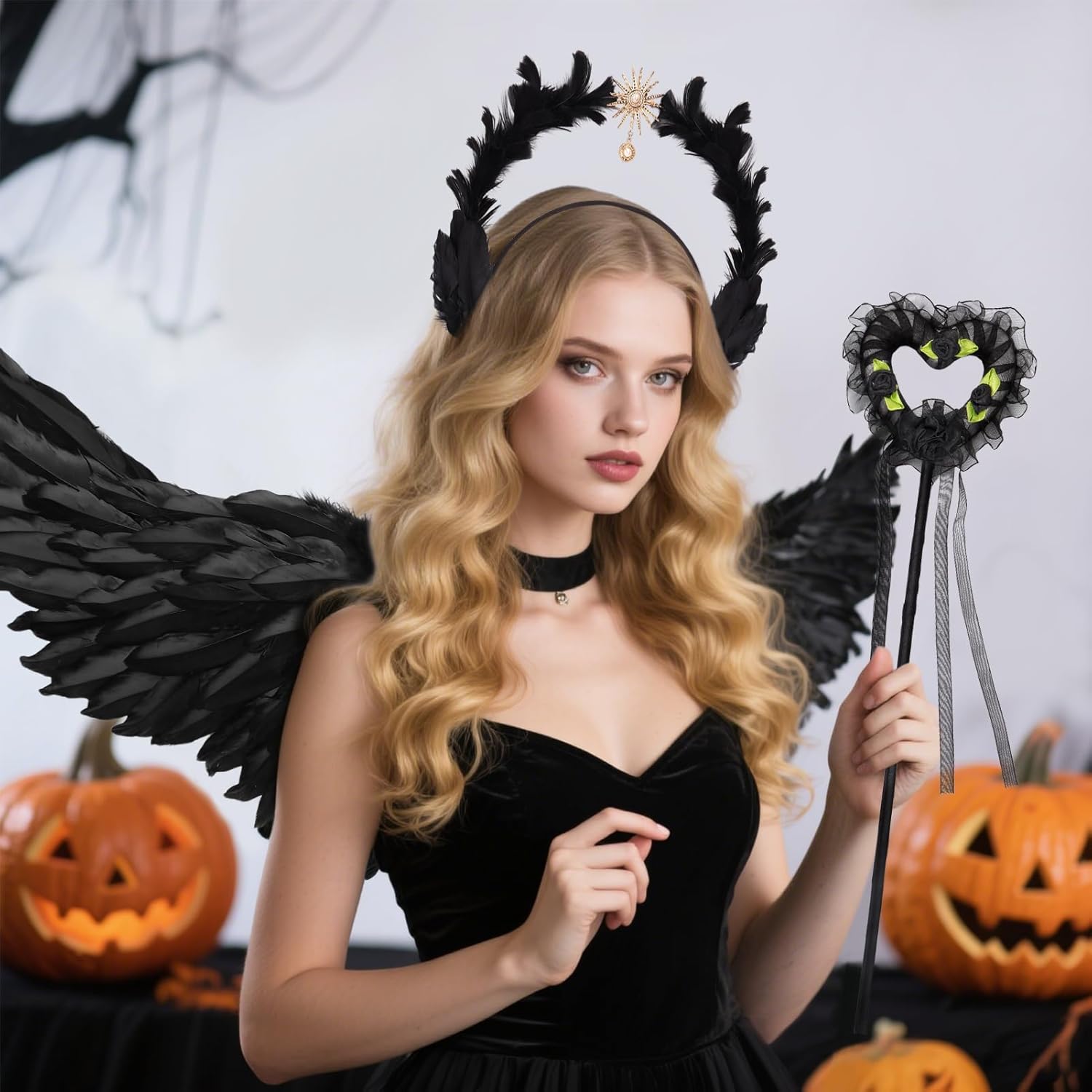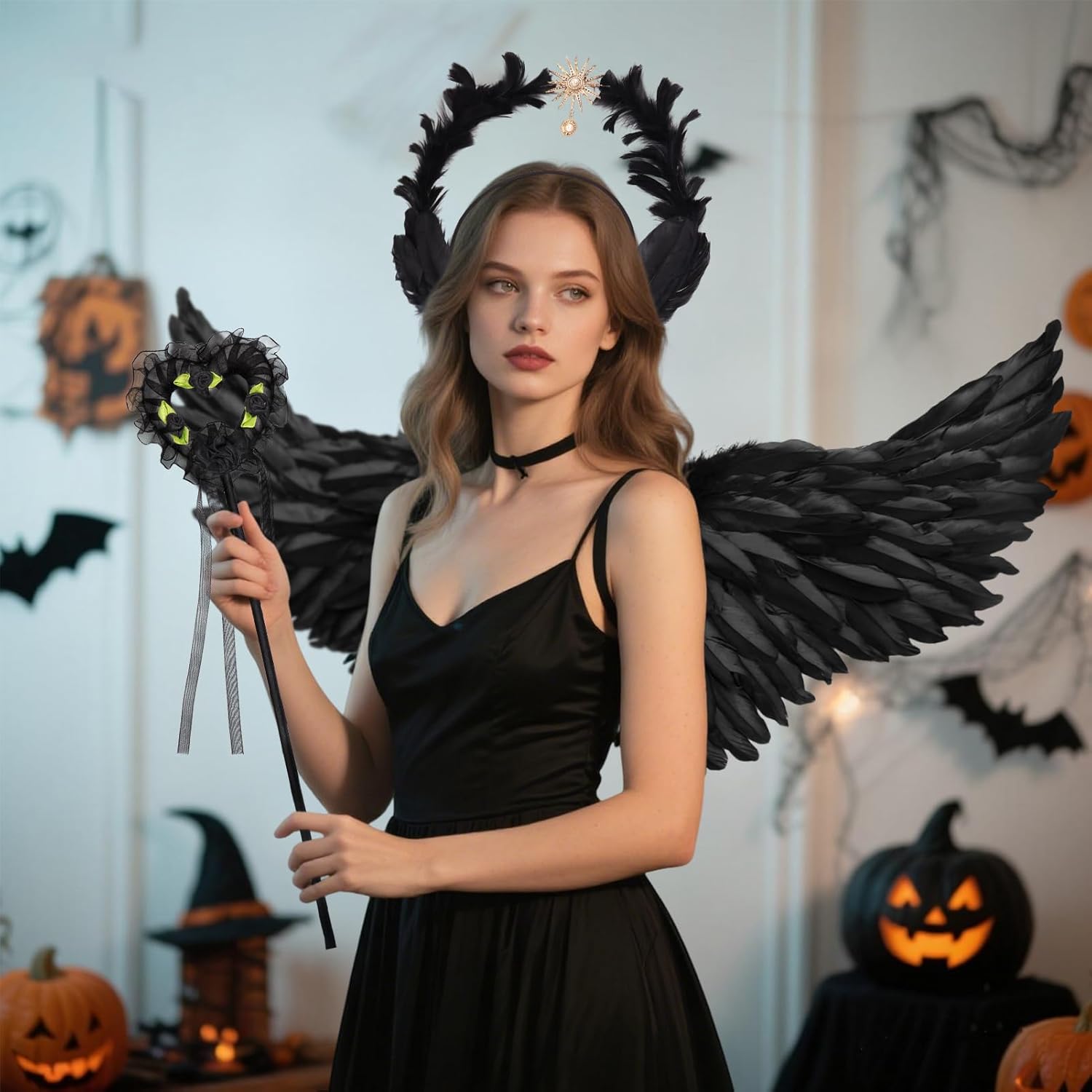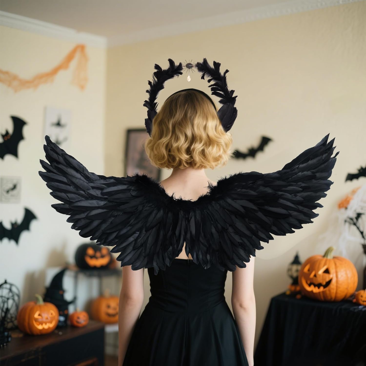 👑 Set costume da angelo: il set angelico divino contiene 1 elegante paio di ali da angelo nere (circa 80 cm x 35 cm), 1 corona da donna Black Swan realizzata a mano con piume e amuleto dorato a forma di sole e 1 bacchetta magica mistica. 🌙 Corona nera reale: copricapo angelico gotico, l'anello esterno è avvolto da morbide piume e presenta un amuleto solare dorato con una perla incastonata per un tocco mitologico elegante e senza tempo. I dettagli curati e il pizzo di perle conferiscono un aspetto lussuoso. 💎Materiali: le ali nere e il copricapo da elfo sono realizzati con piume naturali di alta qualità, il copricapo ha una struttura in metallo robusta ma leggera, ogni pezzo è realizzato con cura per garantire durata e comfort. ✨ Design Angel Wings: ali nere che si dispiegano in un gesto aggraziato e divino, ma catturate nell'eleganza senza tempo di una dea fluttuante, per conferirvi l'aspetto maestoso di una divinità. 🌟Occasioni diverse: trasformati in una dea della mitologia durante il carnevale, le feste di Halloween, gli eventi cosplay, i matrimoni a tema, gli spettacoli teatrali o le feste di compleanno. Il set di costumi da angelo nero attira sicuramente l'attenzione e conferisce alla tua apparizione un'aura magica.