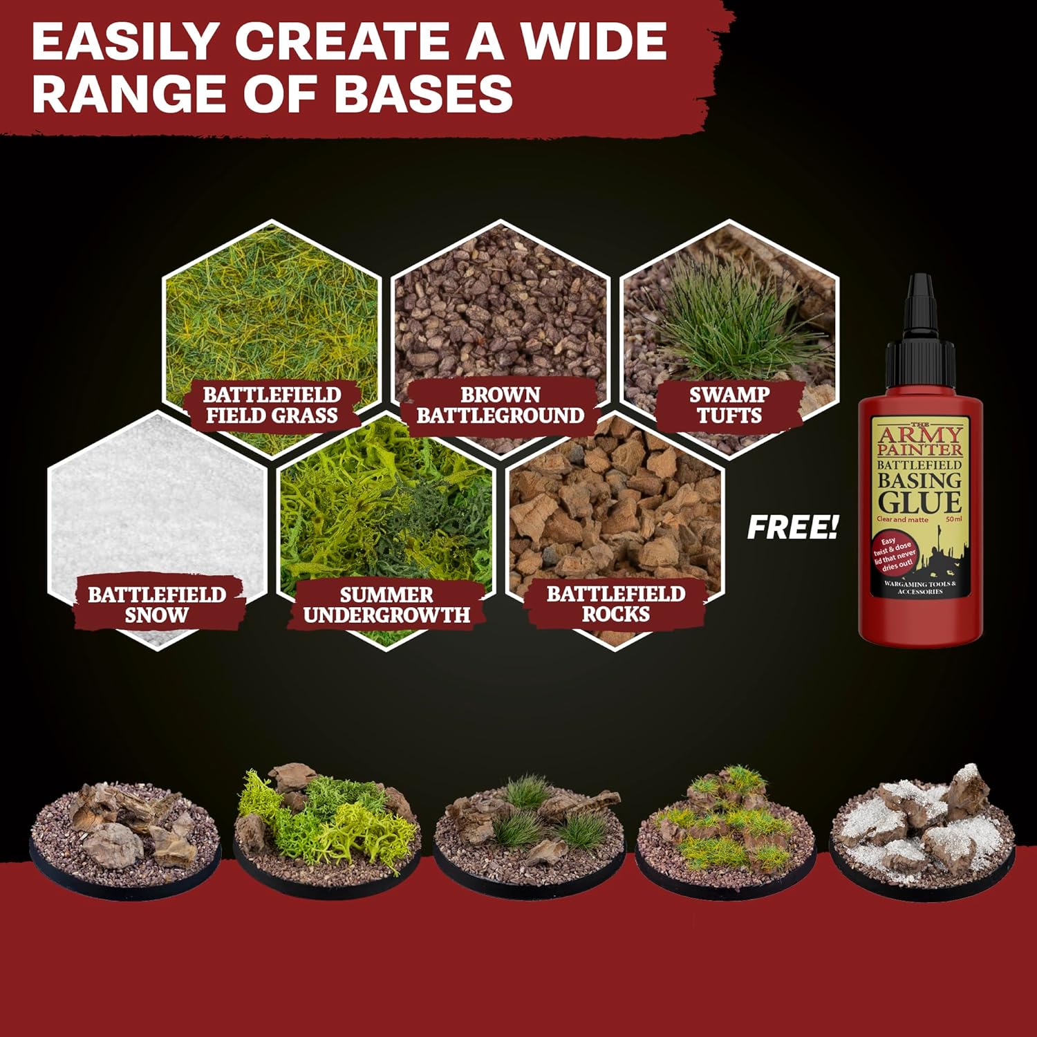 🌳 TUTTI I MATERIALI DI CUI HAI BISOGNO 🌳 - In questo kit di costruzione di modelli per principianti ottieni un'ampia selezione di materiali per i set iniziali di base di Warhammer 40k Battlefield: Battlefield marrone, Battle Rocks, 35 pezzi. Ciuffi di palude autoadesivi, licheni del sottobosco estivo, muschio artificiale/erba statica, neve del campo di battaglia. Anche colla Pva da 50 ml per le tue miniature Dnd. 🏝️ IMPOSTAZIONE BASE IN MINIATURA AL SUO MEGLIO 🏝️ - Ogni materiale base in miniatura in questo set è della ben nota qualità di The Army Painter: Battle Rocks (fatto di sughero naturale), Brown Battlefield (palline di sabbia accuratamente filtrate in tre diverse dimensioni) e Battlefield Snow sono in colori adatti al kit modello Battlefield e sono pronti all'uso. ⛰️ DIVERSI MATERIALI BASE PER QUALSIASI WARGAME O TABLETOP ⛰️ - Non importa su quale tipo di base diorama di wargame, terreno o basi stai lavorando, questo set di effetti paesaggistici per campi di battaglia di Army Painter contiene le forniture appropriate di colla per modelli, ciuffi d'erba, sabbia finta, erba da modellare per set iniziale Dnd o decorazione base Warhammer. ✨ OTTIMO AFFARE, OTTIMO INIZIO ✨ - Questo set di materiali di base in miniatura facile da usare è il regalo tutto in uno perfetto, facendoti risparmiare tempo e denaro. Abbiamo anche incluso una guida alla pittura gratuita per guidarti attraverso ogni passaggio, dalla preparazione alla pittura, alla base e alla finitura delle tue miniature. 🎨NEXT STEP🎨 - Creare una base di battaglia in miniatura è un primo passo cruciale nel mondo dei wargame in miniatura e pone le basi per scontri epici e narrazioni coinvolgenti. Questo processo dà vita ai piccoli guerrieri, aggiungendo profondità, carattere e individualità a ogni figura. I set di colori acrilici Army Painters, come Speedpaint, sono perfetti per dipingere modelli.