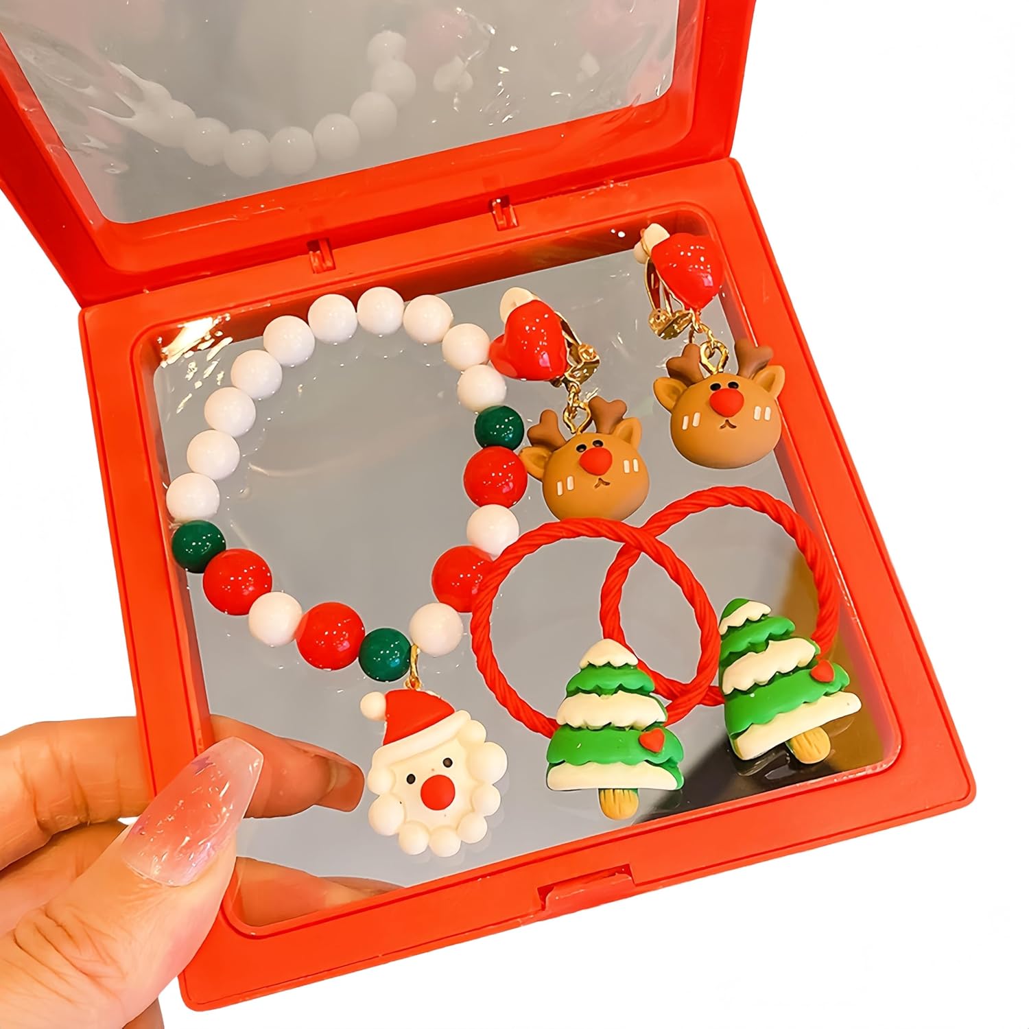 CONTENUTO DEL PACCHETTO: 1 set di gioielli natalizi (1 braccialetto, 2 elastici per capelli, 1 paio di orecchini). Questo set di gioielli festivi include un braccialetto elastico decorato con allegri ciondoli natalizi, abbinato a orecchini coordinati, rendendolo un regalo ideale per donne, bambini, ragazze e ragazzi. ALTA QUALITÀ: Realizzato in plastica, resistente a rotture e sbiadimenti, molto leggero. Non richiede cure delicate. Un accessorio perfetto per completare il tuo look, indispensabile per ogni amante dei gioielli. DESIGN: Questo è un elegante set di braccialetti perfetto per le festività natalizie. Il nostro braccialetto natalizio include ciondoli a tema come Babbo Natale, un albero di Natale, un fiocco, un nastro verde e una renna, decorazioni classiche con un'atmosfera ricca di spirito natalizio. REGALO PERFETTO: Questo set di braccialetti elastici con perline natalizie è il regalo ideale per migliori amici, insegnanti, mamme, mogli, padri e donne in occasione di Natale, compleanni, Festa del Ringraziamento, Capodanno, feste e altri momenti speciali. VERSATILE: Adatto per Natale, matrimoni, compleanni, feste, balli, anniversari, San Valentino, abbigliamento casual e Festa del Ringraziamento. Questi adorabili gioielli natalizi sono fantastici ornamenti da indossare durante feste e riunioni familiari, rendendo i tuoi bambini splendidi e affascinanti.
