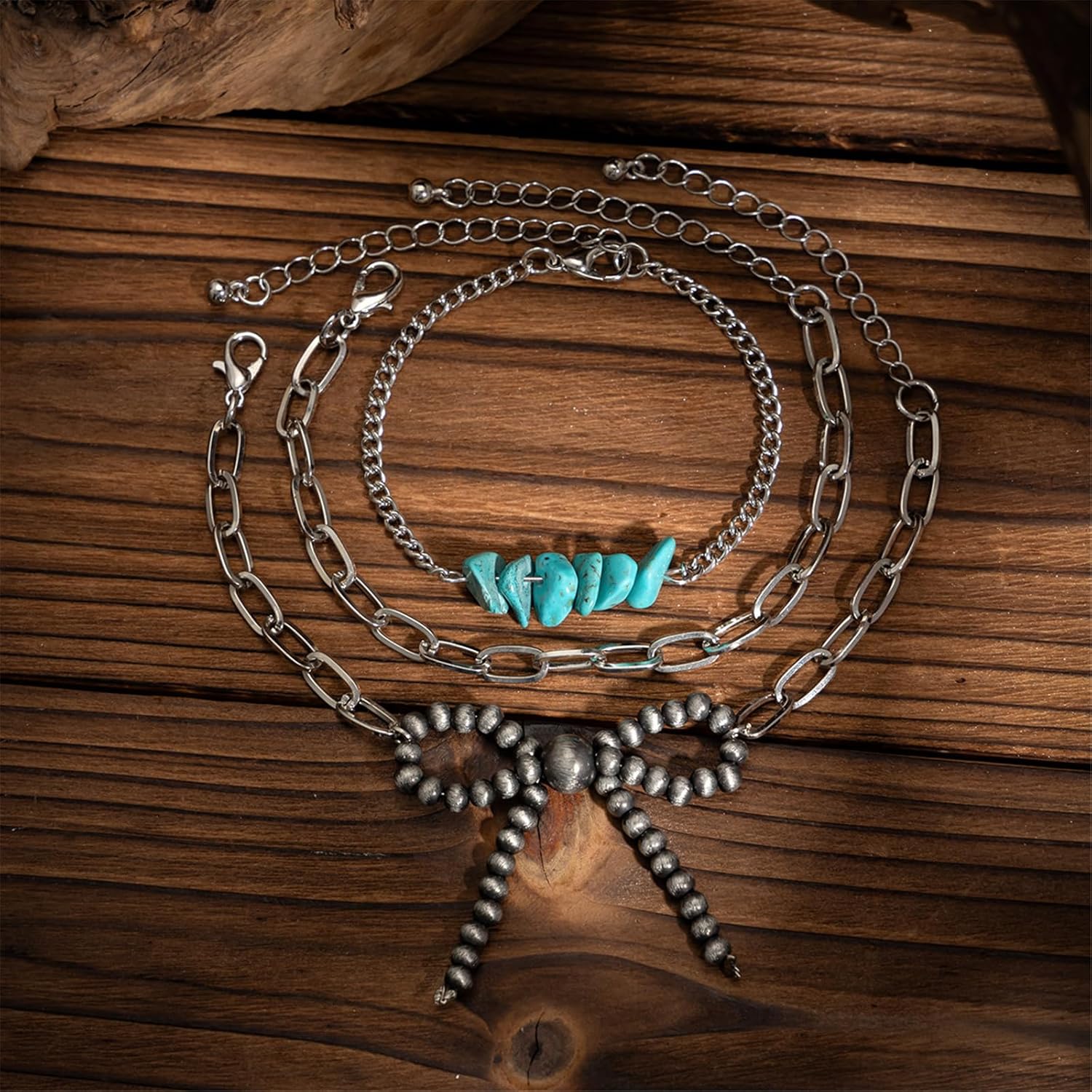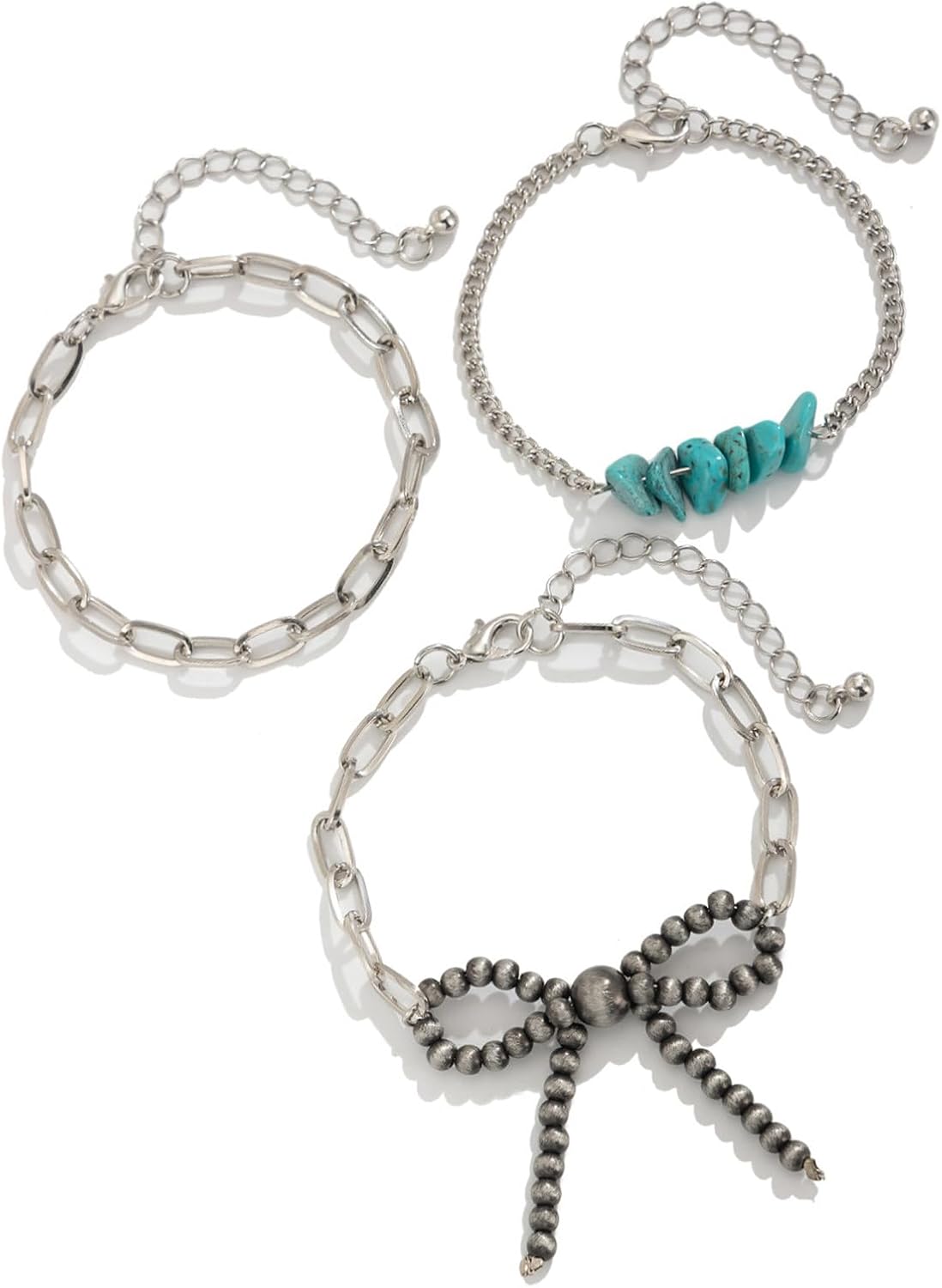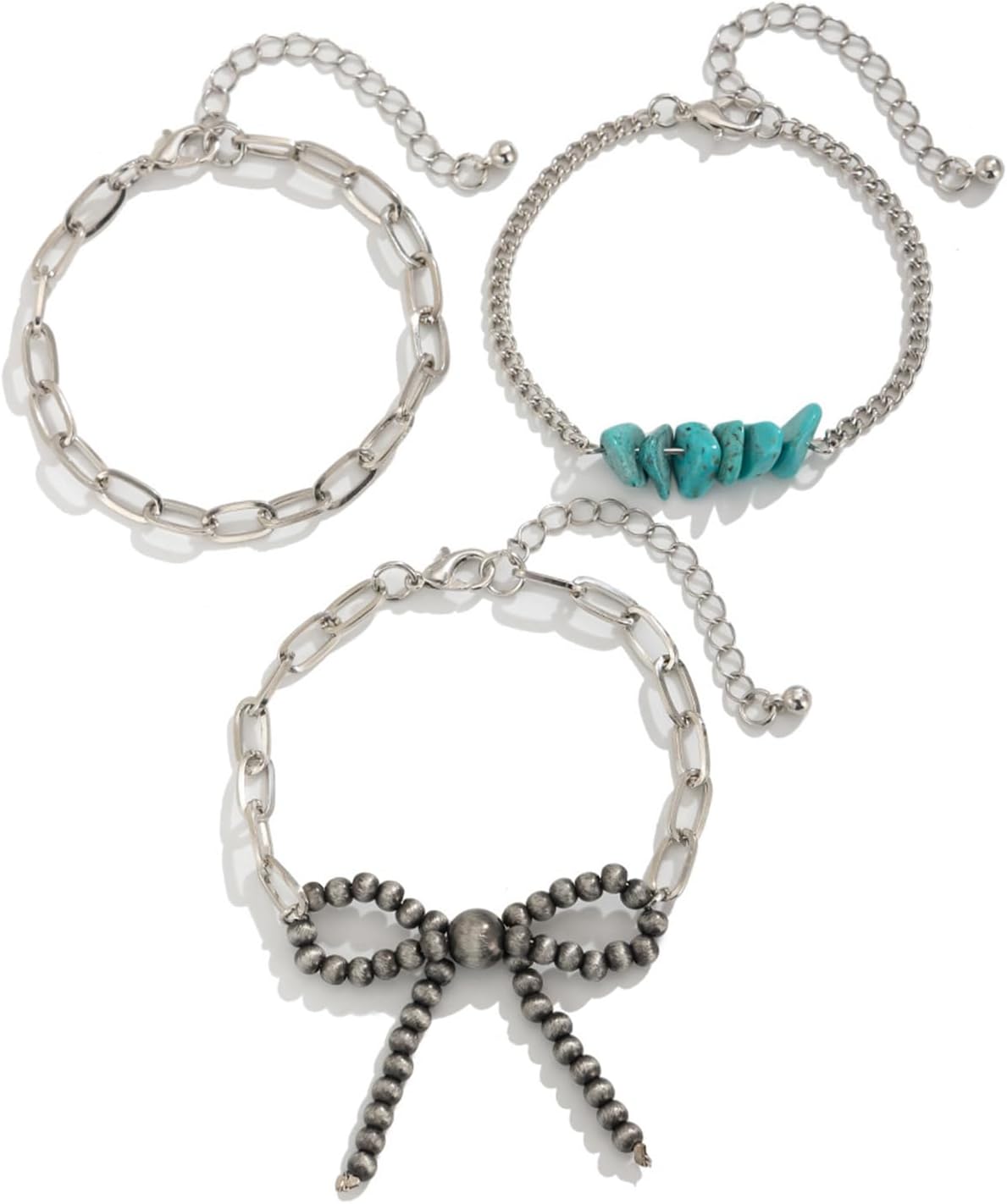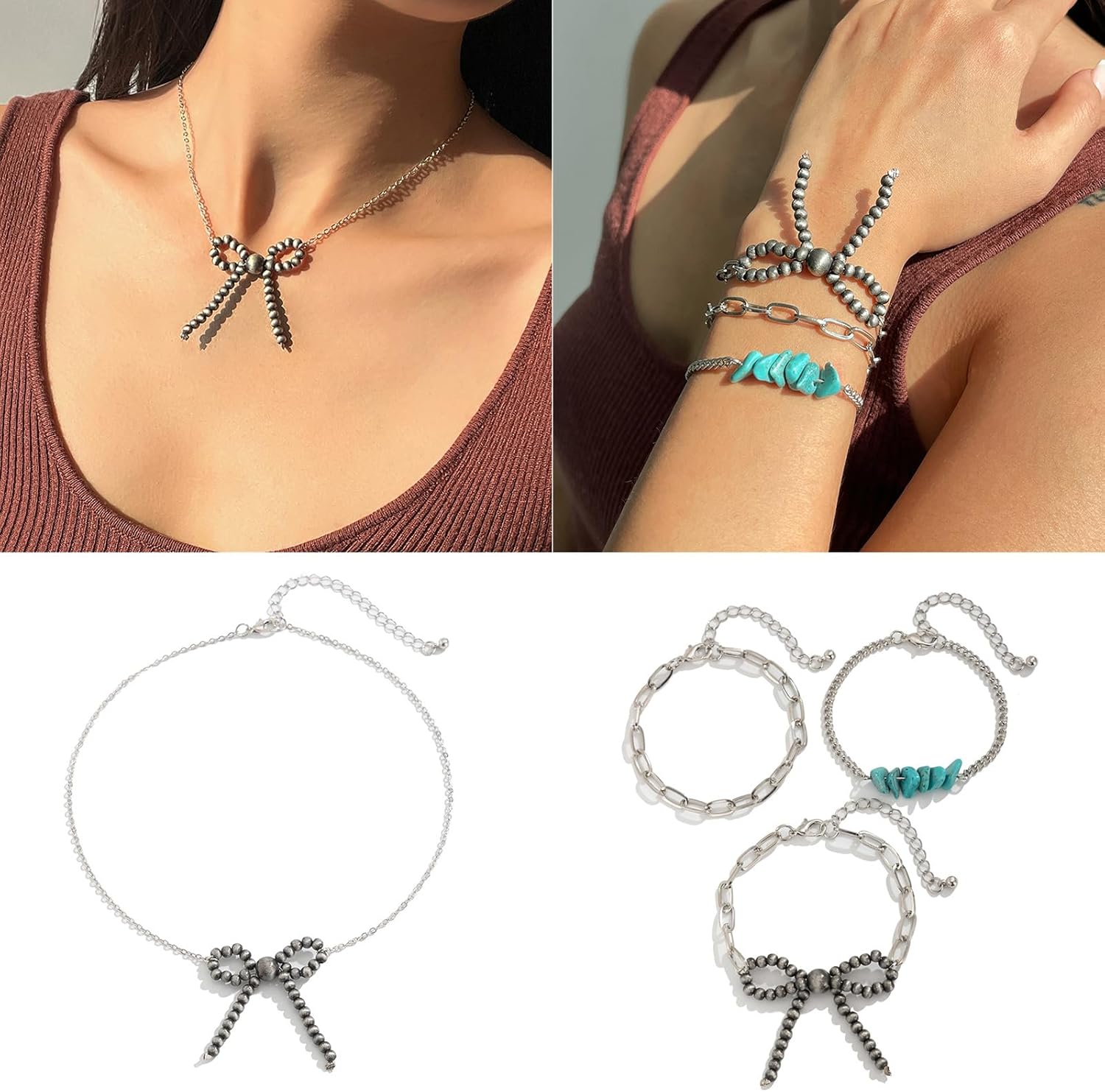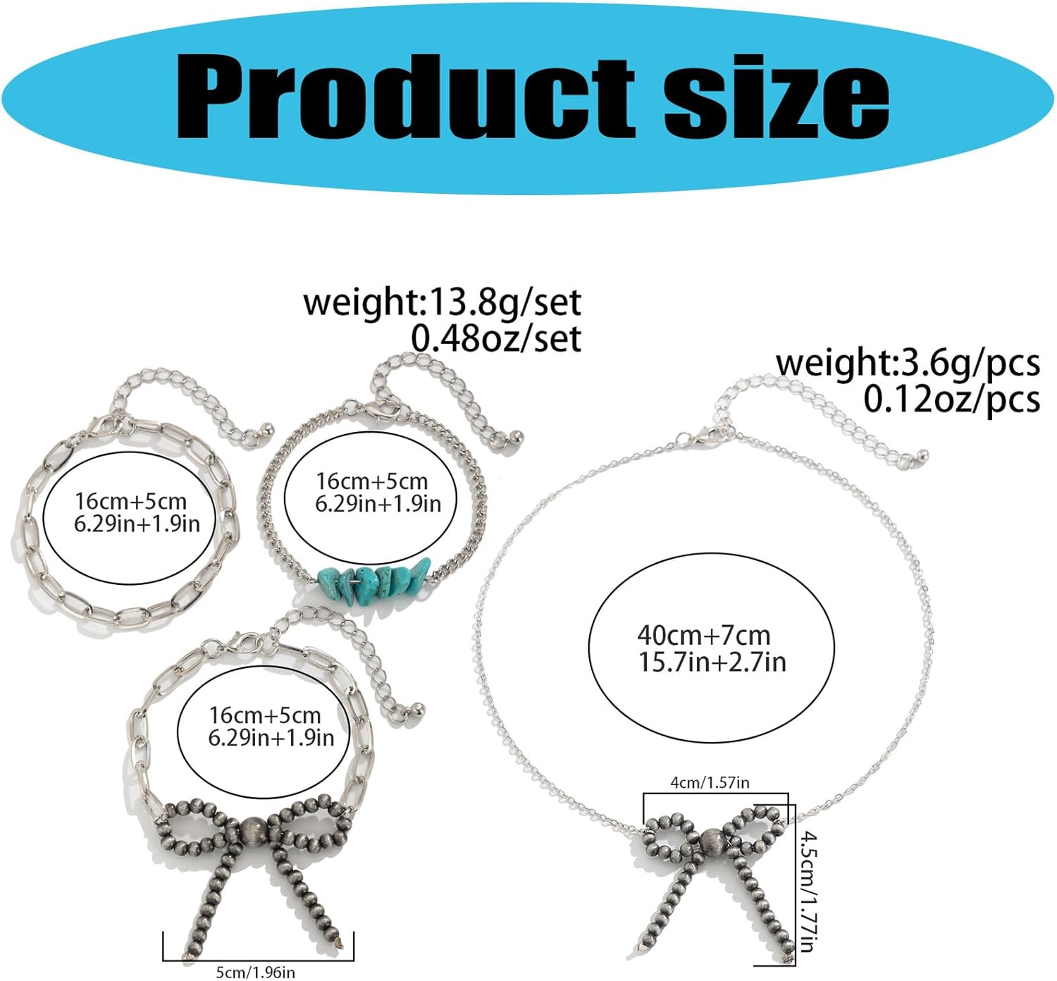 Set bracciali a catena con clavicola regolabile con collana in retrò bowknot, ideali per studenti e individui alla Caratteristiche Migliora tuo stile con set collana/bracciale con ciondolo Bowknot, caratterizzato da un design vintage con fiocco che aggiunge un tocco eleganza e funge da pezzo straordinario in qualsiasi completo Realizzati con catena ferro e turchesi, questi gioielli garantiscono resistenza e lucentezza duratura, con lunghezza regolabile per adattarsi comodamente a dimensioni del collo. Perfetto per donne e studenti alla che cercano esprimere la propria individualità e valorizzare proprio stile individuale attraverso accessori alla Ideale da indossare ogni giorno lavoro, a scuola o agli appuntamenti, così come per occasioni speciali come matrimoni, feste o eventi aggiungendo dolcezza e raffinatezza a qualsiasi outfit. Abbraccia la tendenza degli ultimi stili con questo accessorio versatile, rendendolo un'opzione regalo perfetta per amici, familiari o amanti, simboleggiando cura e affetto. Specifiche: Componente: catena ferro + turchese Dimensioni della collana: 40+7 cm/15,7+2,7 pollici Dimensioni del pendente: 5 cm Dimensioni del set braccialetti: 16+5 cm/6,29+1,9 pollici La confezione include: Set 1 collana con fiocco e 3 bracciali Nota: prega consentire un errore 1-2 cm dovuto alla misurazione manuale. Assicurati che non ti dispiaccia prima un'offerta. A causa della differenza tra i diversi monitor, l'immagine potrebbe non riflettere colore effettivo articolo Grazie!