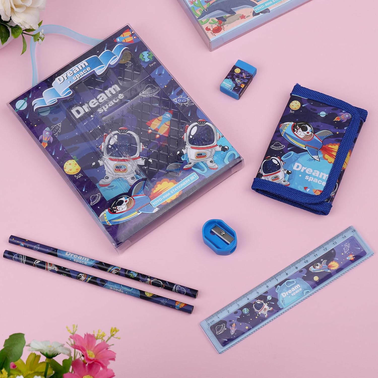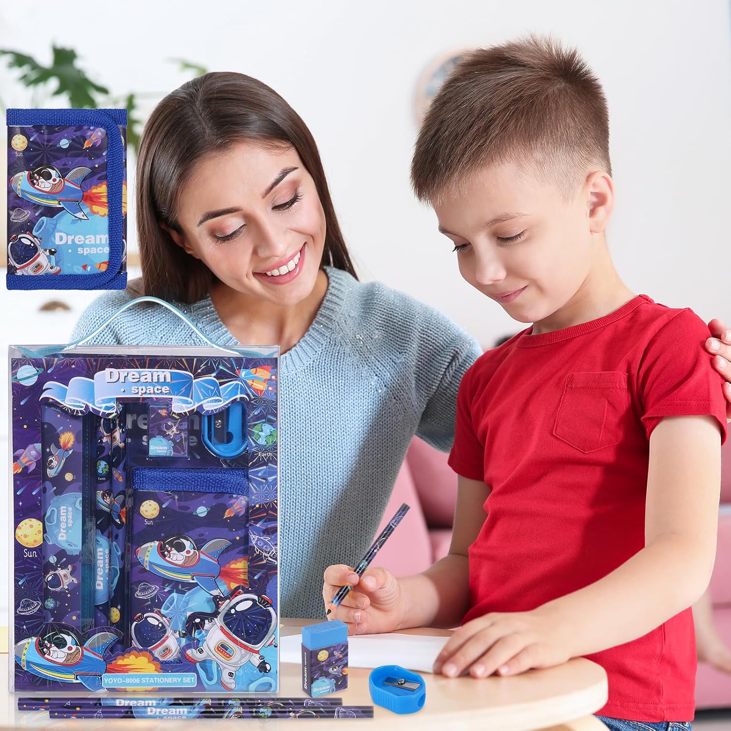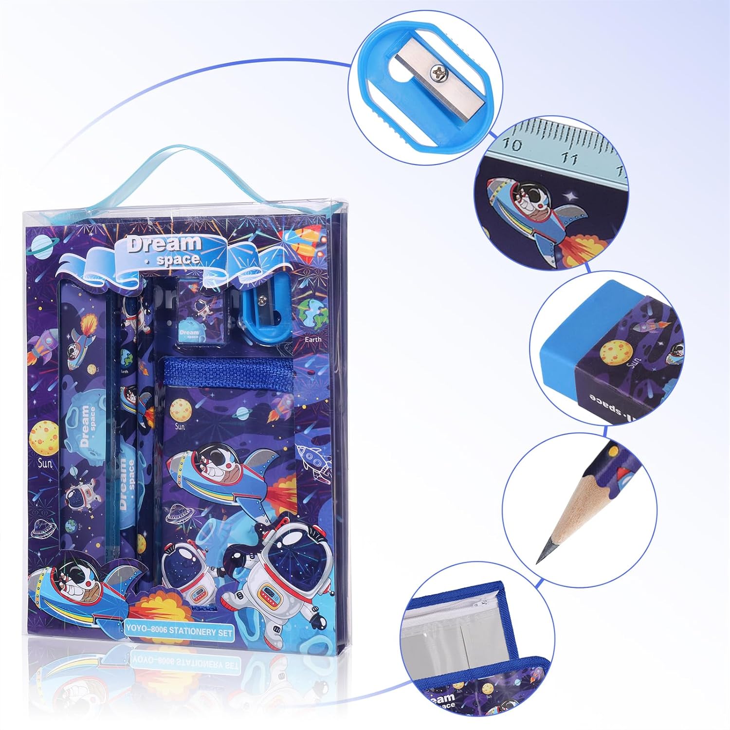【Riceverete】Bella confezione regalo di cancelleria astronauta, che include 1 simpatico portamonete, 2 matite, 1 righello, 1 temperamatite e 1 gomma per le vostre esigenze di apprendimento quotidiano. 【Accrescere l'interesse per l'apprendimento】Il motivo nuovo, il design carino, il bel motivo della cancelleria possono accrescere l'interesse dei bambini per l'apprendimento e dedicare più tempo ad esso. 【Conveniente e pratico】 La matita ha un nucleo di piombo resistente, il temperino è liscio e ruota senza problemi, la gomma ha un forte potere pulente e genera meno detriti. 【Materiale di alta qualità】 Realizzato in materiale PVC non tossico, ecologico, biodegradabile e di alta qualità per garantire sicurezza e durata, nessun odore chimico, non facile da rompere. 【Grande scelta per i regali】Bellissima confezione in una scatola regalo, regalo ideale per i bambini di età compresa tra i 6 e gli 11 anni che stanno imparando a diventare scolari, e anche ideale per occasioni speciali come compleanni, Natale e Capodanno.