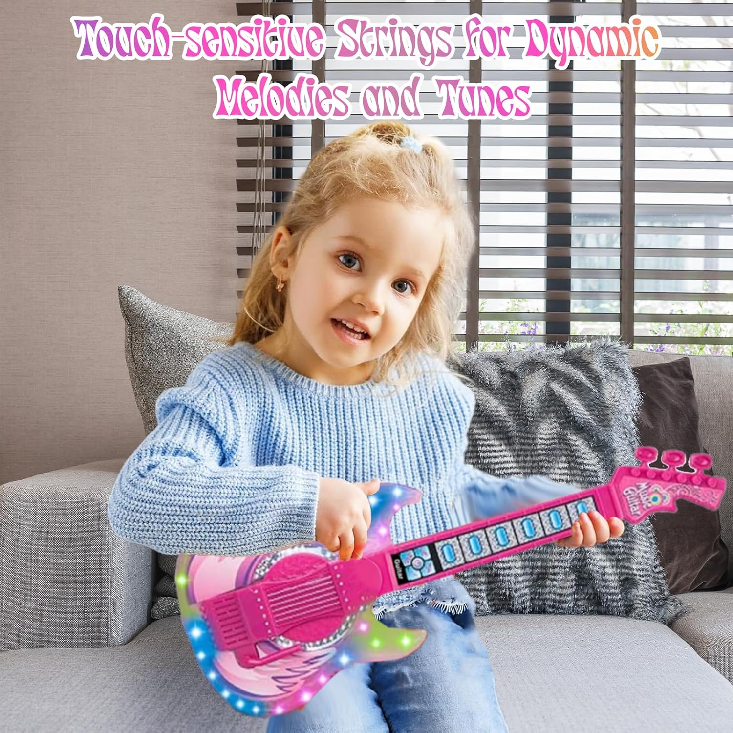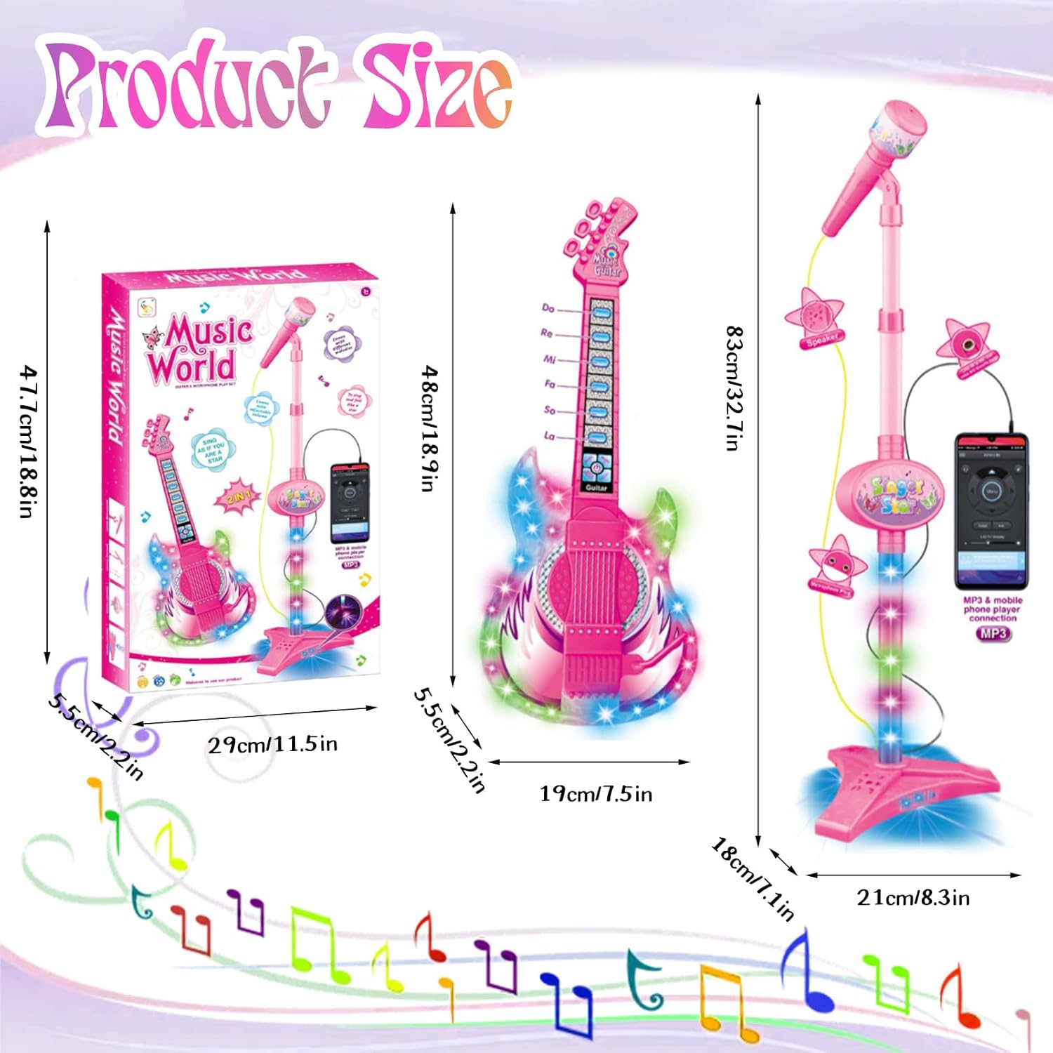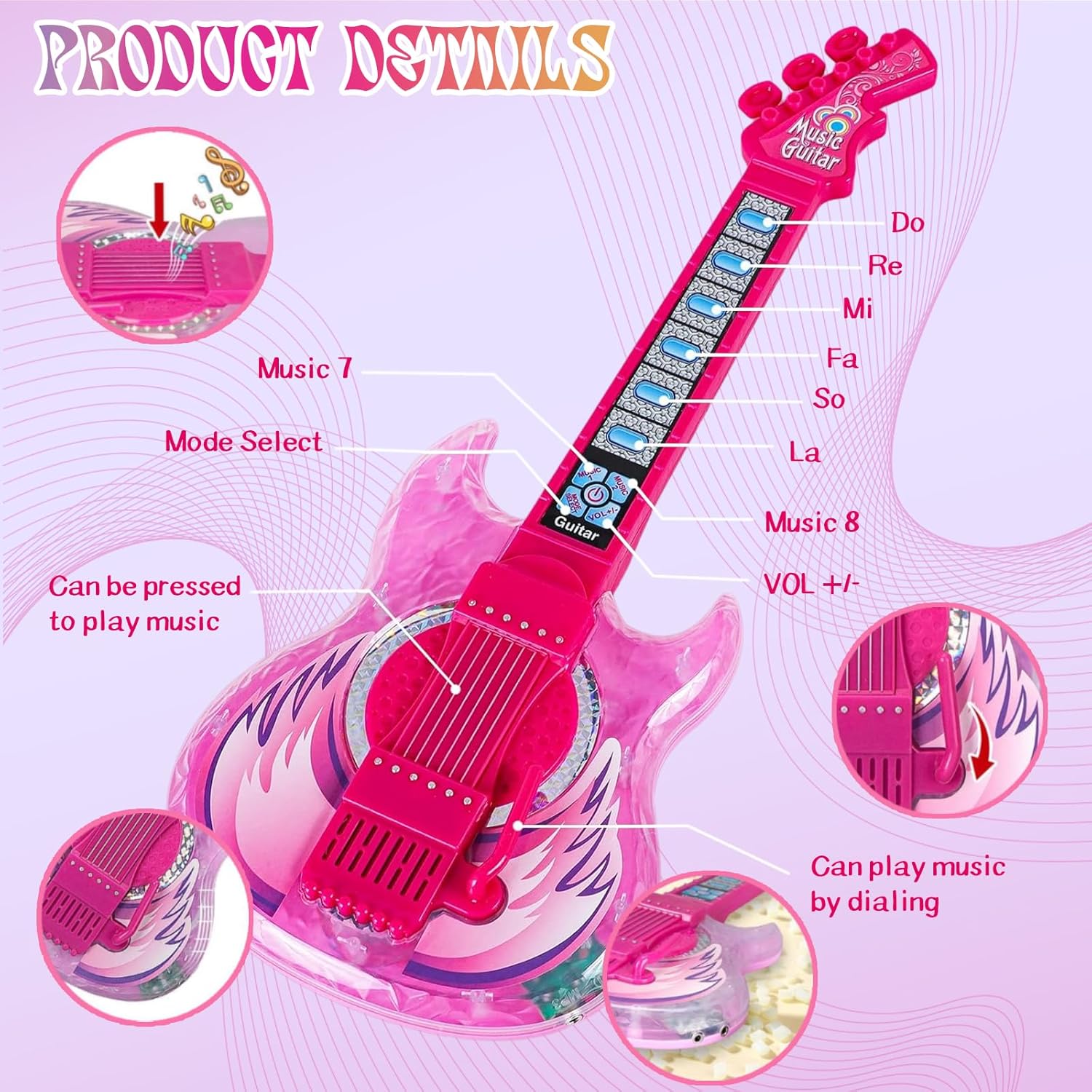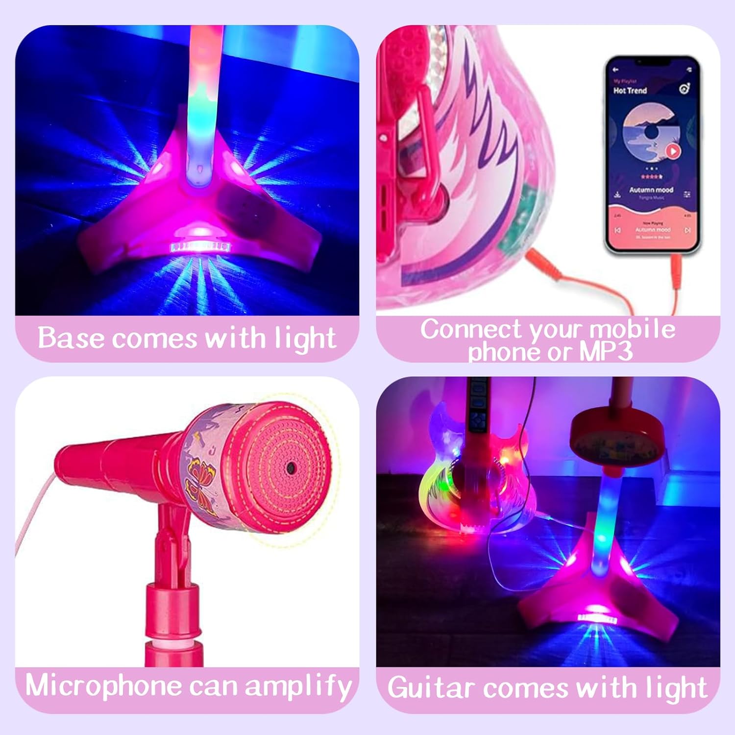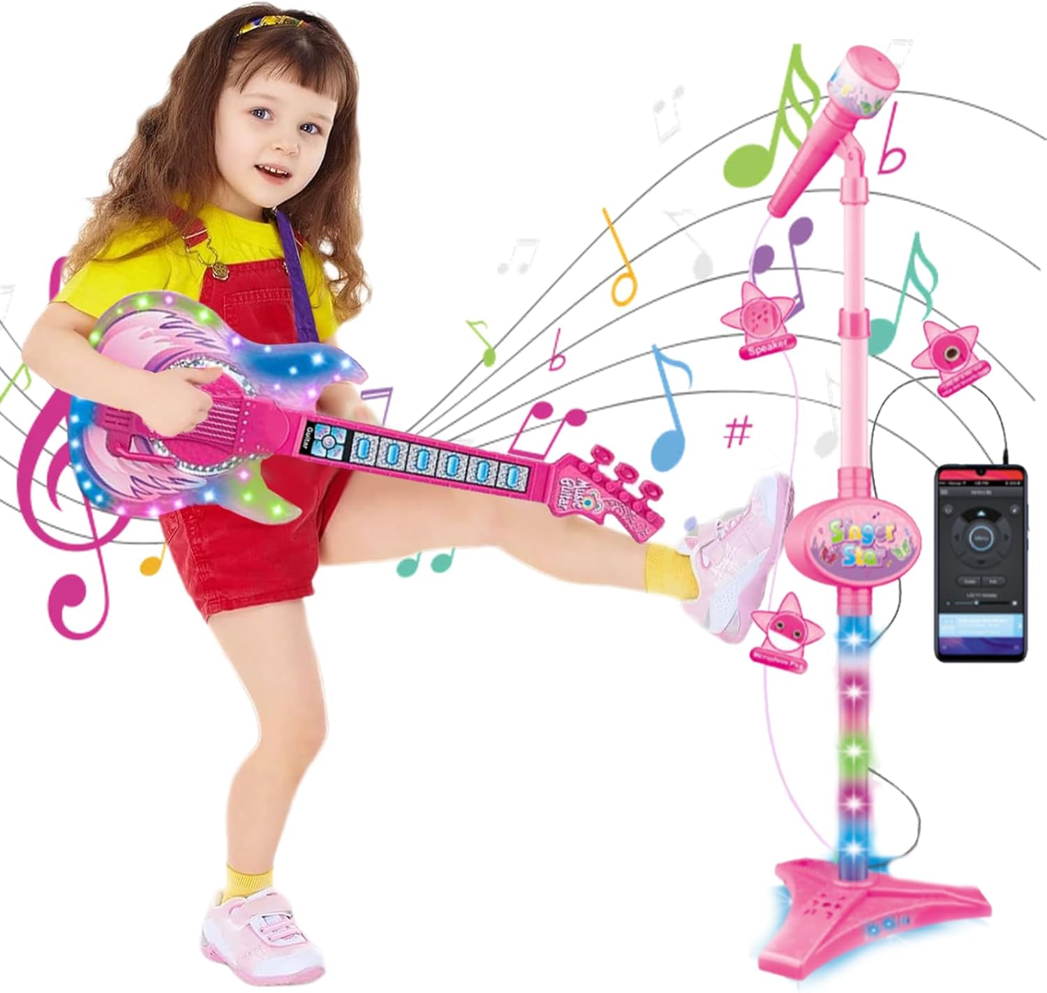 Materiale durevole e robusto: i nostri giocattoli per macchine per karaoke sono realizzati con materiali ABS di alta qualità, resistenti, non tossici, resistenti all'usura e alle cadute. Bordi lisci, non ferire la mano dei bambini durante il gioco. Dimensioni perfette e peso leggero adatti ai bambini da trasportare e giocare. Nota: è un giocattolo per bambini, non uno strumento musicale professionale, non può essere accordato. Forma di chitarra. Giocattoli per l'apprendimento precoce per i più piccoli: la musica gioca un ruolo cruciale nello sviluppo dei bambini. Chitarra elettrica per neonati e bambini piccoli con melodia di filastrocche e luci colorate abbaglianti che accompagna la crescita di ragazze e ragazzi, coltivando l'interesse dei bambini per la musica, aiutandoti a insegnare i ritmi di tuo figlio o altre teorie musicali. Il microfono simulerà scenari di parlato e performance sempre e ovunque, migliorando la fiducia in se stessi e le abilità sociali di tuo figlio. Set di microfoni multifunzionali: migliora le prestazioni di tuo figlio a nuovi livelli con il nostro microfono e chitarra per ragazze. Sia che scelgano di tenerlo in mano o di staccarlo dalla base per uno spettacolo già pronto per il palco, si sentiranno delle vere star. La base può essere facilmente smontata per un comodo trasporto e stoccaggio, consentendo a tuo figlio di mostrare il suo talento ovunque vada. Questo giocattolo musicale canoro è perfetto per suscitare il loro amore per la musica e le performance Set chitarra e microfono per bambini: il set giocattolo per chitarra include una chitarra rosa, un microfono, un supporto regolabile da 45 cm a 90 cm e un cavo di collegamento, e una clip per microfono rotante a 180° fornisce un angolo senza sforzo, lascia che i bambini oscillino come una vera superstar e soddisfino il loro desiderio di suonare, perfetto per i principianti che vogliono imparare a suonare la chitarra. Può collegare il tuo MP3 o cellulare tramite il cavo ausiliario incluso per riprodurre la tua musica. Cantare non è mai stato così divertente. Regalo ideale per ragazze e ragazzi: la chitarra elettrica è perfetta per i più piccoli come regalo per i piccoli musicisti per contribuire ad aumentare l'interesse dei bambini per la musica e il senso musicale e aumentare il loro livello di attenzione e le loro capacità creative. Perfetto per gare di karaoke in famiglia, feste di compleanno e occasioni speciali. Il tuo piccolo musicista si innamorerà di questo giocattolo per karaoke e si godrà il suo felice momento musicale
