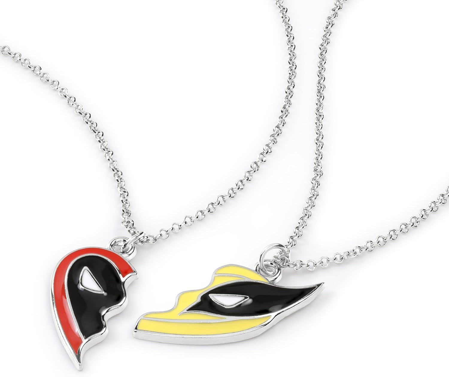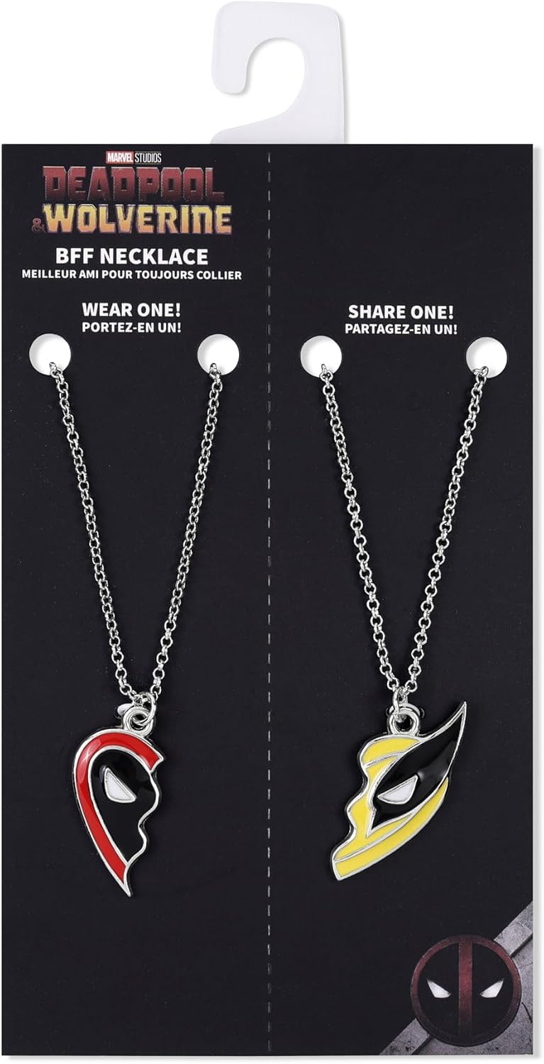 Set di collane con ciondolo a cuore diviso BFF di Deadpool e Wolverine Metti le mani su queste splendide collane con ciondolo di Deadpool e Wolverine ispirate al film Deadpool e Wolverine e mostra il tuo amore per questo leggendario duo di supereroi. Un must per ogni fan della Marvel. Caratterizzato da un cuore che si divide in due disegni rifiniti con una chiusura a moschettone. Viene fornito nella confezione ufficiale Marvel.