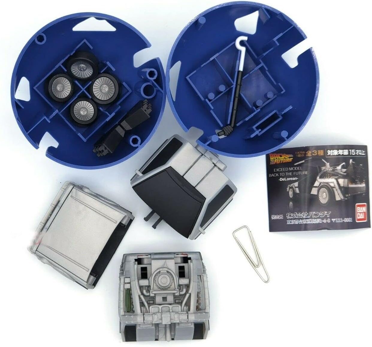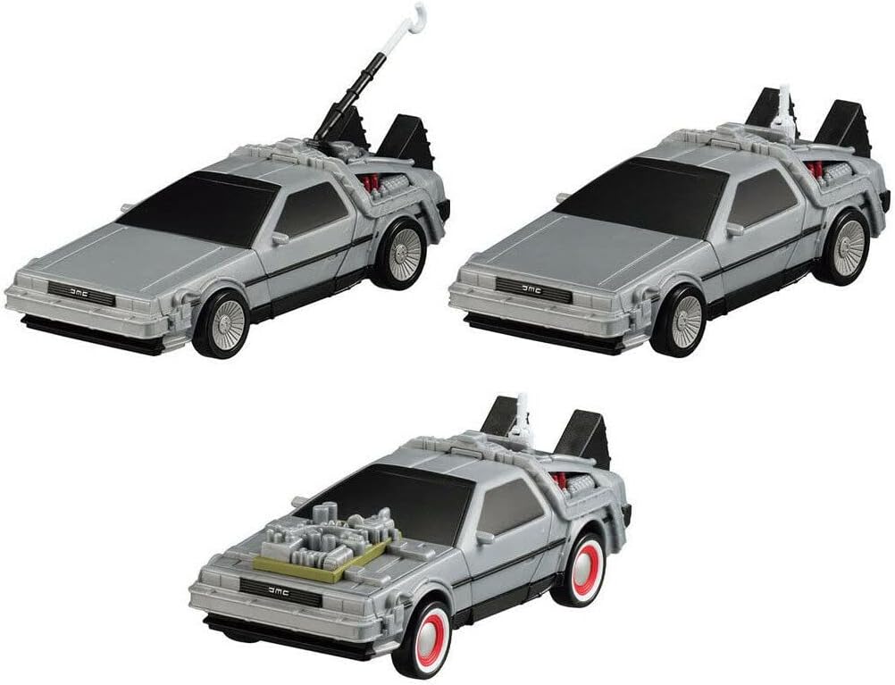 SERIE COMPLETA - 3 diversi modellini della mitica auto DELOREAN Le 3 diverse versione della vettura dai film Ritorno al Futuro Parte 1 2 e 3 Lunghezza auto circa 10cm Si tratta di modellini / figure "gashapon" da collezione Pochi pezzi da unire a incastro (senza colla) - 100% ORIGINALI BANDAI GIAPPONE