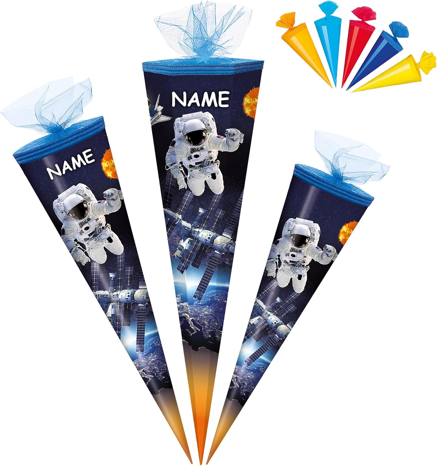 fantastico set _____ con bellissimo effetto 3D - stampa GLITTER e mica!! ____ stabile e di alta qualità - cono scolastico - lungo 50 cm (misurato solo il cartone) ____ il bordo superiore ha una finitura in tulle - forma: ROTONDO ___ motivo: "Astronauta e stazione spaziale - Spazio" + 5 coni scolastici extra in un colorato mix di colori da appendere o decorare .... (ciascuno alto 12 cm - solo il cartone misurato) l'OCCHIO: ______ il tuo cono scolastico individuale ___ incl. abbinando un grande effetto 3D _ fiocco - con il nome desiderato - il nome sarà fatto su misura! ___ il nome verrà richiesto - AUTOMATICAMENTE entro 4 ore - NON inviare alcun messaggio in anticipo ___ Il nome verrà attaccato al fiocco E al cono della scuola! ___ la richiesta del nome viene effettuata - AUTOMATICAMENTE entro 4 ore - per favore NON inviare un messaggio in anticipo ___ i modelli di fiocco vengono consegnati misti / selezioneremo un bellissimo fiocco con effetto 3D abbinato per il tuo cono scolastico (puoi vedere esempi nelle immagini) Scelta della taglia: 50 / 70 / 85 cm _____ made in Germany! __ Materiale: cartone rivestito e di alta qualità - SUPER stabile! - idrorepellente! __ fantastici colori di stampa!_____ OPZIONALE è disponibile una punta in plastica abbinata, trasparente e solida da attaccare (questo rende la punta del cono della scuola molto stabile e solida) ---- (questo articolo deve essere ordinato EXTRA al cono della scuola) come idea: un fiocco personalizzato con il vostro primo NOME DESIDERATO - aggiungete semplicemente l'articolo "Fiocco con il nome desiderato" nel carrello come extra, il nome verrà poi realizzato in modo adatto al fiocco