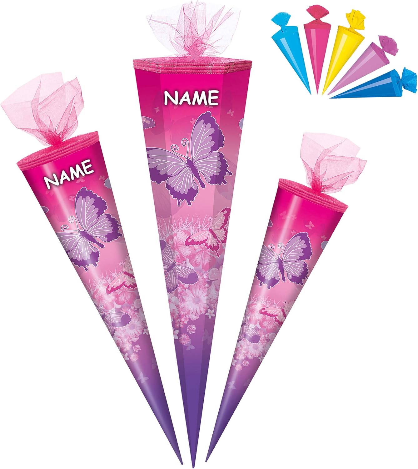 fantastico set _____ con bellissimo effetto 3D - stampa GLITTER e mica!! ____ stabile e di alta qualità - cono scolastico - lungo 50 cm (misurato solo il cartone) ____ il bordo superiore ha una finitura in tulle - forma: ROTONDO ___ motivo: "farfalle e fiori - rosa - rosa" + 5 coni scolastici extra in un colorato mix di colori da appendere o decorare effetto 3D _ fiocco - con il nome desiderato - il nome verrà personalizzato! ___ il nome verrà richiesto - AUTOMATICAMENTE entro 4 ore - NON inviare alcun messaggio in anticipo ___ Il nome verrà attaccato al fiocco E al cono della scuola! ___ la richiesta del nome viene effettuata - AUTOMATICAMENTE entro 4 ore - per favore NON inviare un messaggio in anticipo ___ i modelli di fiocco vengono consegnati misti / selezioneremo un bellissimo fiocco con effetto 3D abbinato per il tuo cono scolastico (puoi vedere esempi nelle immagini) Scelta della taglia: 50 / 70 / 85 cm _____ made in Germany! __ Materiale: cartone rivestito e di alta qualità - SUPER stabile! - idrorepellente! __ fantastici colori di stampa!_____ OPZIONALE è disponibile una punta in plastica abbinata, trasparente e solida da attaccare (questo rende la punta del cono della scuola molto stabile e solida) ---- (questo articolo deve essere ordinato EXTRA al cono della scuola) come idea: un fiocco personalizzato con il vostro primo NOME DESIDERATO - aggiungete semplicemente l'articolo "Fiocco con il nome desiderato" nel carrello come extra, il nome verrà poi realizzato in modo adatto al fiocco