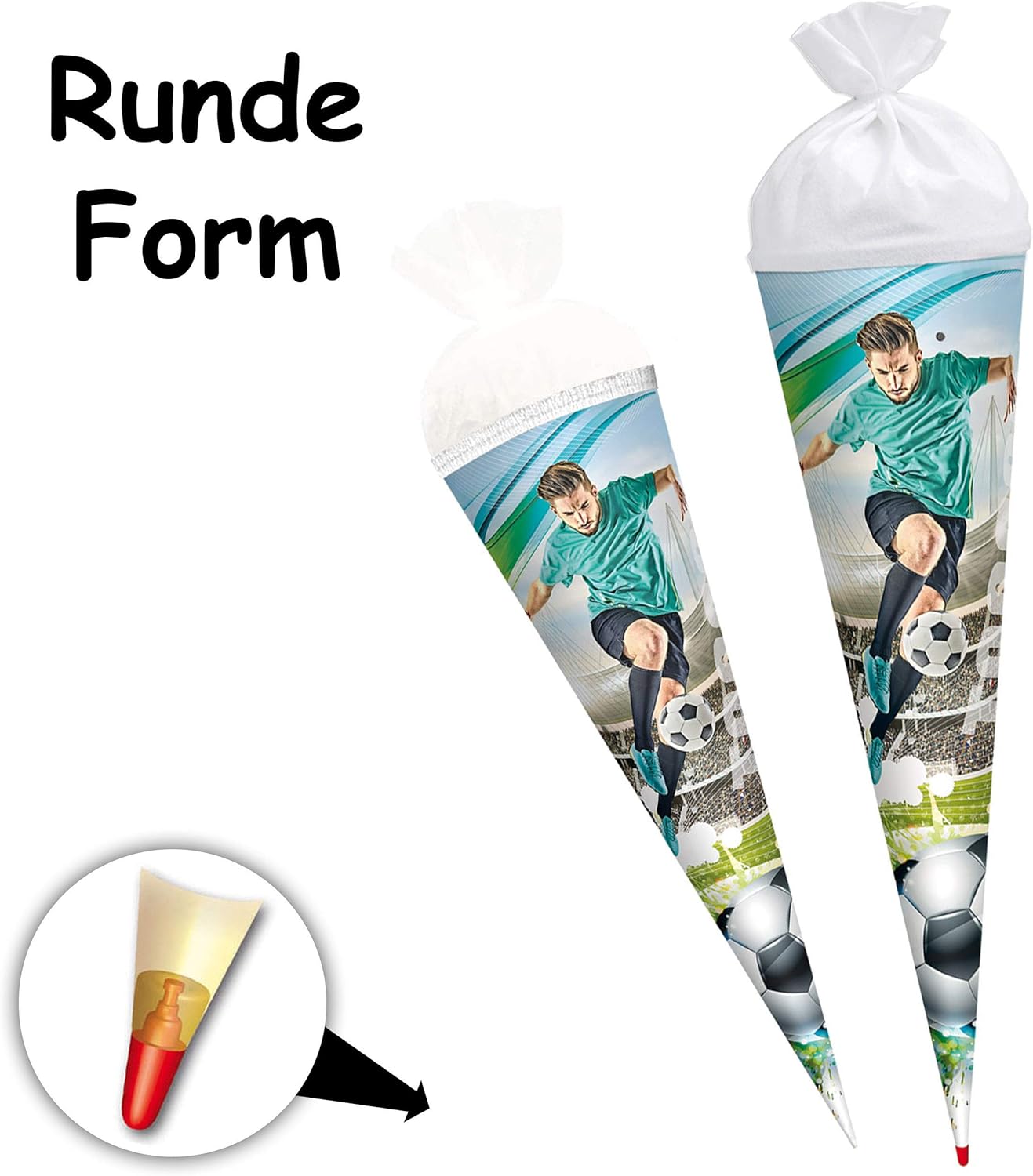 | Material | hochwertiger & beschichteter Karton - SUPER Stabil ! - wasserabweisender Druck __ tolle Druckfarben ! __ mit Tüllabschluß, edlem Organza-Netz oder Filzabschluß / Form: RUND oder - 6 ECKIG ___ je nach Wunsch - mit / ohne - coolem SOUND Effekt ! ( bei Knopfdruck ertönen tolle Fußball Geräusche - z.B. "TOOORRR" & Jubel __ für gewisse Zeit ) !! __ 70er und 85er Schultüten haben eine fest eingearbeitete, langlebige & sehr stabile Holzspitze ( original von Roth ) __ hergestellt in Deutschland ! |