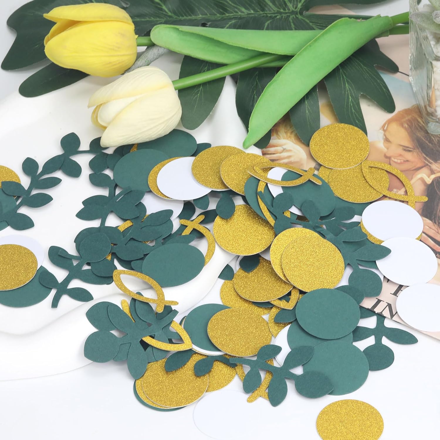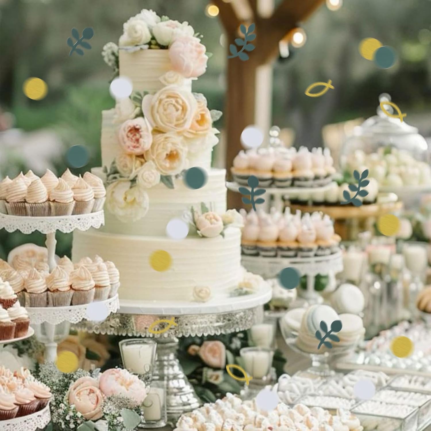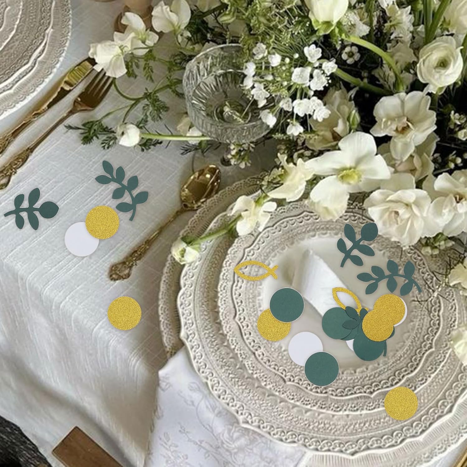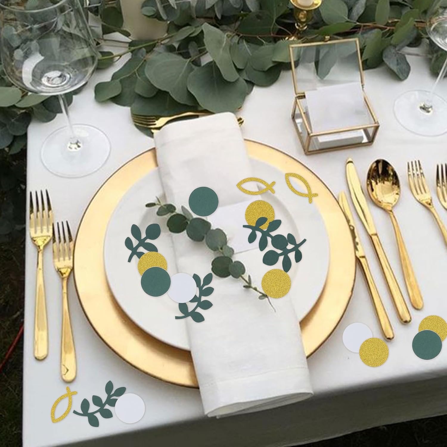 Lavorazione premium: i coriandoli AstraGlam sono realizzati in PVC di alta qualità e materiale cartaceo riutilizzabile, sicuro e inodore. Questi materiali garantiscono durata e consentono molteplici usi. Ideale per organizzatori di eventi e host che cercano una soluzione di decorazione sostenibile. Con questi coriandoli contribuisci anche alla responsabilità ecologica e presenti un ambiente elegante. Design elegante: dai alla tua celebrazione un tocco speciale con il design unico dei nostri coriandoli. Il design in eucalipto combinato con pesci dorati e motivi a pois aggiunge un tocco di raffinatezza ed eleganza. Questa combinazione è particolarmente decorativa e fa risplendere ogni battesimo, cresima o comunione di un bagliore festoso che stupirà gli ospiti. Applicabilità versatile: i nostri coriandoli non sono destinati solo alla decorazione della tavola. Usalo per biglietti d'invito, sacchetti regalo, tovaglie e persino decorazioni per confezioni di cupcake. Questa versatilità rende i coriandoli AstraGlam un'aggiunta straordinaria a qualsiasi celebrazione, che si tratti di comunione, cresima o battesimo, e consente idee di decorazione creative. Perfetto per occasioni speciali: questo set di decorazioni è ideale per comunioni, cresime e battesimi, sia per ragazze che per ragazzi. Dà alle celebrazioni un'atmosfera festosa e contribuisce a creare un'atmosfera speciale dell'occasione. Che si tratti di una piccola riunione o di una grande riunione di famiglia, i coriandoli AstraGlam miglioreranno qualsiasi evento. Confezione ampia: il set contiene 100 pezzi di coriandoli con una varietà di disegni tra cui motivi di eucalipto verde salvia e pesci rossi che si coordinano perfettamente. Questa variegata selezione rende facile creare una decorazione da tavola armoniosa che attiri l'attenzione di tutti. Perfetto per creare un'esperienza indimenticabile