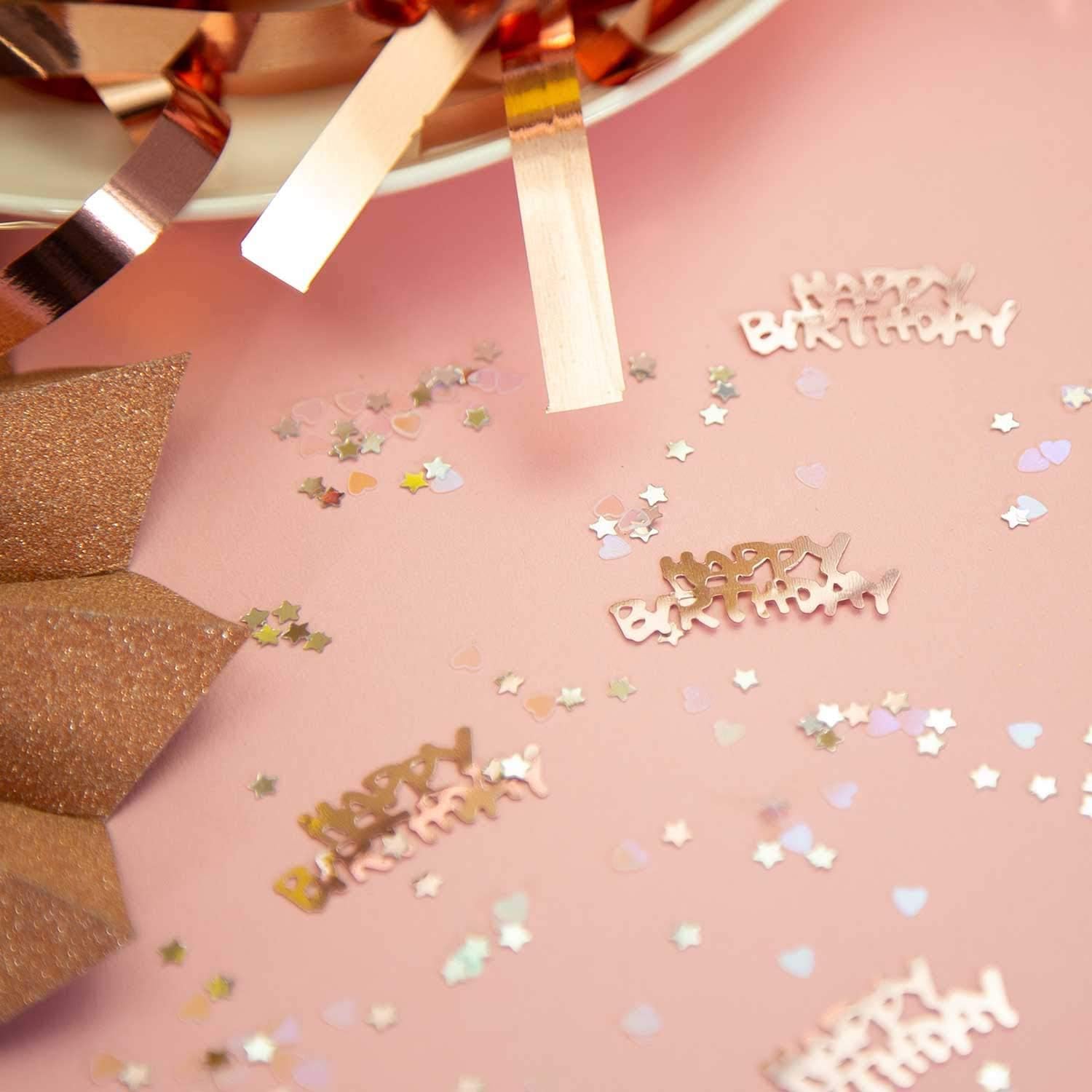 Quantità: ca. 500 pezzi di bellissimi coriandoli che riflettono la luce, composti dalle parole Happy Birthday, stelle e cuori. Colore: oro rosa; Materiale: plastica I coriandoli Happy Birthday misurano 3,5 x 1,4 cm, i cuori e le stelle misurano ca. 5 mm di dimensione. Ideale come decorazione da tavola per compleanni e compleanni dei bambini: questi eleganti coriandoli sono ideali anche come decorazione regalo