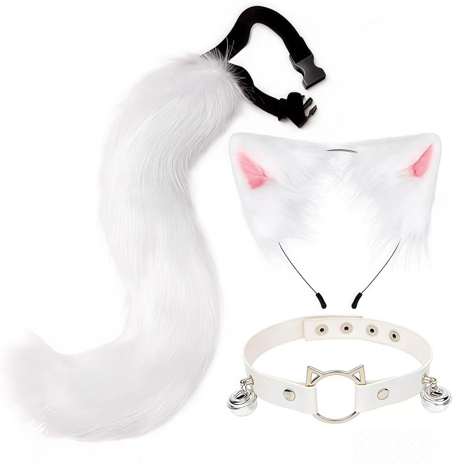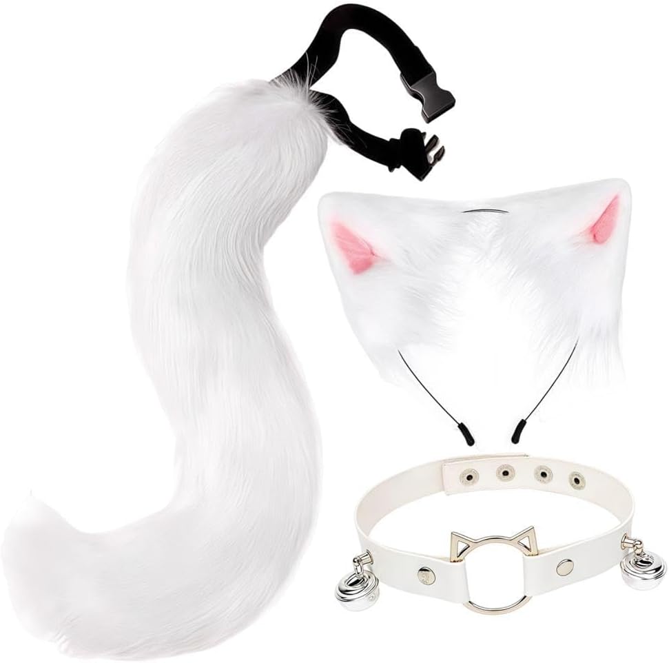 Set Costume Cosplay Gatto con Orecchie e Coda per Spettacoli Teatrali e Travestimenti- Bianco