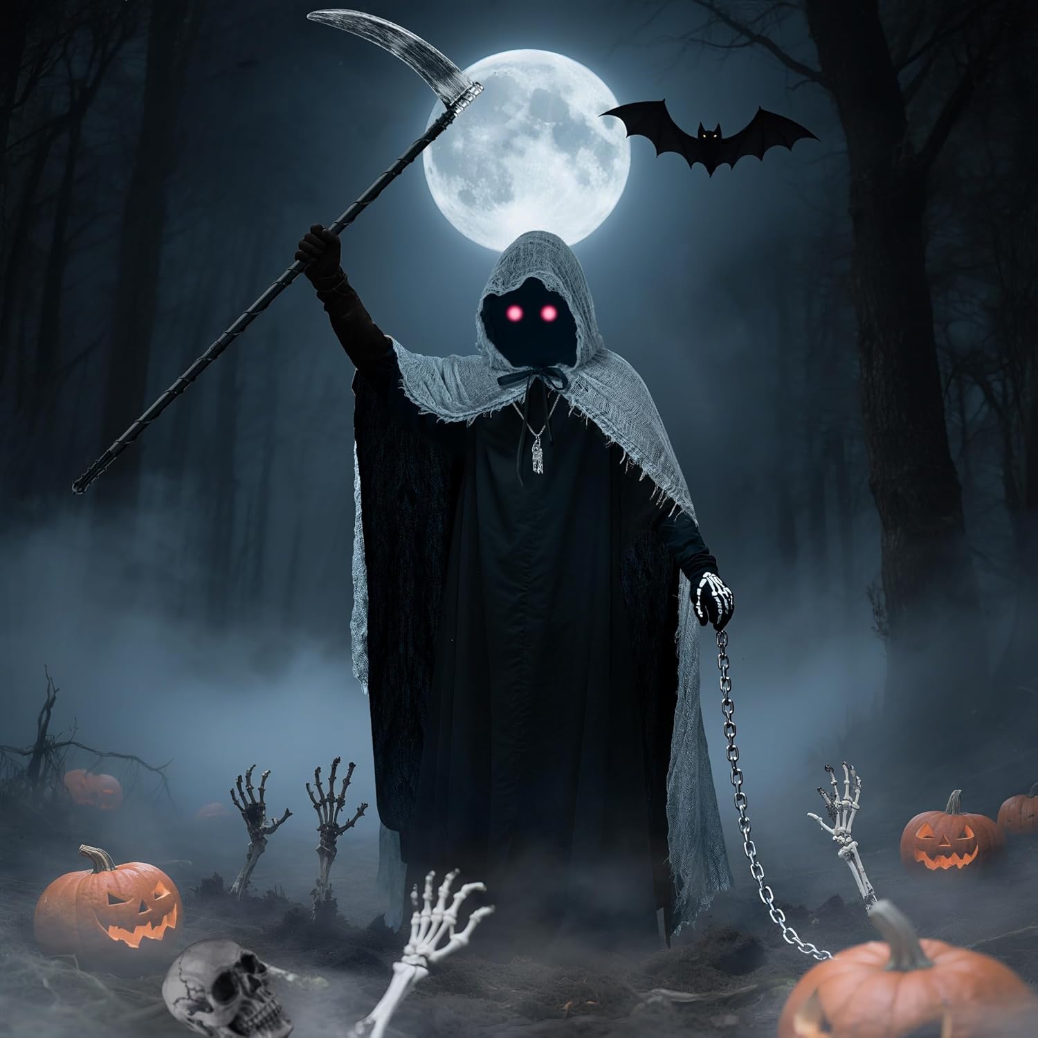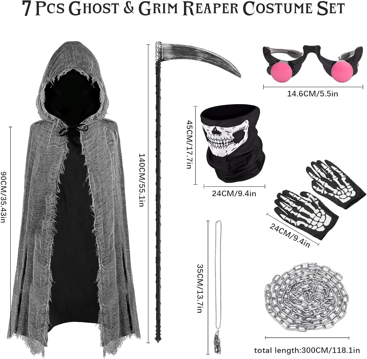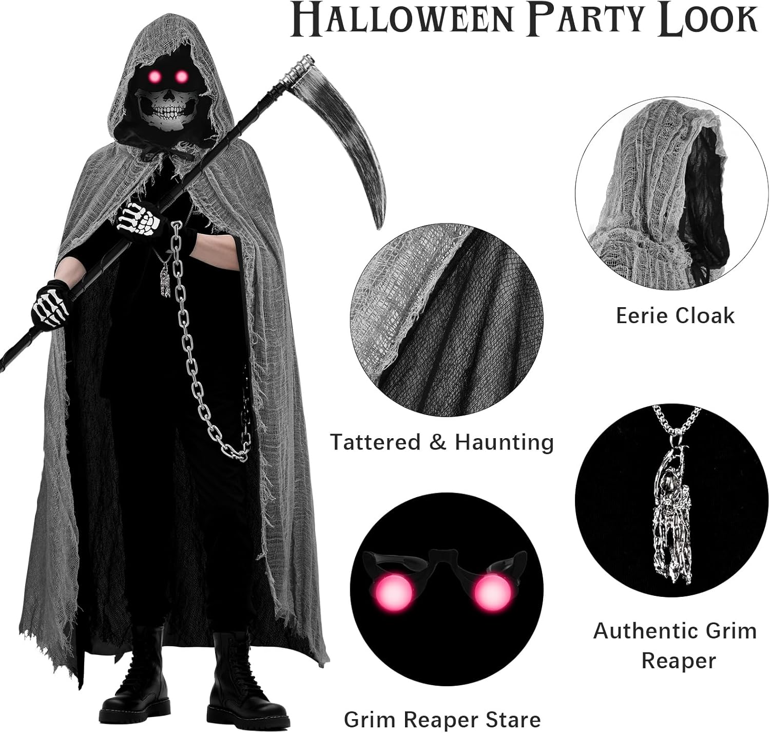Set costume spaventoso Tristo Mietitore - Mantello del Fantasma Mietitore con maschera, falce, catena, occhiali rossi e guanti, Costume di Halloween per bambini e adulti, Costume horror Tristo Mietitore