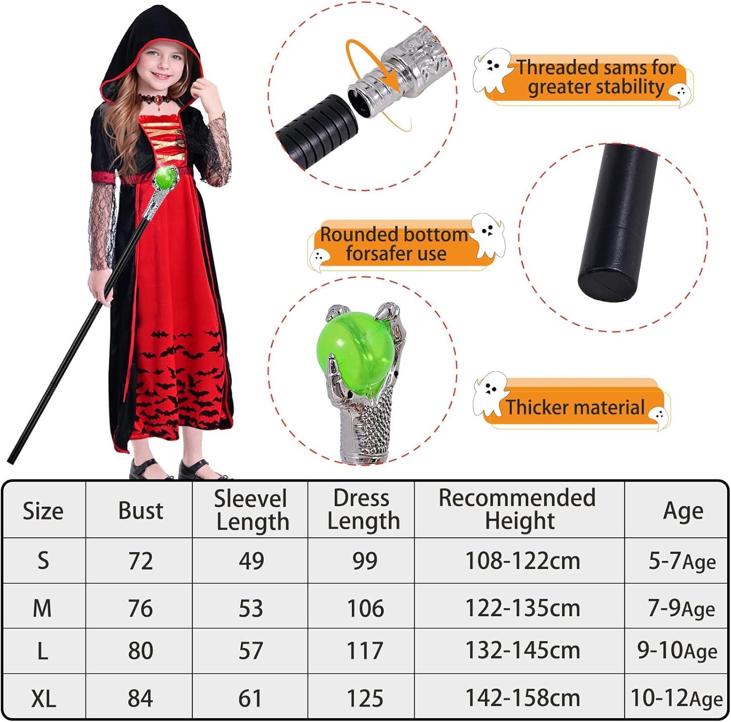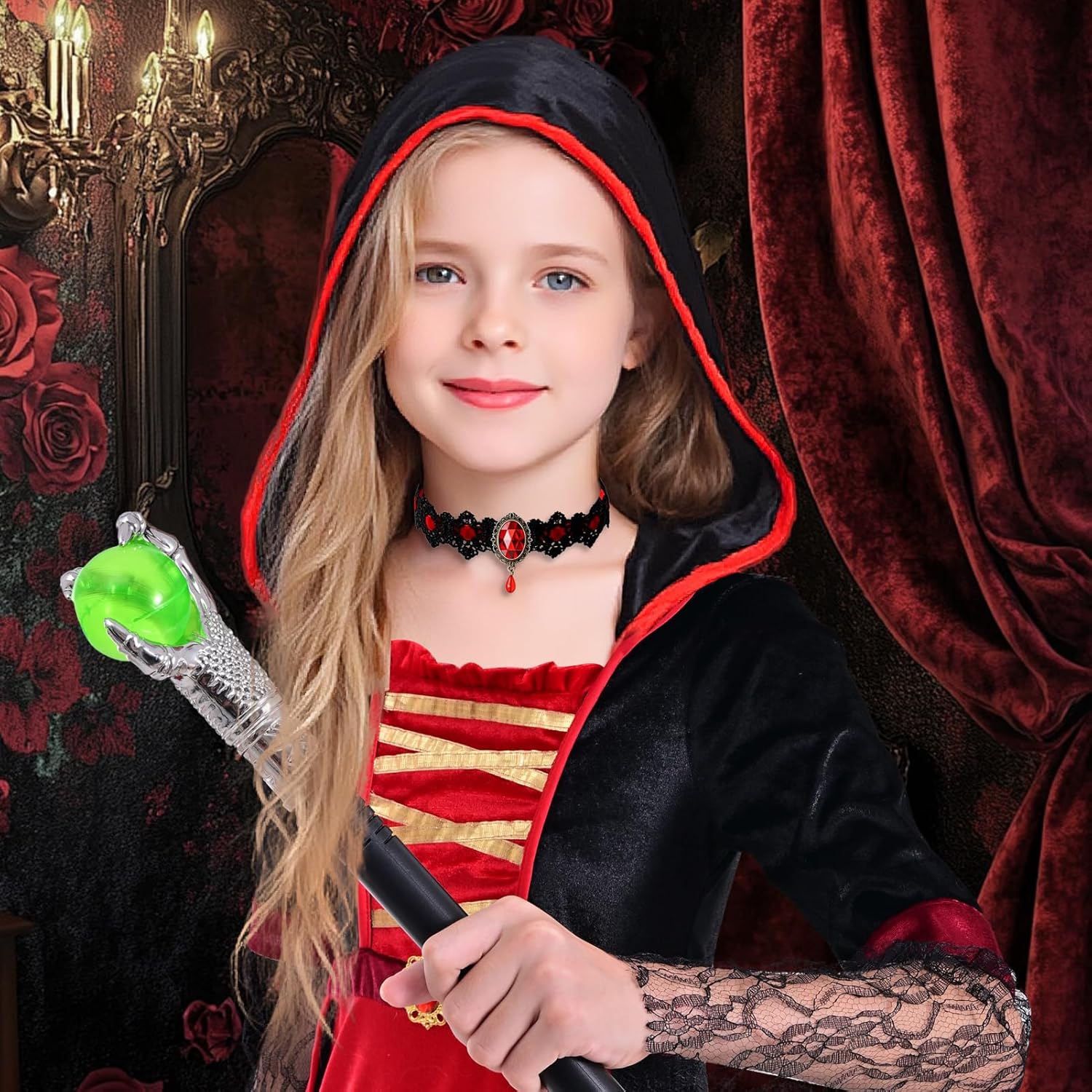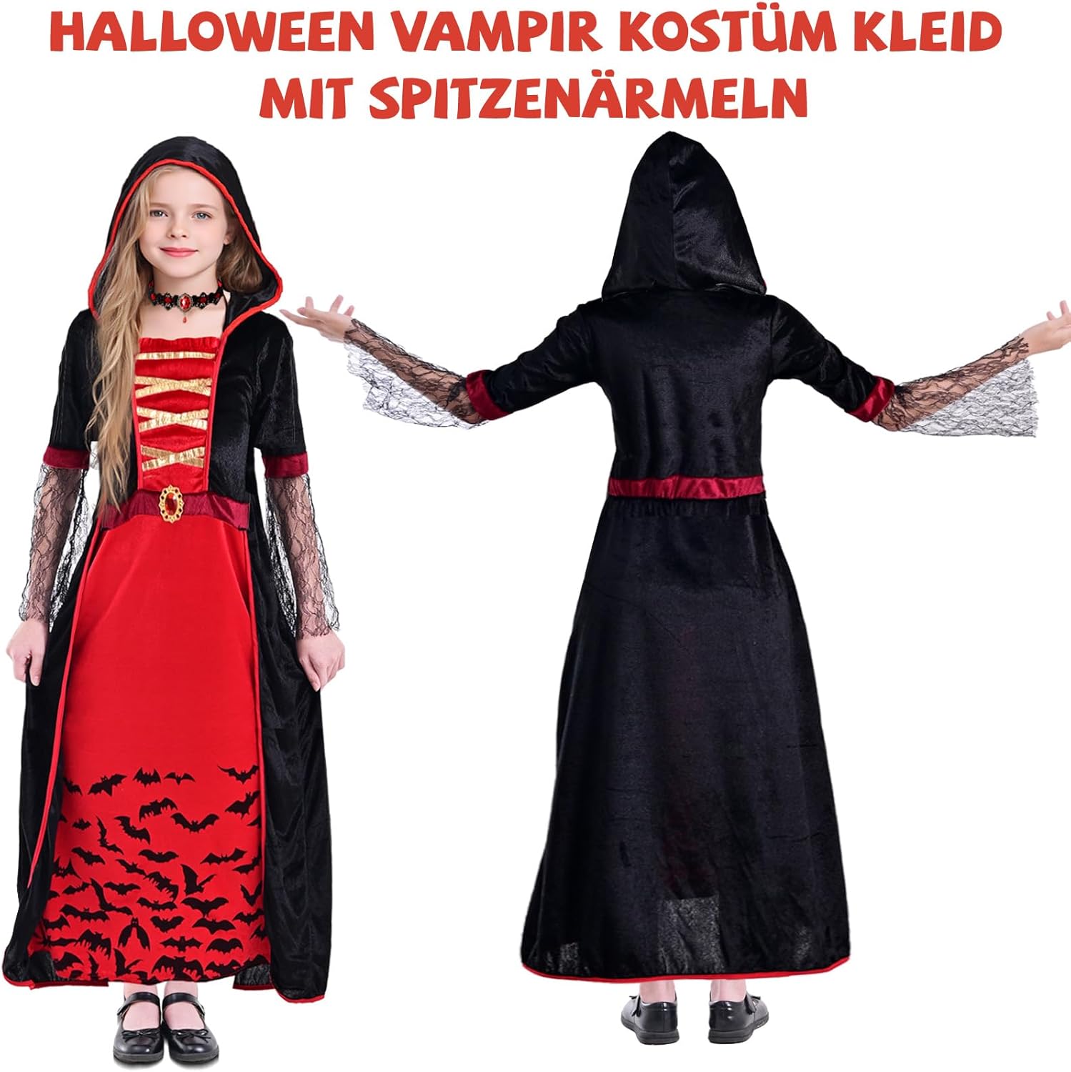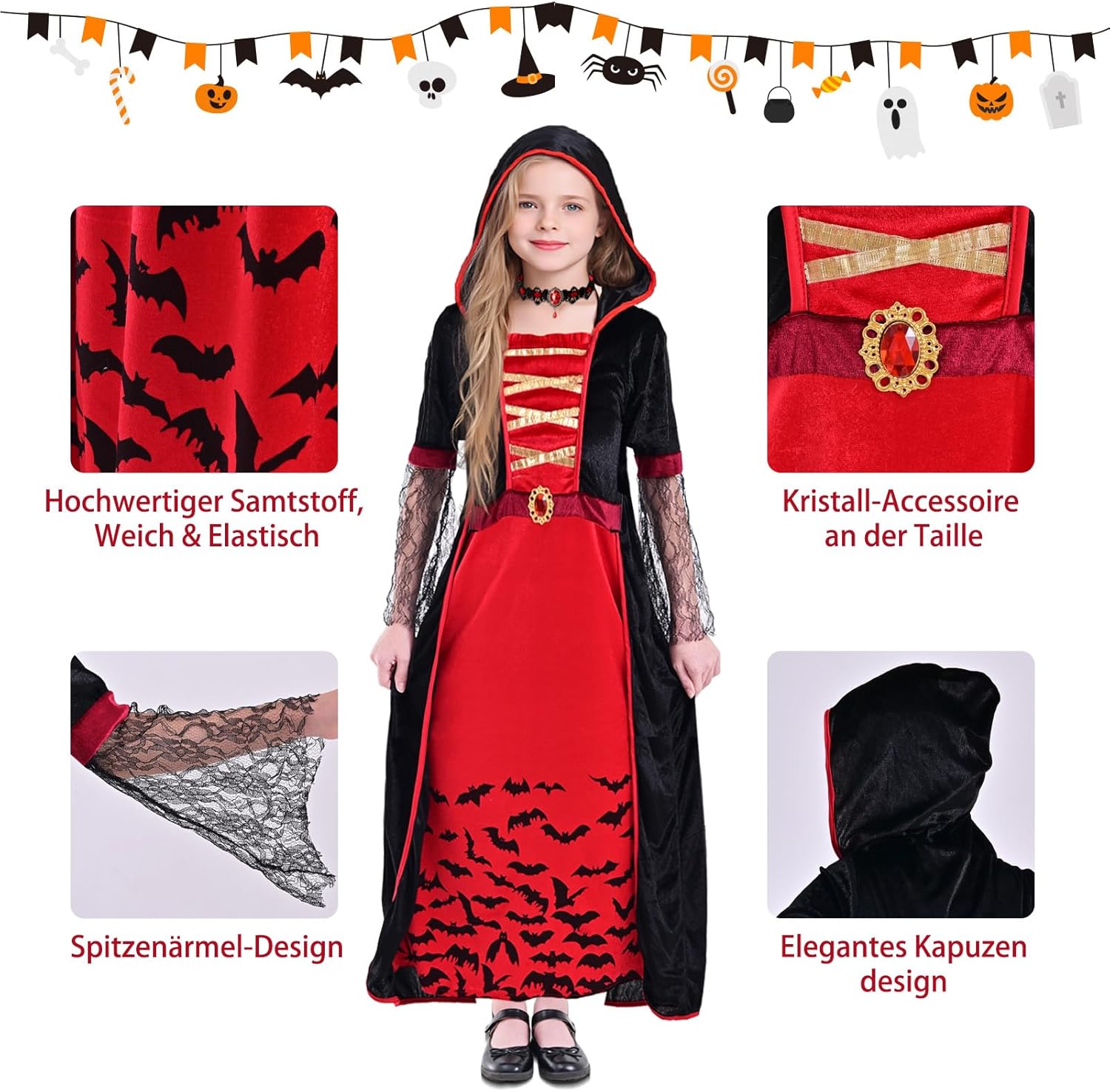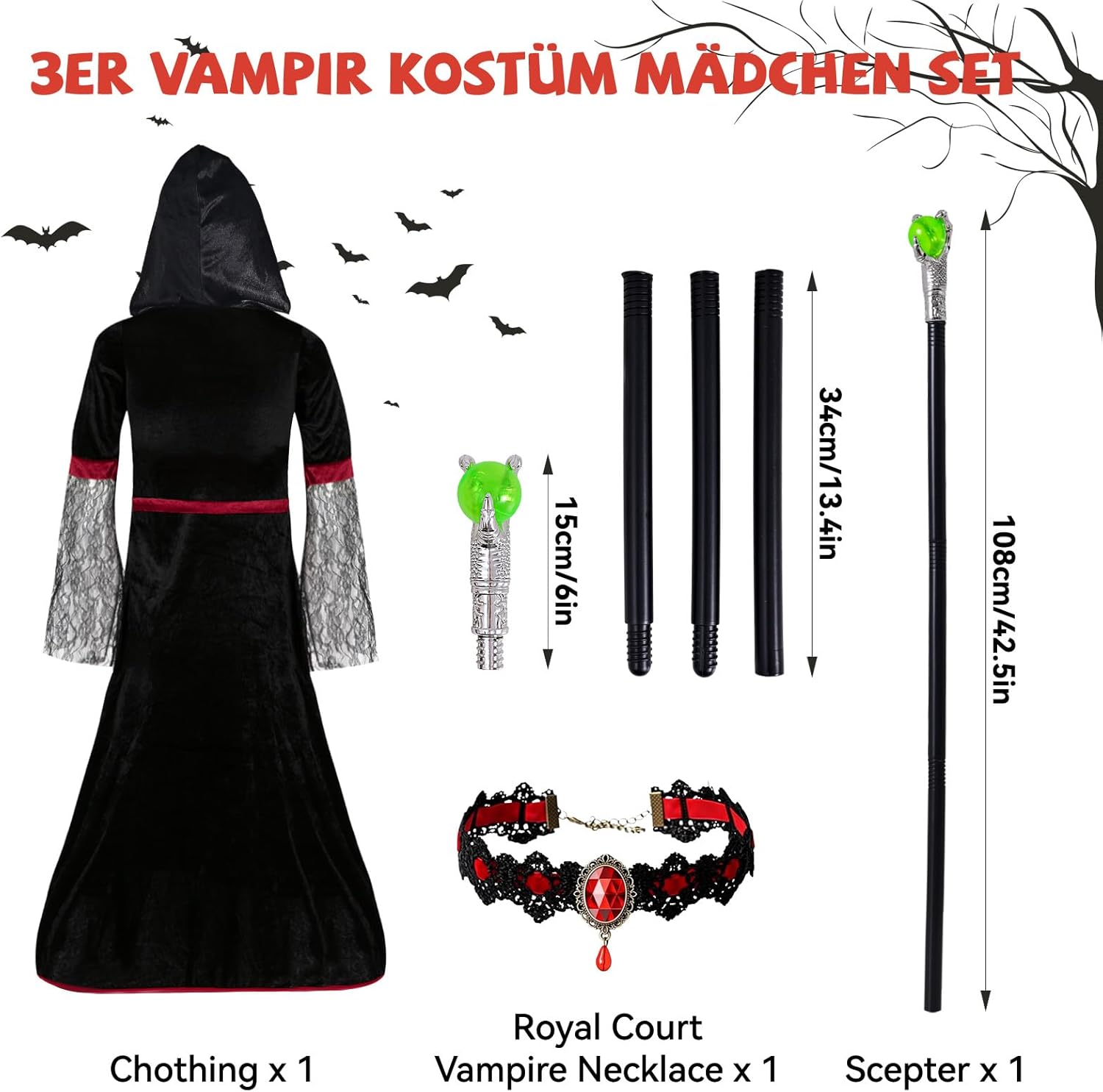 Costume da vampira per bambina con accessori da vampira: bastone da passeggio e collana Royal Vampirin Queen, abito da vampira deluxe, costume di Halloween per bambina, costumi di Dracula, abiti vittoriani, festa di carnevale.