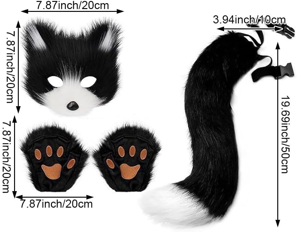 Occasione applicabile: il set di maschere può essere utilizzato come parte di un costume di Halloween da aggiungere alla vacanza. O anche serate a tema animale in cui giochi nei panni di un animale. Può anche essere utilizzato come parte dell'arredamento quotidiano per aggiungere personalità e interesse. Regalo ideale: gli accessori possono essere regalati ai propri cari, amanti, compagni di classe e altro ancora. Design realistico: il design della maschera è realistico, imita caratteristiche come orecchie, naso e occhi appuntiti, si abbina allo stile della maschera, aggiungendo integrità agli accessori. Il design morbido della coda aumenta l'interesse e l'autenticità del gioco di ruolo. la coda ha anche uno scheletro incorporato che può essere piegato a piacere. Dimensioni: la dimensione della maschera è 20 x 20 cm (7,9 x 7,9 pollici), la dimensione della coda è 20 x 20 cm (7,9 x 7,9 pollici), la dimensione della coda è 50 x 10 cm (19,7 x 3,9 pollici). . Il peso netto del set è di 280 grammi. Materiale soddisfacente: la maschera in peluche è realizzata in tessuto morbido, garantendo un comfort a lungo termine. Allo stesso tempo, ci sono trame ricamate a maglia, la corrispondenza dei colori ha un effetto di simulazione.