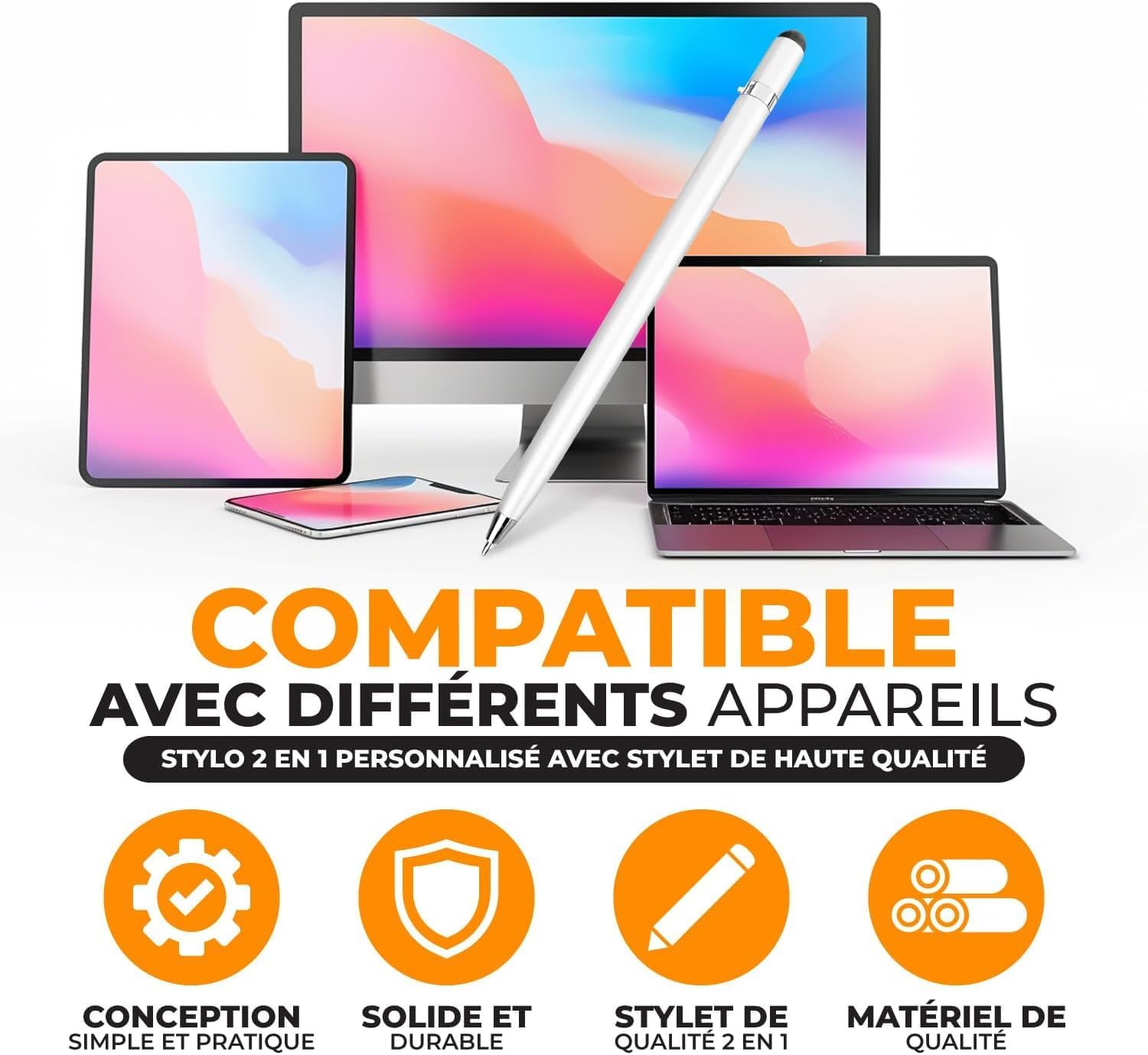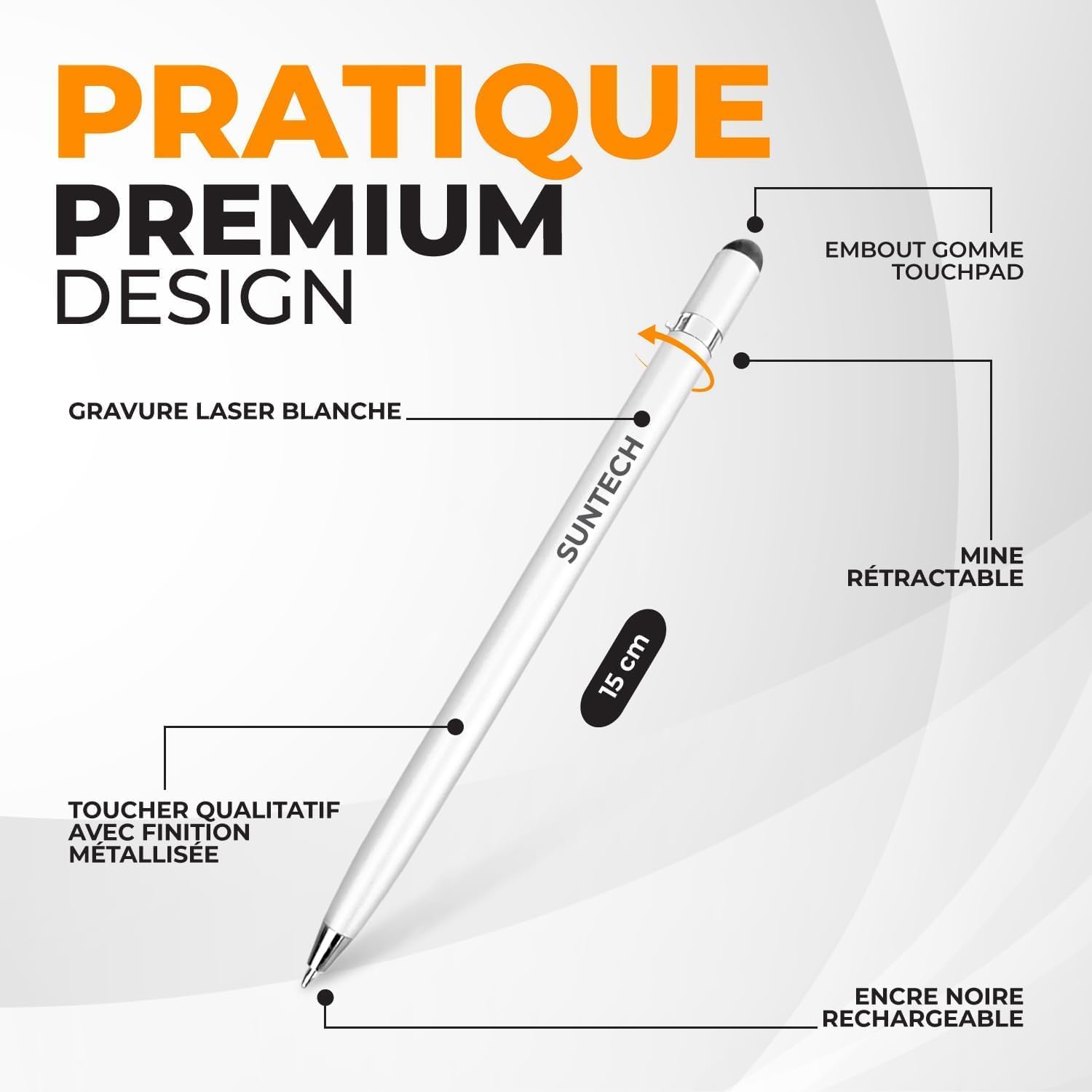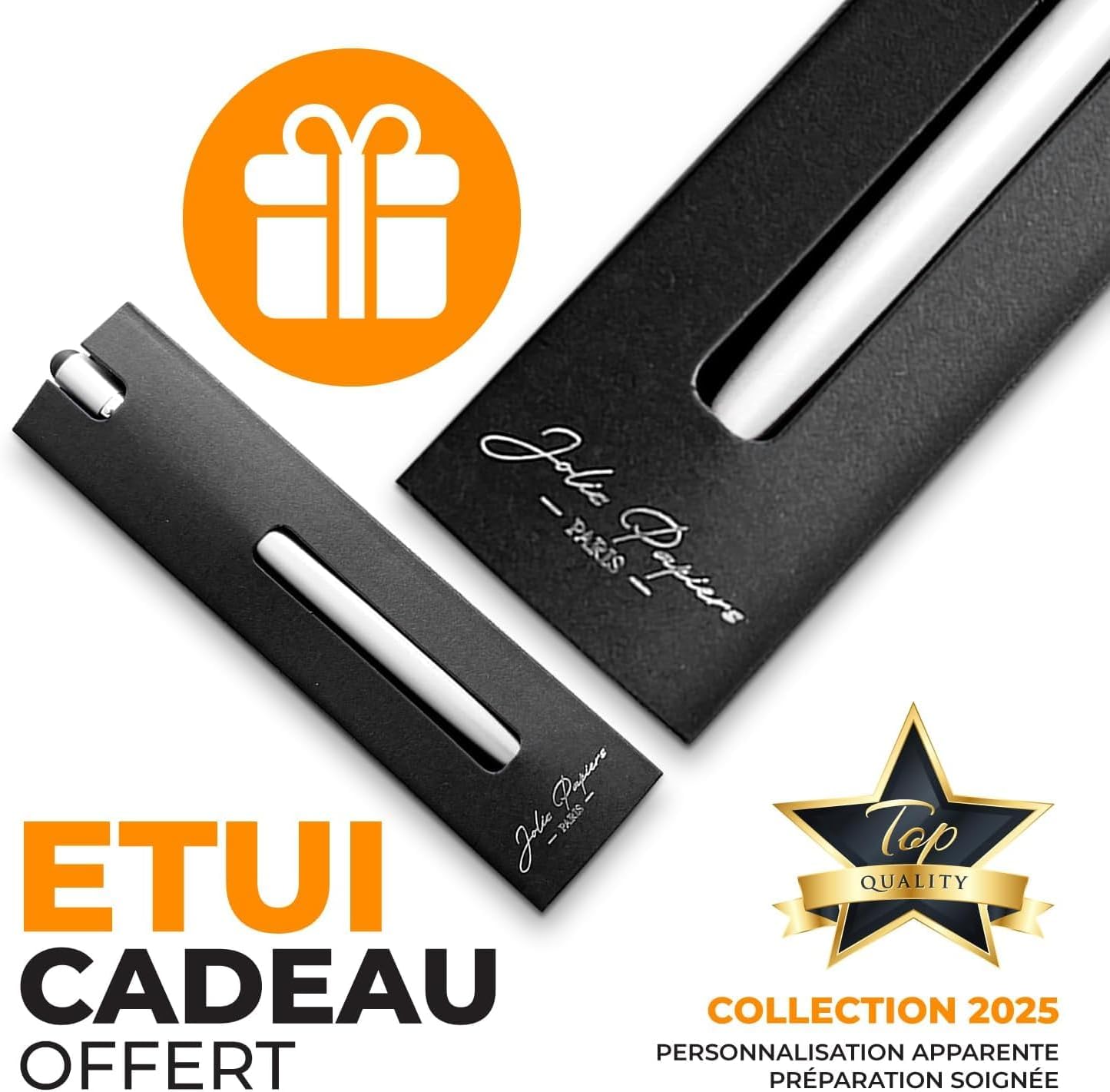 🎁 Astuccio regalo incluso Un elegante astuccio è incluso con ogni ordine singolo o set da 3 penne. Per una presentazione ancora più raffinata, scegli il nostro astuccio in similpelle (disponibile in 4 colori). ✍ Incisione personalizzata inclusa Aggiungi un nome, un messaggio o un logo per creare un regalo davvero unico. Ideale per aziende, matrimoni o come ringraziamento ai clienti. 📦 Come personalizzare? Clicca su “Personalizza ora”, scegli il carattere, inserisci il testo e aggiungi al carrello. Clienti BE/NL: si prega di utilizzare la messaggistica Amazon. ⚡ Produzione espressa senza minimo d’ordine Produzione in 24 ore lavorative nel nostro laboratorio in Francia. Nessun ordine minimo richiesto, anche per una sola penna. 🖊️ Penna 2-in-1 con punta touch Penna a sfera con inchiostro nero fluido + punta touch per schermi. Corpo in alluminio colorato (Bianco, Rosa oro o Grigio metallizzato). Incisione laser bianca inclusa (nera su penna bianca), ricarica nera.