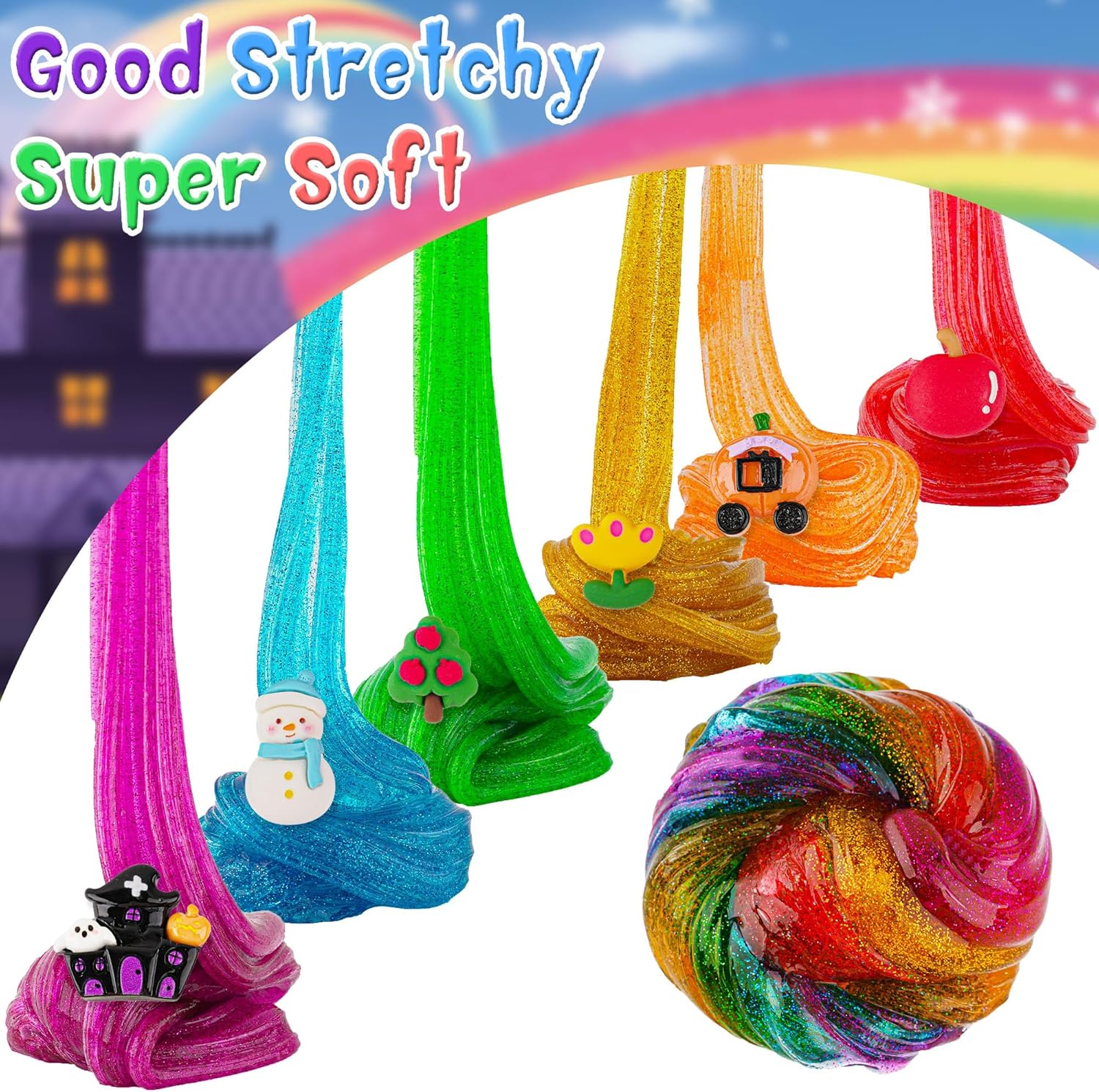 Set di lime arcobaleno glitterato: questo set di lime arcobaleno contiene slime scintillante crunchy in 6 colori: melma rossa, melma arancione, melma gialla, melma verde, melma blu e melma viola. 6 tipi di ciondoli per muco e 6 tipi di additivi mucosi. Ogni barattolo contiene 60 ml di glitter crunchy slime, per un totale di 360 ml. Il volume moderato di 60 ml è perfetto per le mani dei bambini piccoli per giocare! Super morbido e ben elastico: la melma glitterata di Okaybee offre una consistenza unica che è super morbida al tatto. Grazie alla sua natura user-friendly, puoi iniziare subito e goderti la prelibatezza morbida ed elastica. Non preoccuparti per le mani appiccicose! Slime adatto ai bambini: questo slime arcobaleno realizzato con ingredienti di alta qualità è sicuro per bambini e adulti. Nota: per i bambini di età inferiore a 3 anni si raccomanda la supervisione di un adulto. Non mangiare! 【Giocattolo sensoriale Slime Perfetto】 Che tu voglia alleviare lo stress o migliorare il tuo gioco sensoriale, questo pacchetto scintillante e croccante è perfetto per te. Guarda il muco espandersi, spremere e filtrare attraverso le dita, offrendo infinite ore di intrattenimento. Fantastico regalo per bambini: questo set di slime glitter arcobaleno è un eccellente regalo di compleanno per ragazzi e ragazze di età compresa tra 6, 7, 8, 9, 10, 11, 12 anni. Regali per feste, regali scolastici o di Halloween, persino calze di Natale.