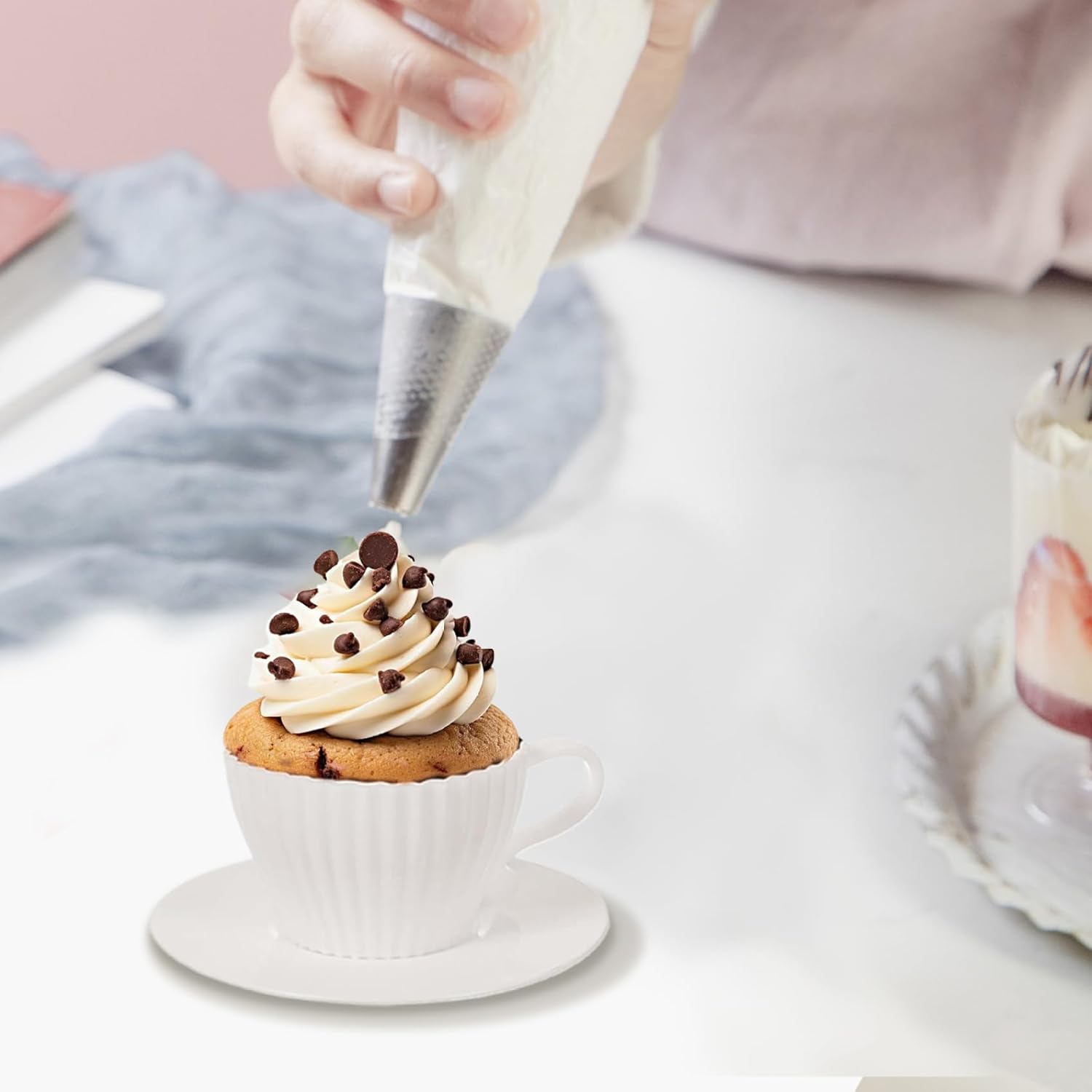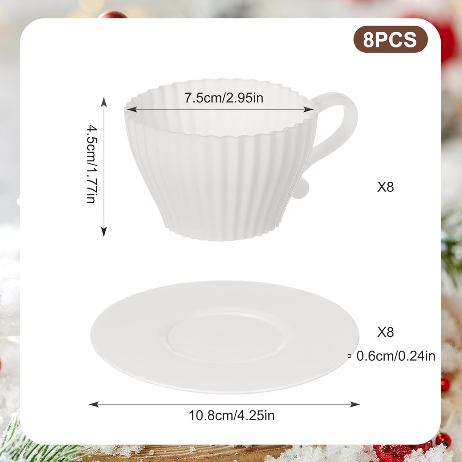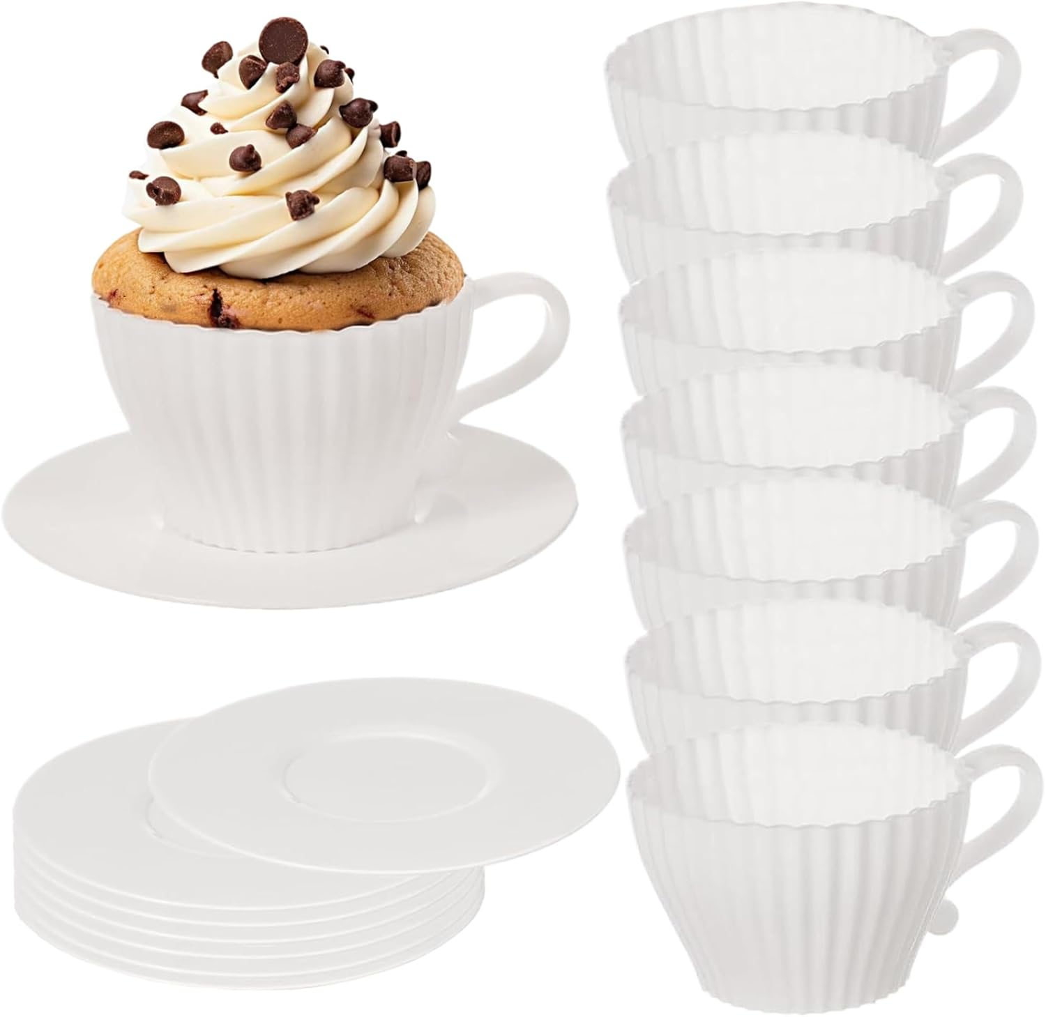 Set completo di tazze da tè: questo set di tazze da forno in silicone comprende 8 tazze a forma di tazza da tè e 8 piattini coordinati..Perfette per aggiungere un tocco elegante alla tua tavola, posiziona semplicemente le tazze piene di tè raffreddate sui piattini per una presentazione affascinante che sicuramente impressionerà i tuoi ospiti. Antiaderenti e facili da pulire: a differenza dei tradizionali pirottini di carta, questi pirottini in silicone sono impermeabili e antiaderenti, facilitando la rimozione dei prodotti da forno senza problemi..La pulizia è un gioco da ragazzi: basta sciacquarli con acqua o metterli in lavastoviglie per una rapida pulizia..Puoi anche aggiungere un po' di grasso o spray da cucina per un rilascio ancora più semplice. Applicazioni versatili per la cottura al forno: questi pirottini multiuso sono ideali per preparare una varietà di dolcetti, tra cui muffin, mousse, pane, budino, torta, brownies, cupcake e altro ancora..Sono perfetti per feste, matrimoni, compleanni, baby shower ed eventi speciali di pasticceria come Halloween, Ringraziamento e Natale. Adatto al forno e al congelatore: realizzati in silicone alimentare privo di BPA, questi stampi per tazze sono sicuri per l'uso in microonde, forni, frigoriferi, congelatori e lavastoviglie..Possono resistere a temperature che vanno da -40°C a 230°C, consentendo un'ampia gamma di opzioni di cottura e conservazione..(Nota: il piattino non è adatto al forno.) Dimensioni standard: ogni tazza misura 2,95x1,77x1,77 pollici, con piattini dal diametro di 4,25 pollici..Realizzate in silicone di qualità, queste tazze robuste e durevoli sono progettate per resistere all'uso regolare pur essendo antiaderenti e resistenti all'olio, garantendo un'opzione ecologica per le tue esigenze di cottura.