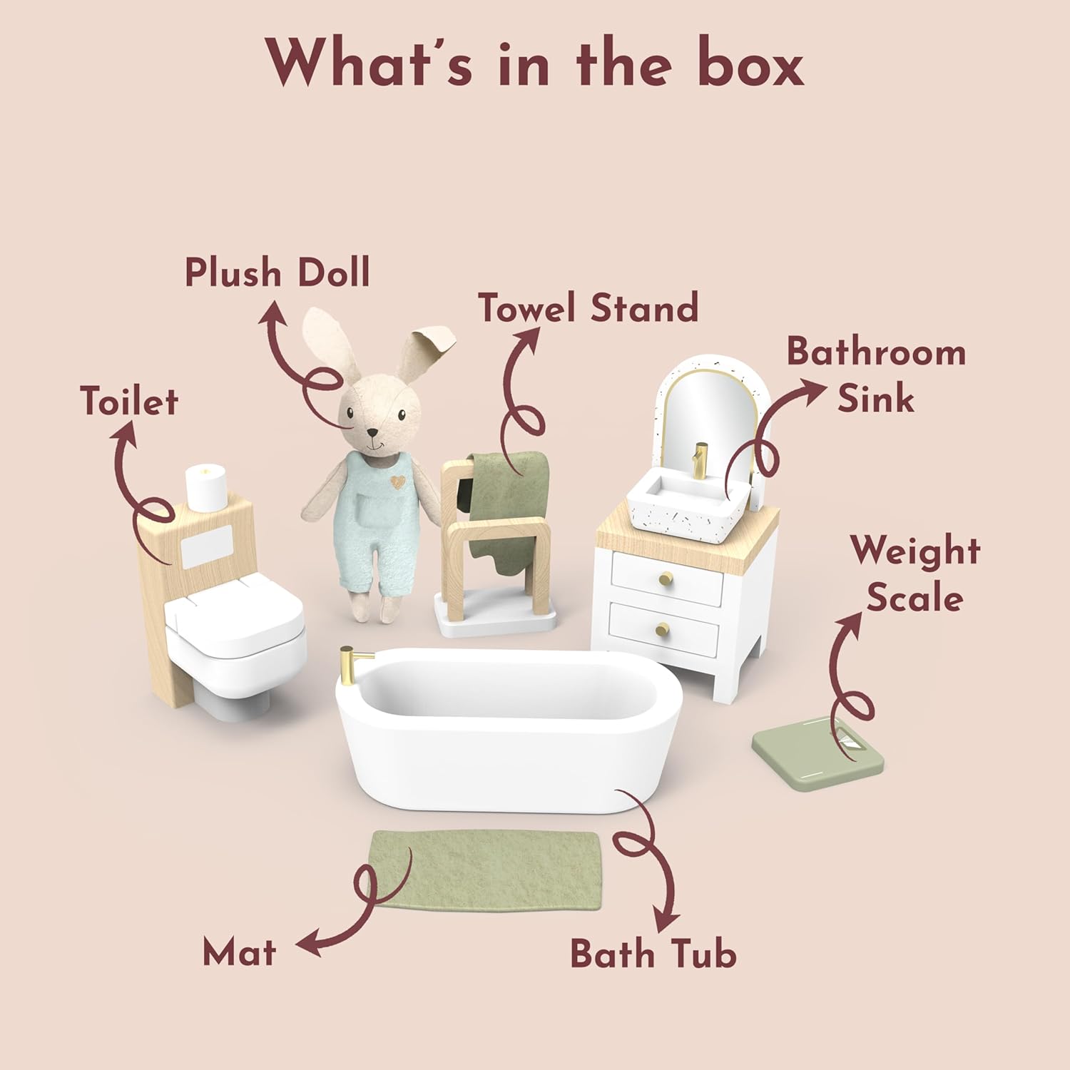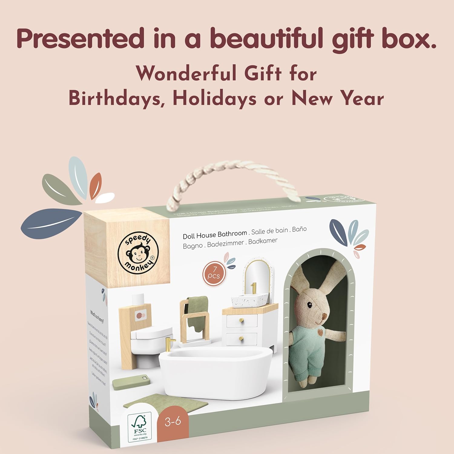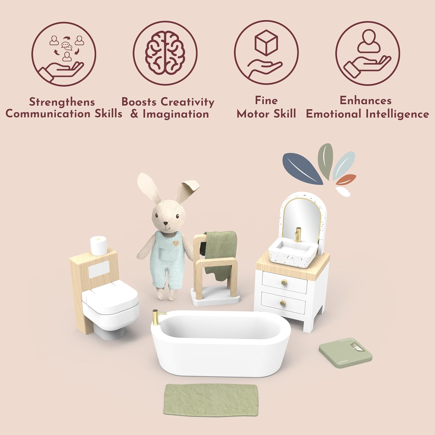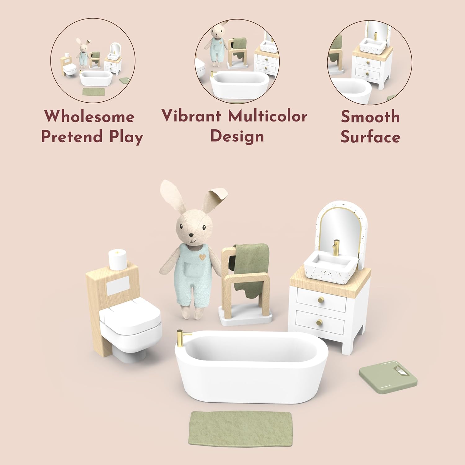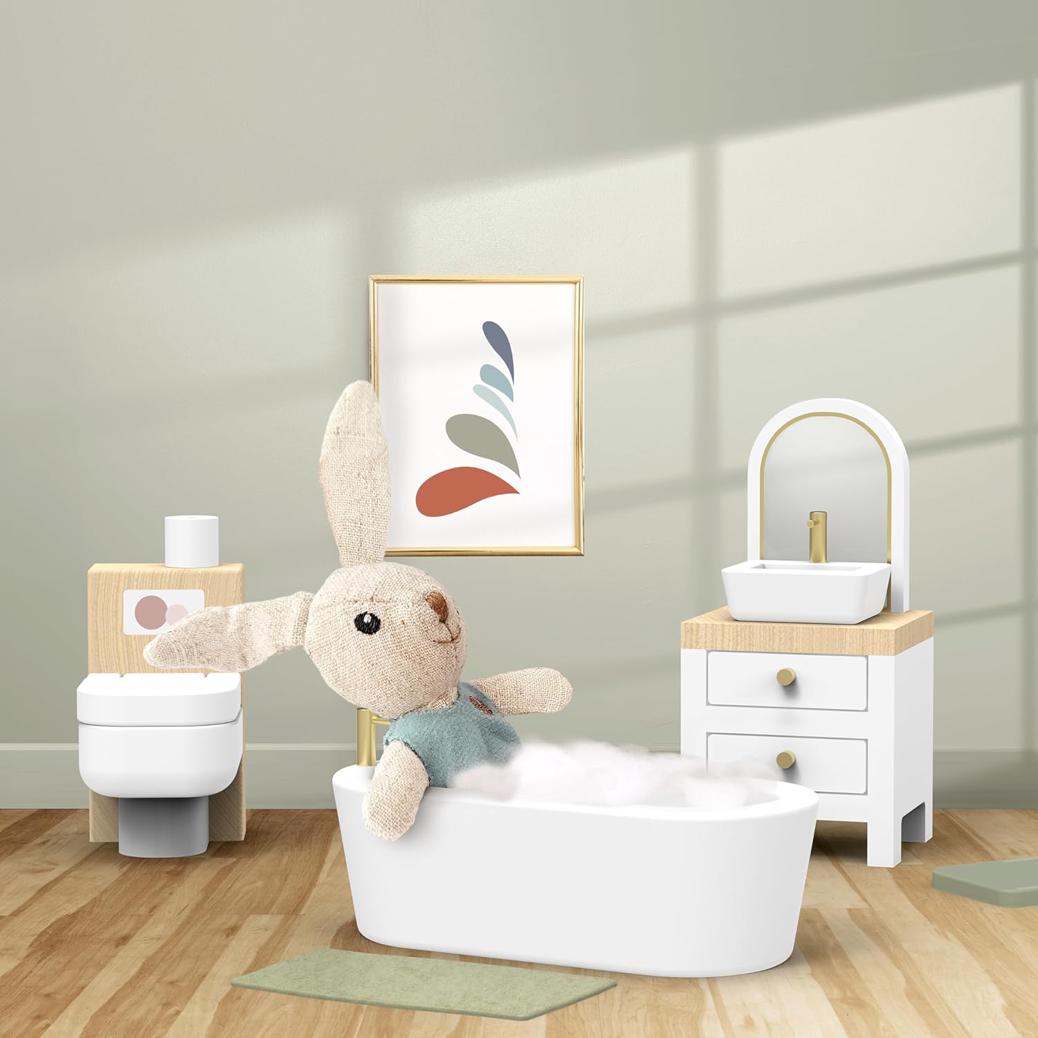 Migliora la tua immaginazione con il bagno della casa delle bambole: il design multicolore luminoso e vivace di questo bagno in miniatura aggiunge un tocco realistico e coinvolgente al gioco di finzione di tuo figlio. Accendi la creatività e crea infiniti scenari per il bagno con vasca, WC, lavandino e altro ancora. Accenti in lino per un maggiore fascino: questo set da bagno presenta morbidi dettagli in lino, dal soffice asciugamano all'adorabile coniglietto, portando ulteriore calore e autenticità al divertimento del tuo bambino. Perfetto per il gioco di ruolo e aggiunge un tocco di realismo in più all'esperienza di gioco. Ideale dai 3 anni in su: progettato per bambini dai 3 anni in su, questo set da bagno per casa delle bambole è perfetto per incoraggiare l'immaginazione narrativa, le capacità motorie e il gioco creativo. Ottimo per ragazze, bambini piccoli e giovani studenti. MATERIALI ECOLOGICI PER UN GIOCO SICURO: Realizzato con legno proveniente da fonti sostenibili e certificato FSC, questo set da gioco è costruito per durare e essere sicuro per il tuo bambino. Puoi stare tranquillo nel dare al tuo bambino un accessorio durevole ed ecologico per la casa delle bambole. Facile manutenzione per un divertimento continuo: mantenere il bagno della casa delle bambole in condizioni perfette è un gioco da ragazzi, basta pulirlo con un panno umido. Non c'è bisogno di prodotti chimici aggressivi, assicurando che il set del tuo bambino rimanga pulito e scintillante per ore di gioco fantasioso.