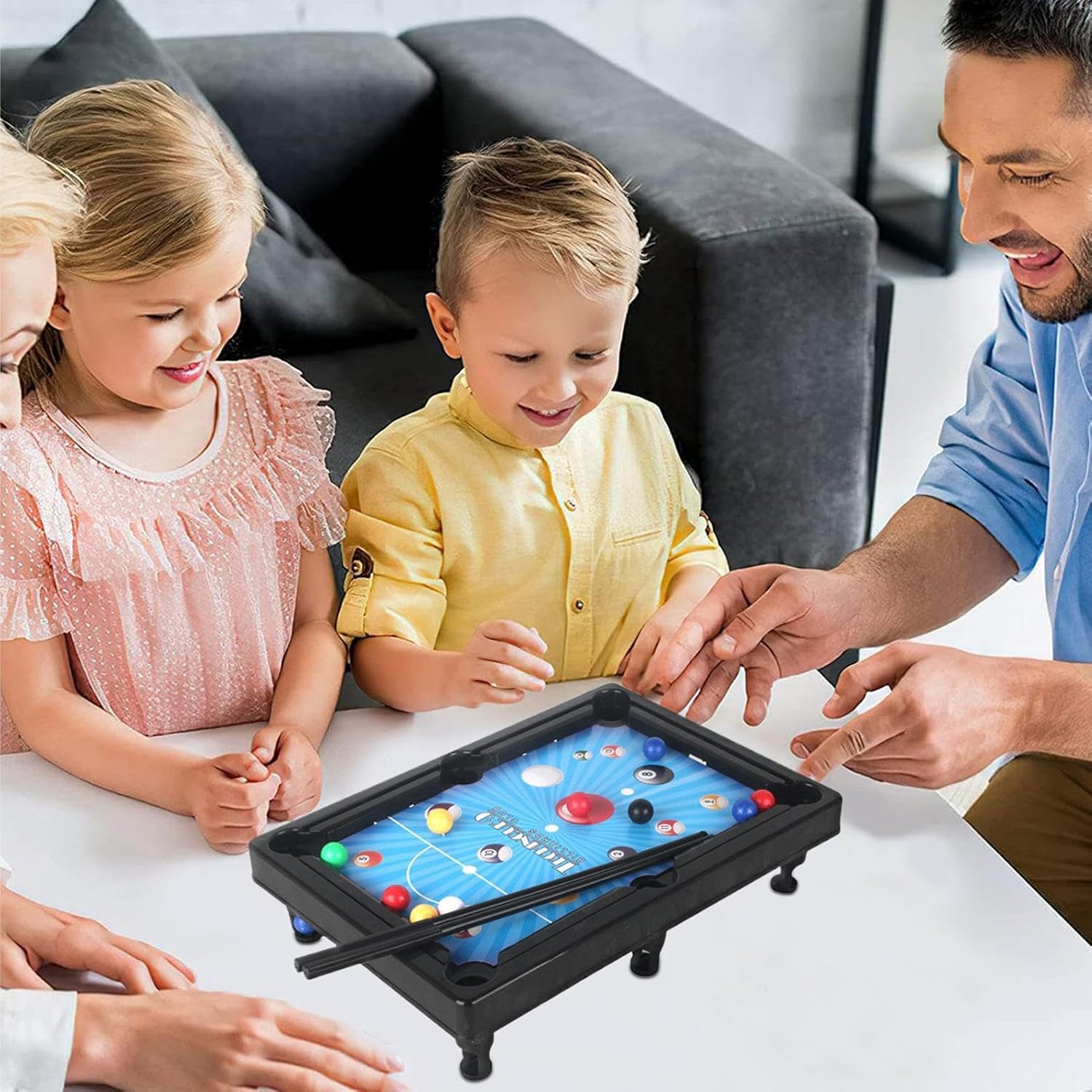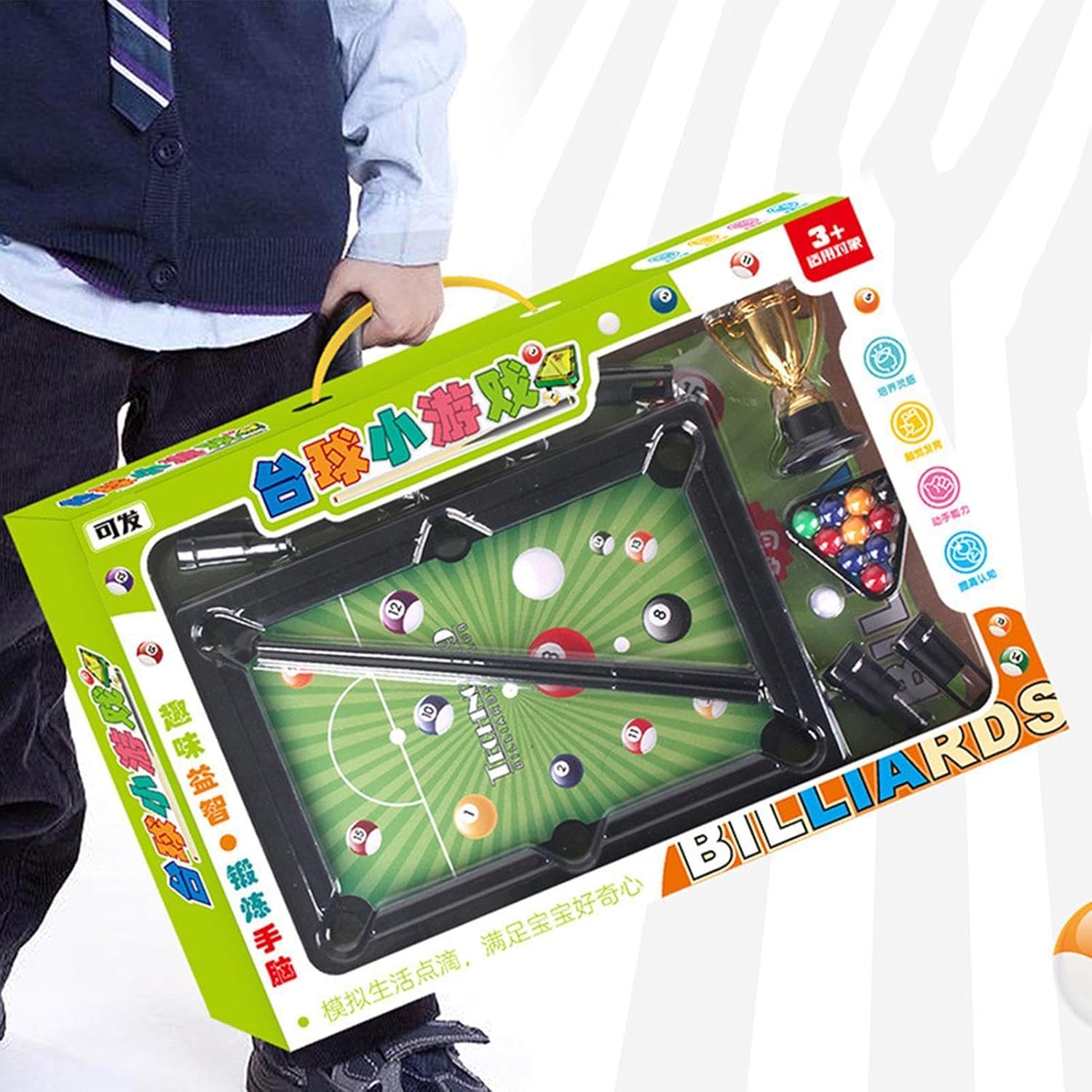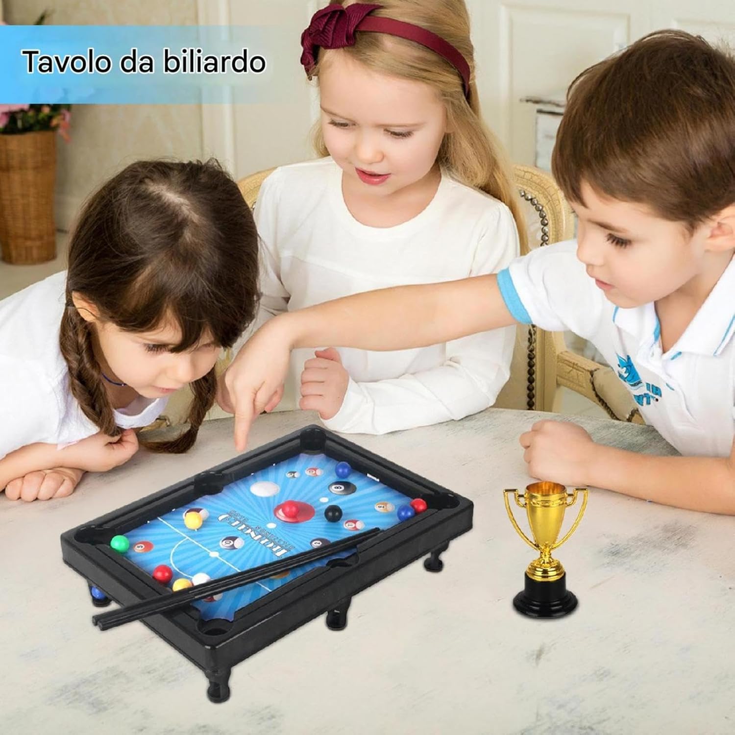 Design compatto: questo tavolo da biliardo in miniatura è perfetto per piccoli spazi e consente ai bambini di divertirsi con il biliardo a casa, a scuola o in ufficio. È facile da configurare e offre ore di divertimento senza occupare molto spazio. Set completo da biliardo: include tutti gli accessori necessari: stecche da biliardo, palline, rastrelliera triangolare e gesso. Tutto ciò di cui hai bisogno per una partita completa di biliardo direttamente sulla tua scrivania o sul tuo tavolo. Vantaggi educativi: ottimo per sviluppare la coordinazione occhio-mano, la concentrazione e il pensiero strategico. I bambini impareranno gli angoli, la precisione e come controllare il gioco, il tutto divertendosi con la famiglia o gli amici. Durevole e sicuro: realizzato con materiali atossici di alta qualità progettati per i bambini. Le piccole stecche e palline garantiscono sicurezza offrendo allo stesso un'esperienza realistica per principianti o giovani giocatori. Gioco interattivo per bambini: ideale per il gioco sociale, questo tavolo da biliardo da tavolo incoraggia i turni, la competizione amichevole e il team building. Perfetto per feste di compleanno, riunioni o momenti di gioco con gli amici.