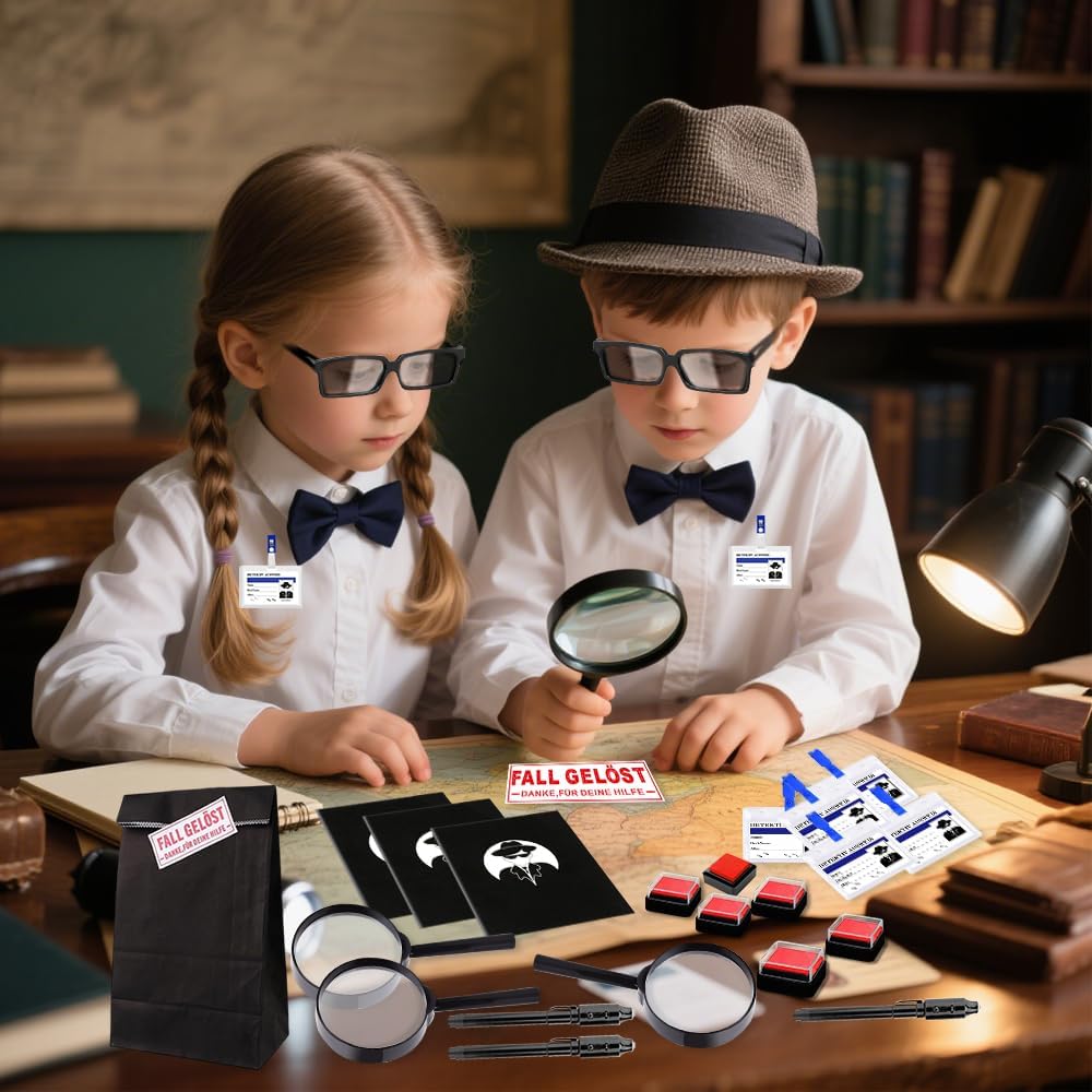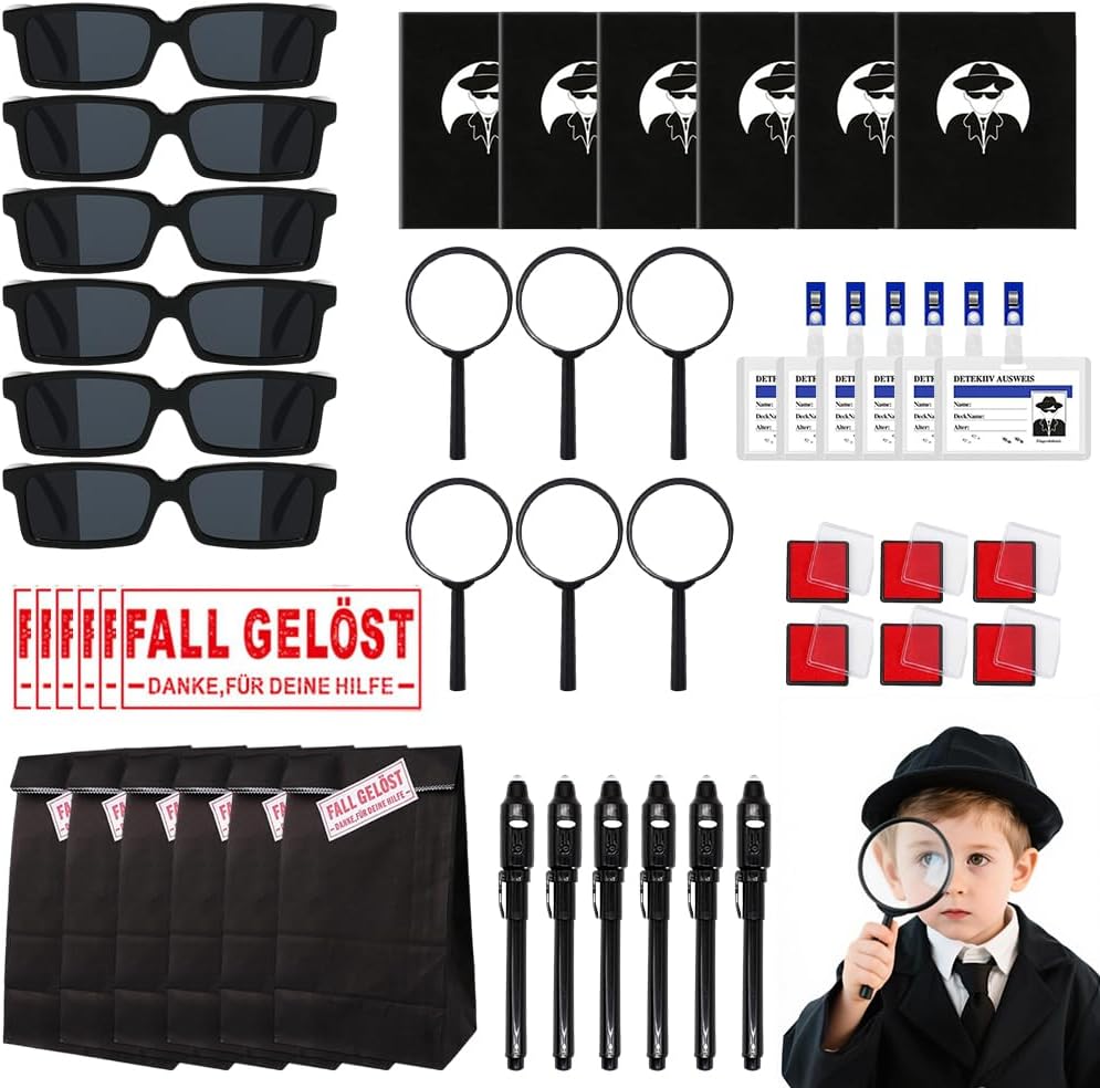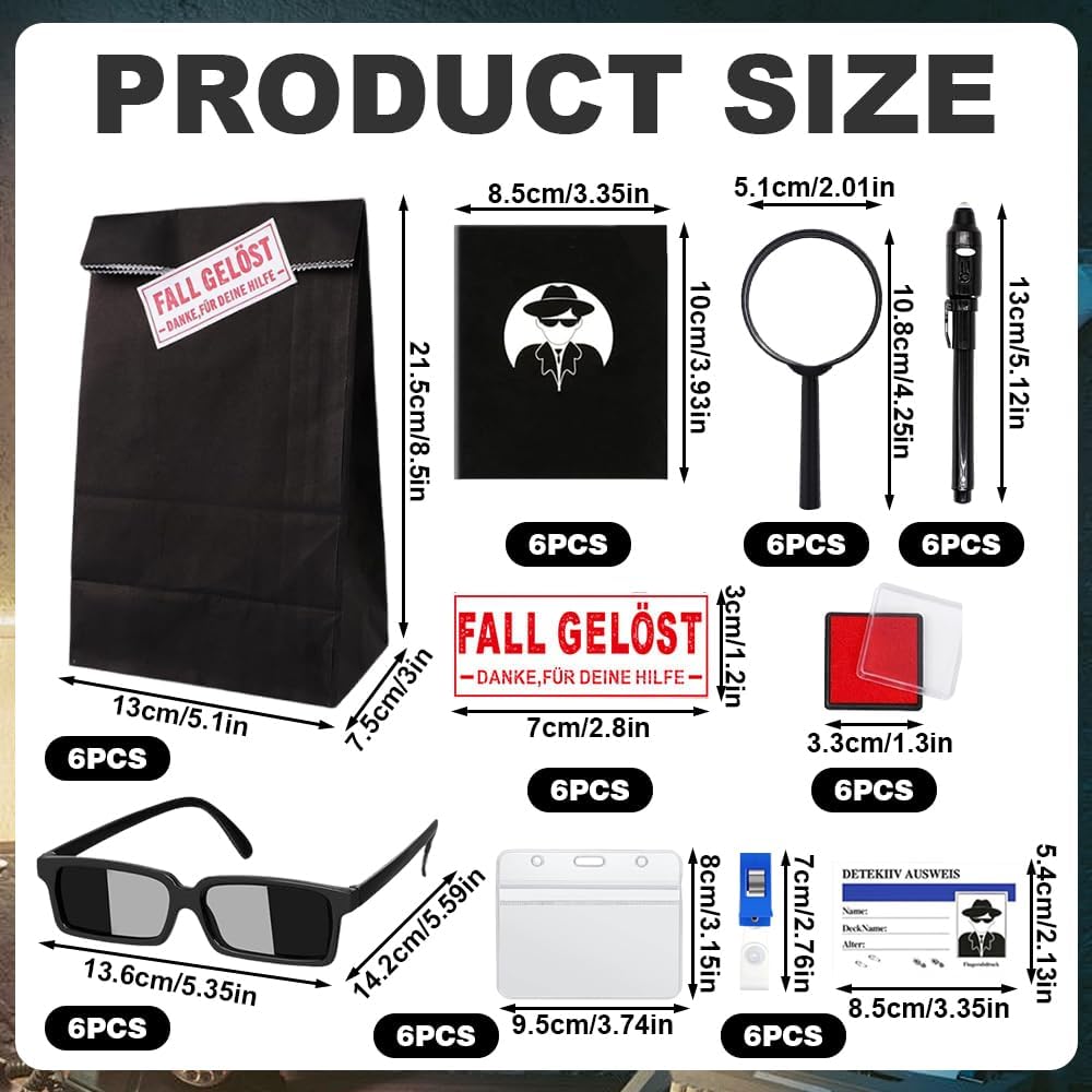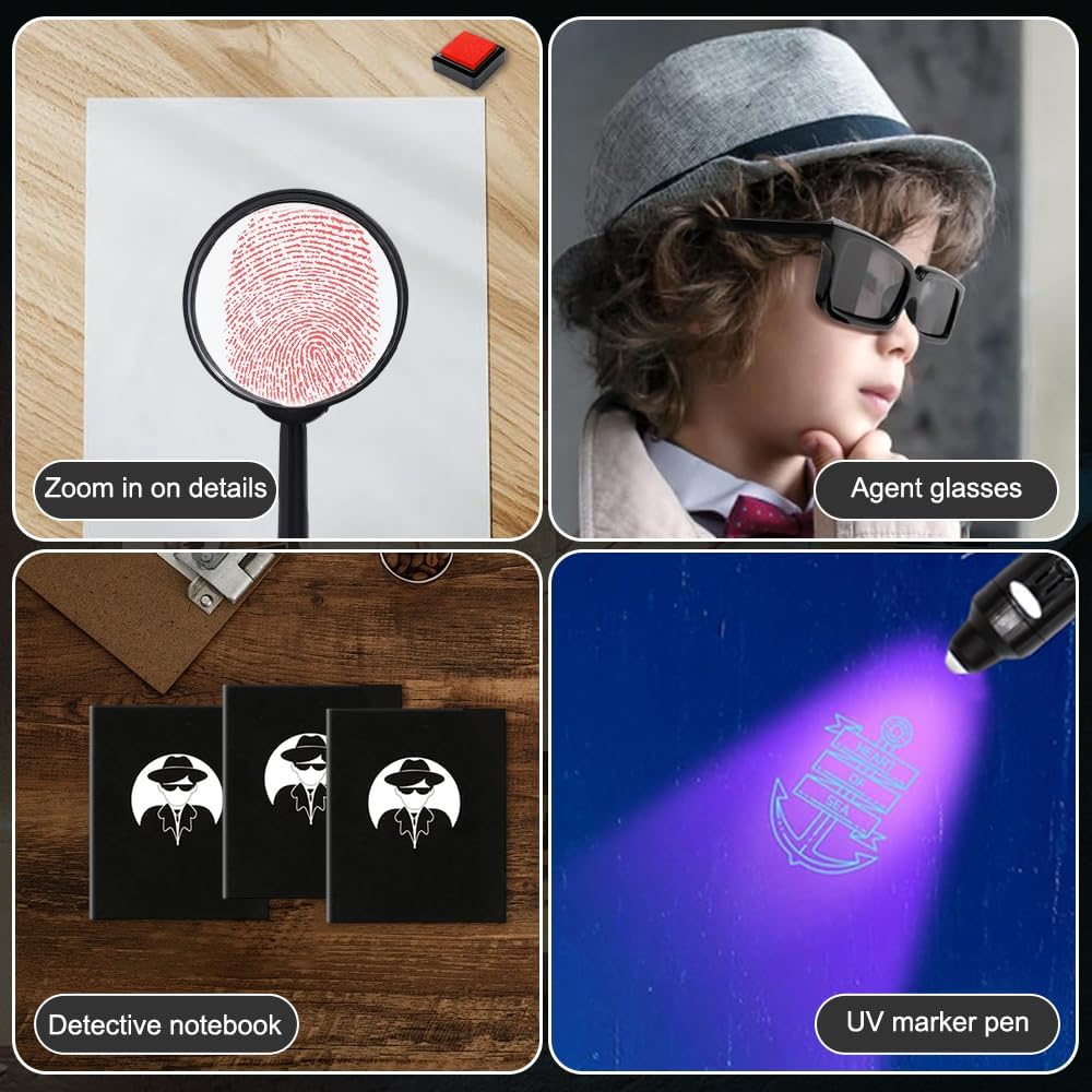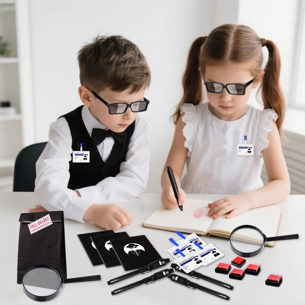 Set da 48 pezzi: il set detective per bambini contiene 6 occhiali da agente, 6 tamponi per timbri, 6 penne UV, 6 quaderni, 6 badge detective con clip, 6 lenti d'ingrandimento, 6 adesivi e 6 sacchetti con zip. Con il set detective, i bambini possono giocare al detective ed esplorare i segreti del mondo per stimolare l'immaginazione e la creatività. Penna UV unica: con la penna UV puoi scrivere i tuoi segreti su un taccuino e l'inchiostro magico li nasconde. Il messaggio non viene rivelato fino a quando la penna non viene esposta alla luce UV. Nota: la pellicola isolante deve essere rimossa prima di utilizzare la penna magica. Lente d'ingrandimento giocattolo: la lente d'ingrandimento giocattolo ha una presa sottile e un bordo realizzato con lenti in plastica di alta qualità, che garantiscono un'eccellente qualità dell'immagine senza distorsioni. La lente d'ingrandimento consente ai bambini di vedere chiaramente i dettagli e garantisce che non vengano trascurati indizi, è un piccolo giocattolo indispensabile per spie detective e agenti segreti. 【 badge detective 】 Il porta badge trasparente per detective è realizzato in materiale PVC impermeabile, che è durevole e rimane asciutto e ordinato. Con una clip che si attacca ai vestiti e non cade. Con il badge detective, i bambini possono entrare nei ruoli di detective, agenti e spie per rendere il gioco investigativo ancora più emozionante. Regalo perfetto: il set detective per bambini può stimolare l'immaginazione e la creatività dei bambini e promuovere le capacità di risoluzione dei problemi. È adatto non solo come accessorio per feste per detective, ma anche perfetto come regalo di Natale per bambini, come regalo di compleanno, ecc., poiché il set detective è così misterioso e divertente.
