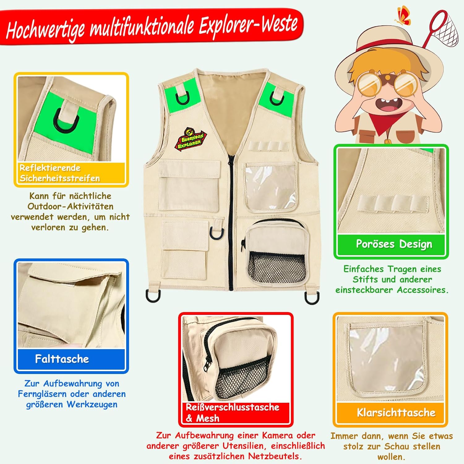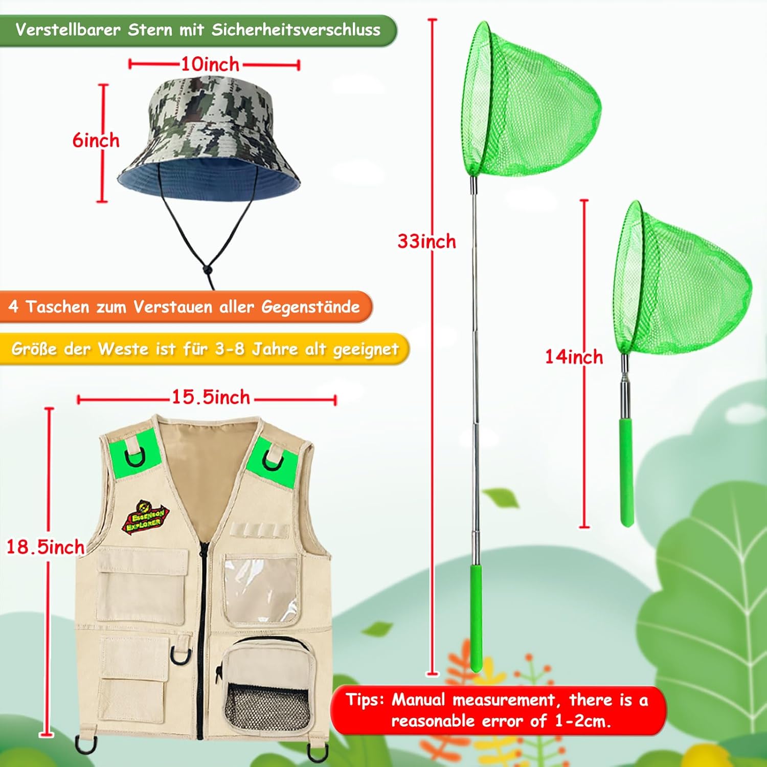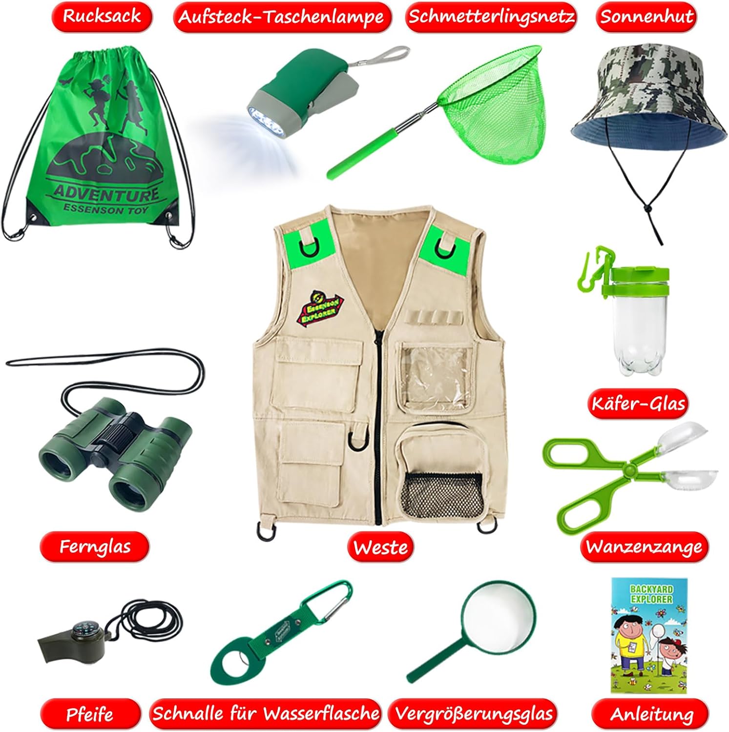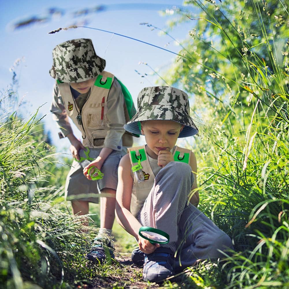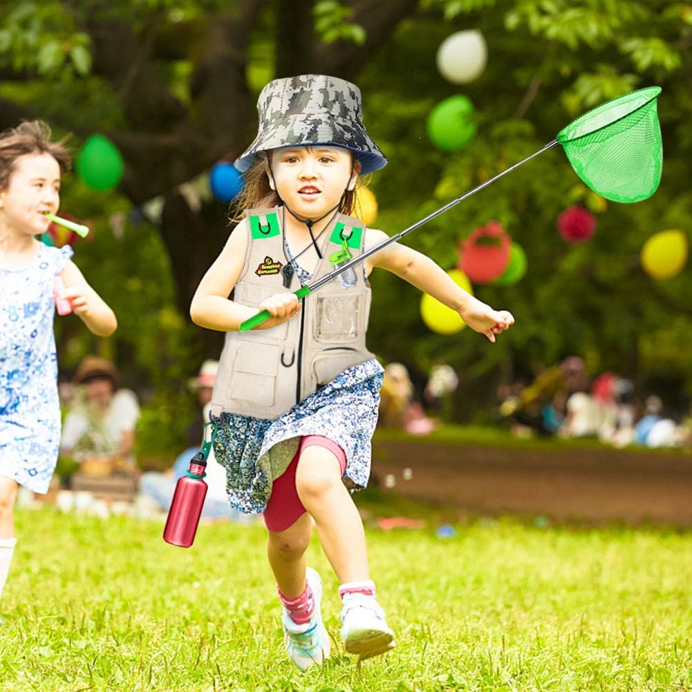 Kit esploratore e avventura della natura: set completo da esploratore e avventura per bambini, incluso: gilet, cappello da esploratore, rete per farfalle, binocolo ottico 5X, fibbia per bottiglia d'acqua, vetro da scarabeo, lente d'ingrandimento, fischietto, pinze da scarabeo, zaino Creatività e apprendimento: indossa un gilet e attacca tutta l'attrezzatura per l'esplorazione, usa il binocolo per osservare il volo degli uccelli nel parco; Insegui la farfalla nel cortile e catturala con un retino per farfalle. Usa le pinze per insetti per catturare gli insetti e osservali con una lente d'ingrandimento; Scopri più divertimento durante l'esplorazione; Regali per ragazzi di 4 5 6 7 anni Esplora il mondo naturale: questo kit di esplorazione incoraggia l'esplorazione scientifica e l'amore per la natura; Offri ai bambini uno sguardo più da vicino sulla natura con un kit di esplorazione della natura che li ispira a saperne di più sul mondo naturale; Il giocattolo da esterno promuoverà cognitivamente la curiosità di tuo figlio e stimolerà la sua immaginazione; Un divertimento meraviglioso per viaggi in campeggio e indagini all'aperto o al chiuso Ottimo regalo per i bambini: questo kit di esplorazione supporta l'apprendimento della menta e promuove l'esplorazione scientifica e l'amore per la natura; Che si tratti di giocare nell'ingresso o in giardino, il pratico zaino è facile da trasportare e permette al bambino avventuroso di esplorare e imparare. La tua esperienza è la nostra massima priorità; Se il tuo prodotto non funziona correttamente, contattaci per un servizio perfetto; Qualsiasi problema con i nostri prodotti ha la priorità