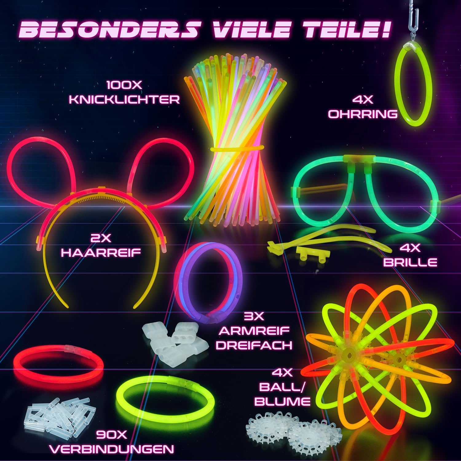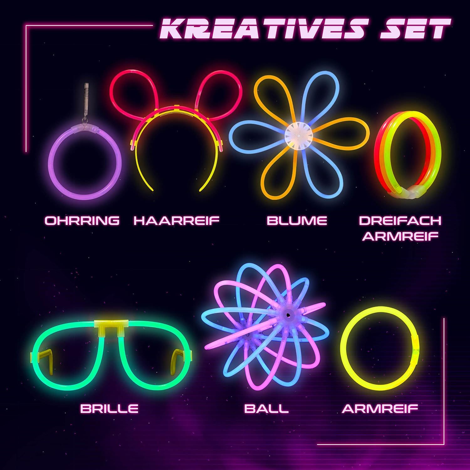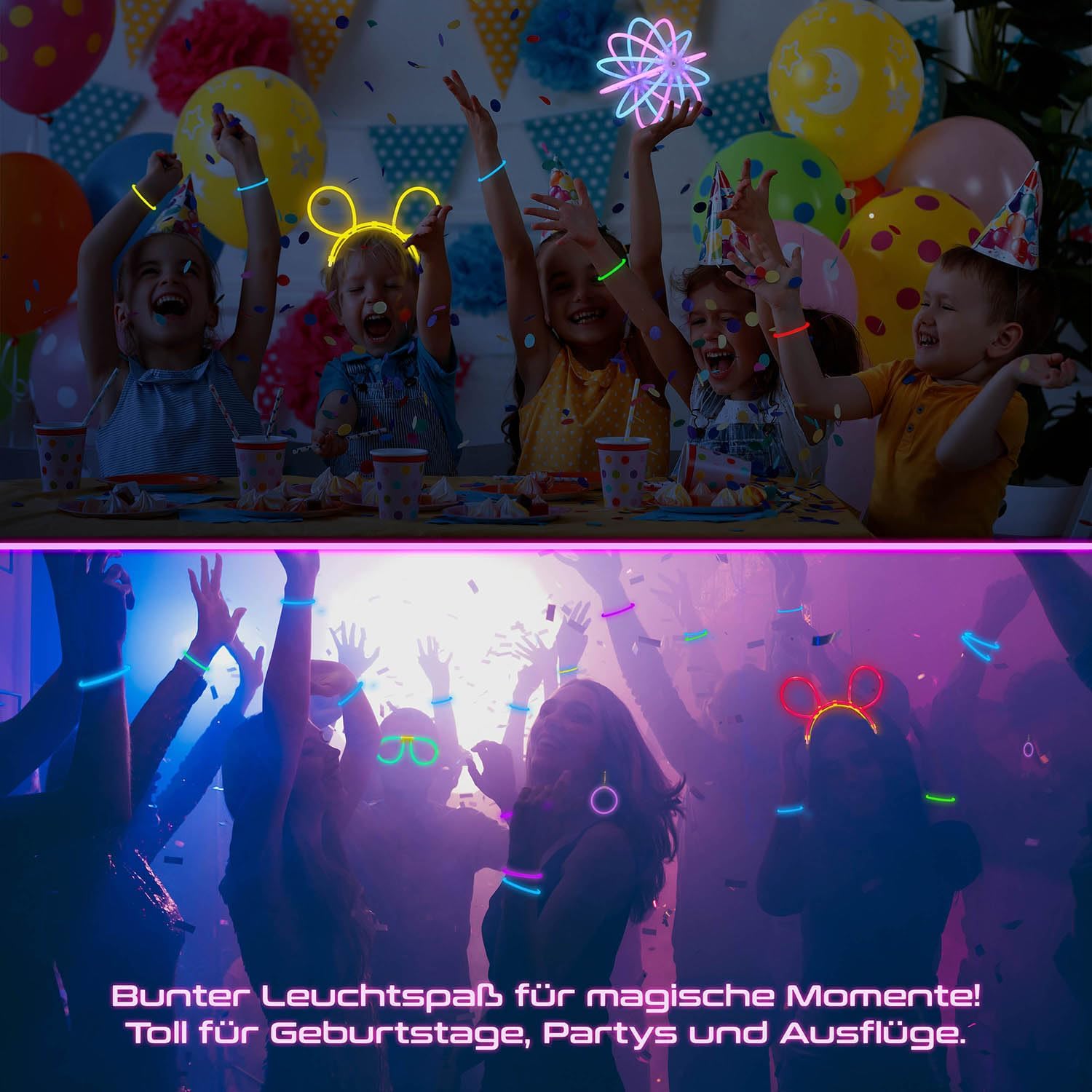 EXTRA LUMINOSO: i nostri bastoncini luminosi attireranno l'attenzione della tua festa al neon! Sono particolarmente colorati con sette fantastici colori e brillano intensamente e a lungo. Goditi fino a 8 ore di magia bagliore nell'oscurità! ALTA QUALITÀ E ANTIINFRANGIBILE: utilizziamo materiale infrangibile e di alta qualità per le nostre decorazioni al neon per feste e ci assicuriamo che le luci nuziali con bastoncini luminosi sopravvivano senza problemi anche alle feste più sfrenate. CON CONNESSIONI A SPINA: Le strisce luminose con connessioni a spina sono un ottimo souvenir per Capodanno, feste in giardino o addii al nubilato e, con la loro lunga durata di illuminazione, sono particolarmente divertenti! PER VARIE OCCASIONI: I bastoncini luminosi attirano l'attenzione ad ogni celebrazione, sono adatti come bastoncini luminosi per matrimoni o come regalo per gli amici. Crea l'atmosfera migliore con i nostri accessori per le feste! ATTIVAZIONE FACILE: i bastoncini luminosi si attivano con una leggera piegatura. Scuoti i bastoncini luminosi in modo che le decorazioni al neon brillino continuamente e crea le tue decorazioni per la festa con i pezzi di collegamento!