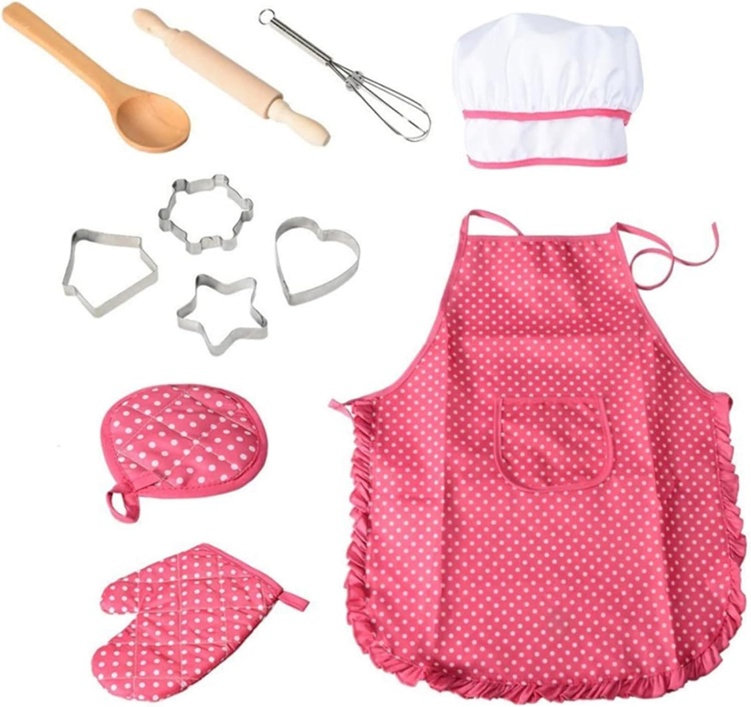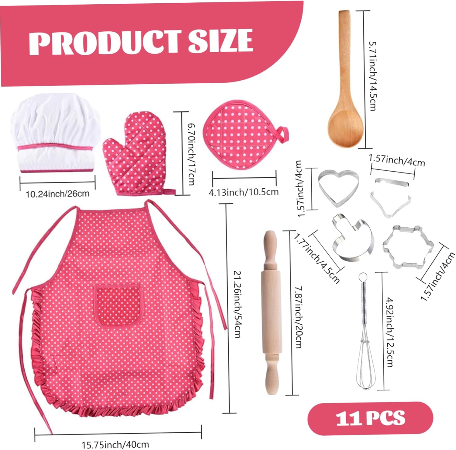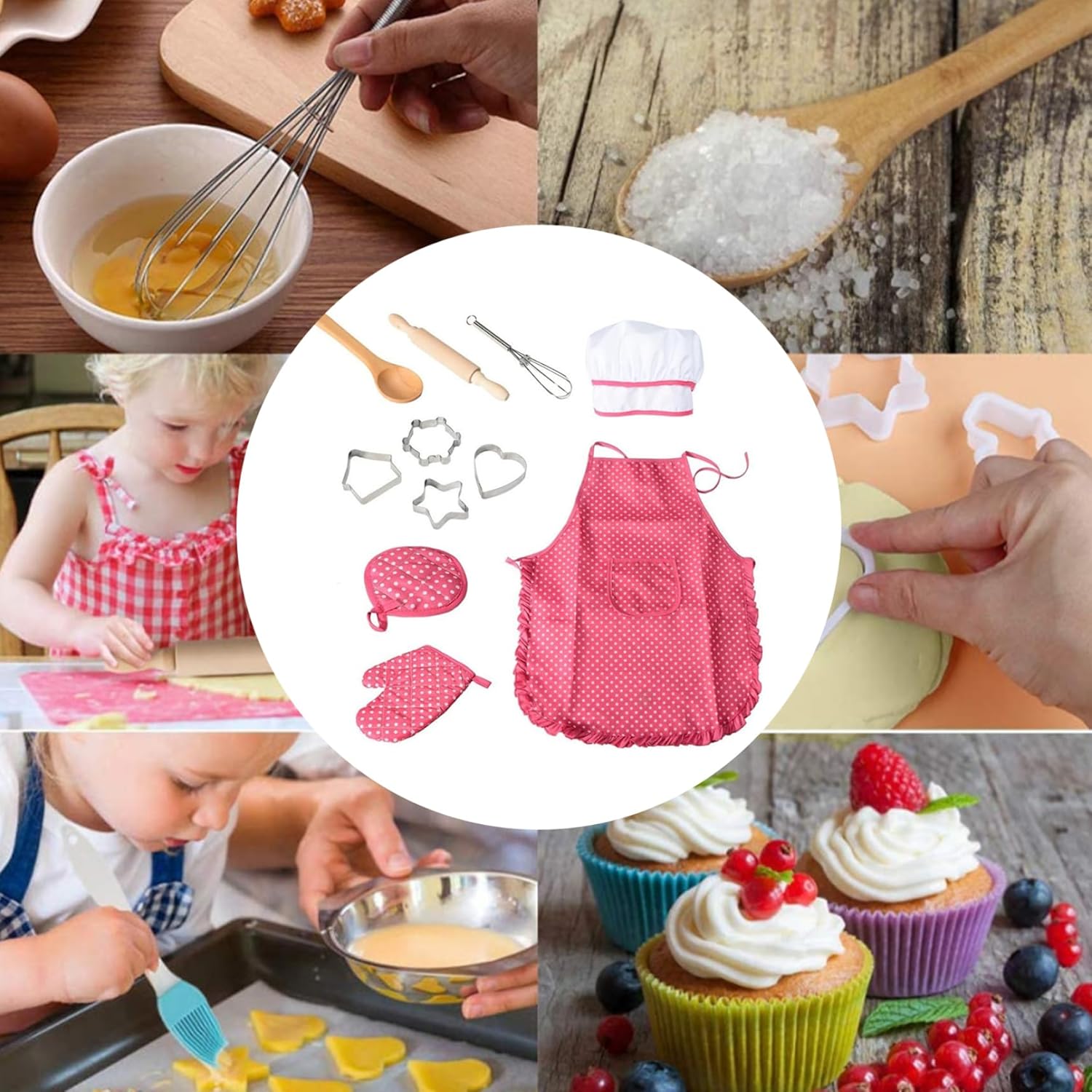 Facile da pulire: il grembiule lavabile in lavatrice e gli utensili da cucina testati per la sicurezza, tra cui il tagliabiscotti e il mattarello, sono completamente funzionali per il gioco in cucina nella vita reale pur essendo di facile manutenzione. Materiali sicuri: realizzati in tessuto privo di BPA, cotone PP, legno e bambù, garantiscono sicurezza e durata..Progettato senza bordi appuntiti per un gioco senza preoccupazioni, che lo rende ideale per i bambini piccoli. Set da gioco completo per la cucina: un divertente set da 11 pezzi che include grembiule, cappello da chef, guanto da forno, piastra riscaldante, cucchiaio di legno, mattarello, mixer manuale e 4 stampini per biscotti..Perfetto per chef in erba dai 3 anni in su. Perfetto per i bambini: viene fornito in una scatola ben confezionata, facile da riporre e trasportare..Una fantastica vacanza, un compleanno o una festa dei bambini che stimola la creatività e rende la cucina divertente per i bambini. Ideale per i bambini: grembiule regolabile e cappello da chef adatti a bambini di tutte le età, con design facili da indossare..Gli utensili di dimensioni perfette sono perfetti per le mani piccole e migliorano l'esperienza di gioco di ruolo.