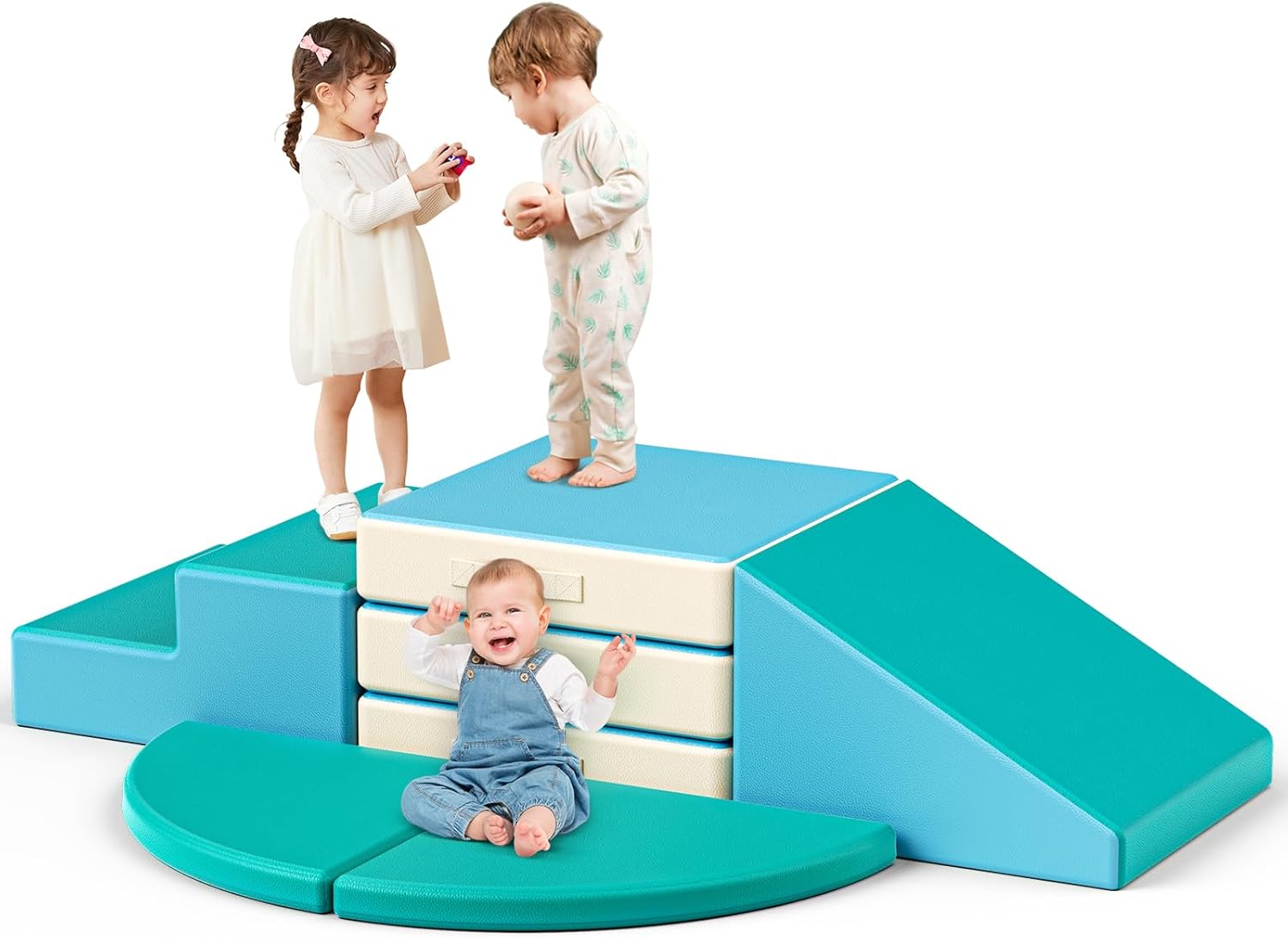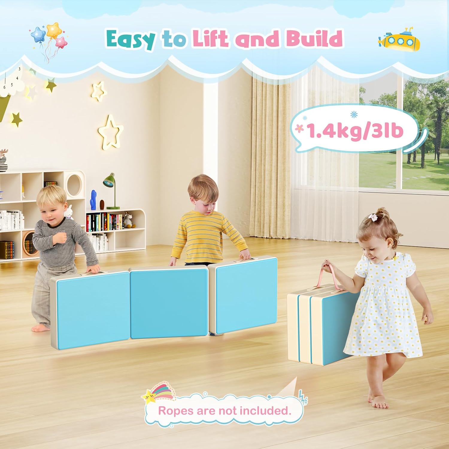 5 blocchi da arrampicata in schiuma Il nostro set da gioco in schiuma da arrampicata include 5 pezzi di schiuma morbida: 1 blocco passo, 1 blocco triangolare, 1 tappetino rettangolare pieghevole e 2 tappetini semicircolari. Ogni pezzo è progettato per ispirare l'immaginazione infinita, iniziando un emozionante viaggio di impilamento e creatività! Sicuro e stabile Ogni blocco da arrampicata per bambini si collega saldamente con chiusure a gancio e anello, garantendo stabilità e sicurezza durante il gioco. Realizzato con materiali certificati CE che sono atossici, inodore e delicati sulla pelle, i genitori possono sentirsi sicuri mentre il loro bambino esplora e gioca. Materiali Preium Riempiti con cotone perlato ad alta densità, questi blocchi da arrampicata sono morbidi, resistenti e mantengono la forma per fornire un supporto stabile. La copertura impermeabile in pelle PU è facile da pulire e mantenere: basta pulire con un panno umido per mantenerla fresca. Sviluppo delle abilità Questo set da gioco morbido aiuta i bambini a praticare camminare, gattonare, arrampicarsi e persino riposare. Incoraggia il gioco attivo, migliorando le capacità di equilibrio e la coordinazione occhio-mano per uno sviluppo motorio a tutto tondo. Leggero e versatile Leggero e facile da spostare, questi blocchi da arrampicata per bambini sono ideali per case, scuole materne e centri di sviluppo del bambino. Perfetti sia per il gioco individuale che per le attività di gruppo, supportano la creatività e le capacità motorie in vari contest