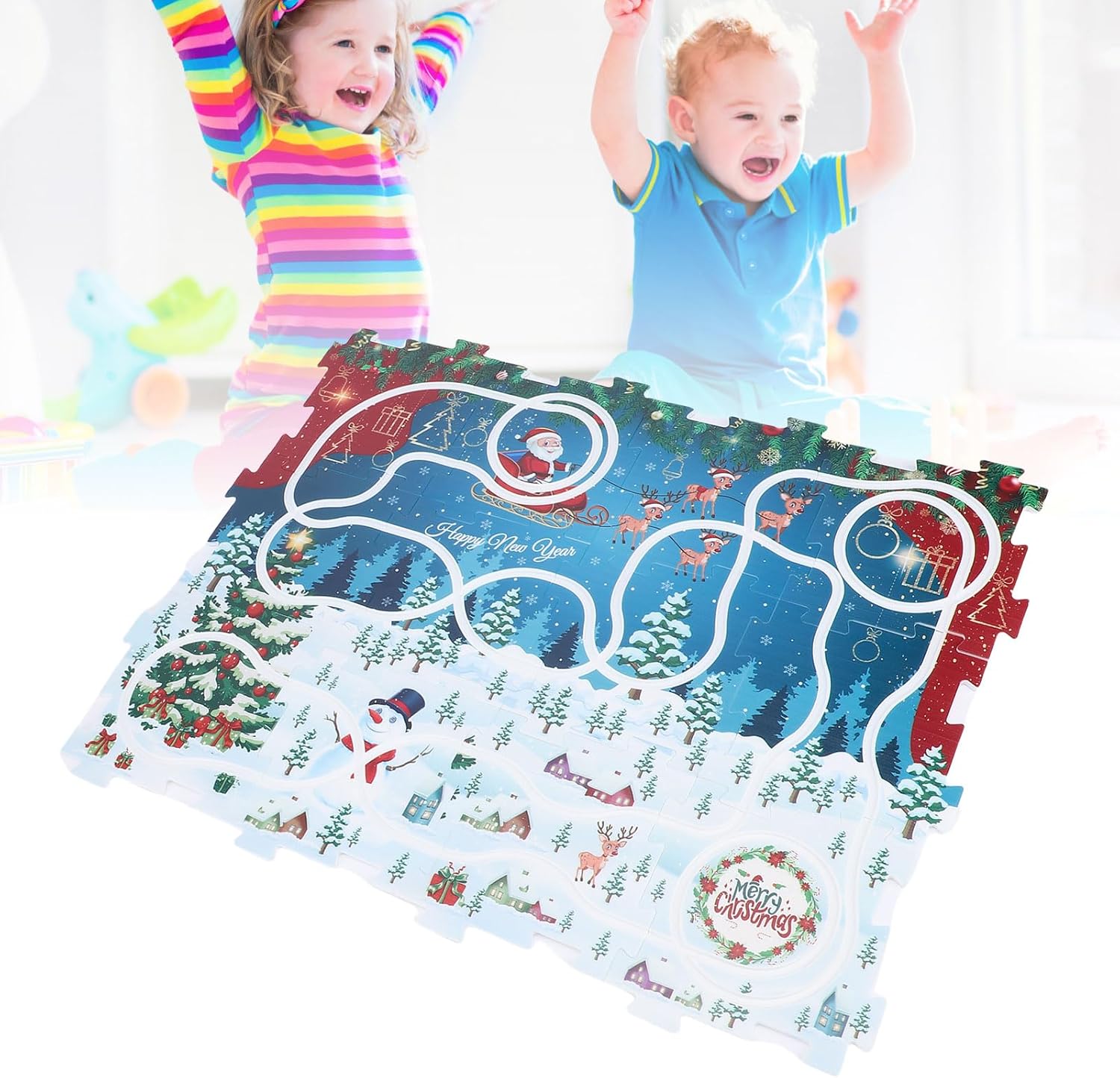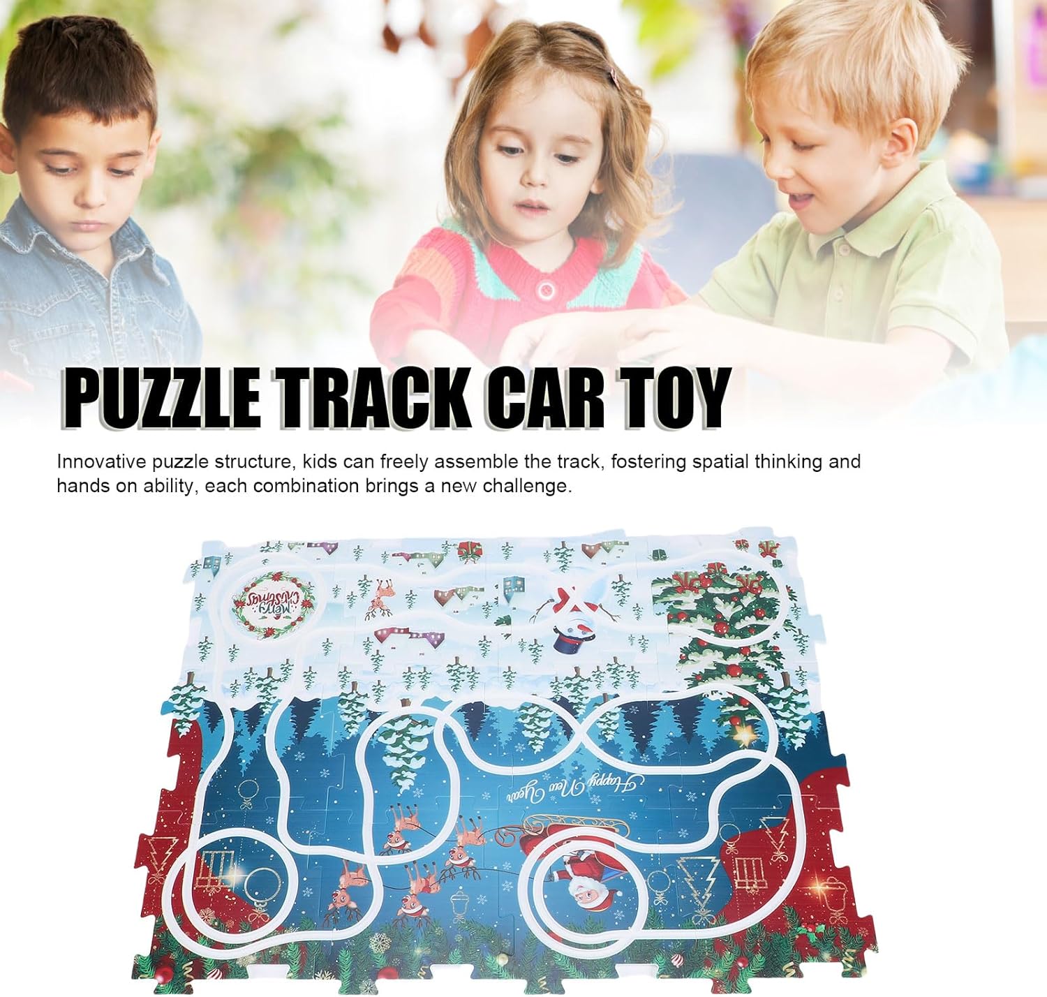 Tema natalizio: il tracciato del puzzle sul pavimento adotta il tema natalizio, pieno di atmosfera festosa, ispirando l'interesse dei bambini per i festival, educativo e divertente, migliorando la cognizione e l'immaginazione. Pista stile puzzle: struttura puzzle innovativa, i bambini possono assemblare liberamente la pista, favorendo il pensiero spaziale e l'abilità pratica, ogni combinazione porta una nuova sfida. Pieno di divertimento: abbinato al modello di trenino e agli accessori per i binari di Natale, è possibile condurre esperimenti dinamici sui binari, migliorando l'interattività e l'intrattenimento del gioco. Materiale sicuro: questo set da gioco per auto con pista puzzle è realizzato in plastica ABS , i bordi lisci garantiscono la sicurezza dei bambini durante il gioco, offrendo ai genitori tranquillità. Giocattolo educativo: questo giocattolo combina puzzle, costruzione di piste e ragionamento logico per esercitare la concentrazione dei bambini, la coordinazione occhio-mano e le capacità di risoluzione dei problemi.