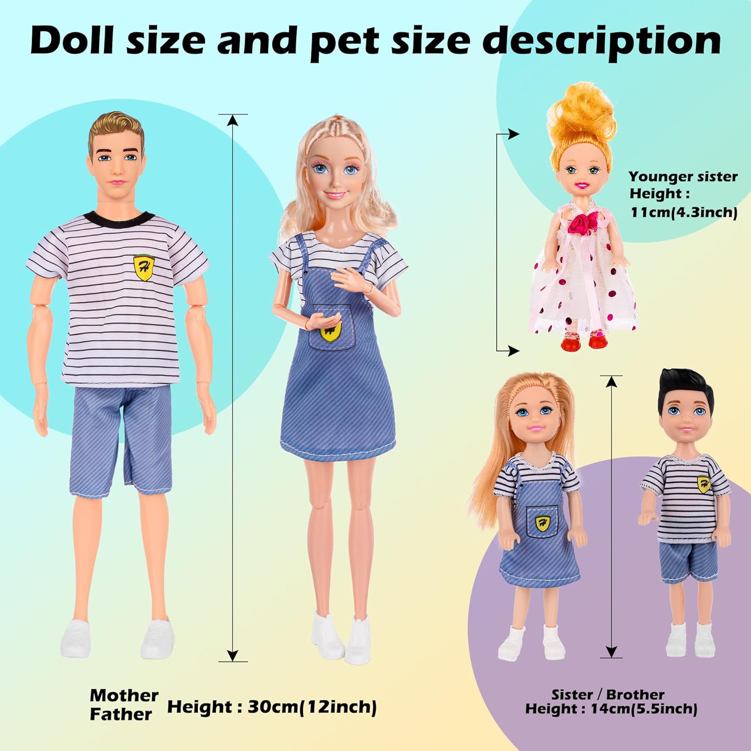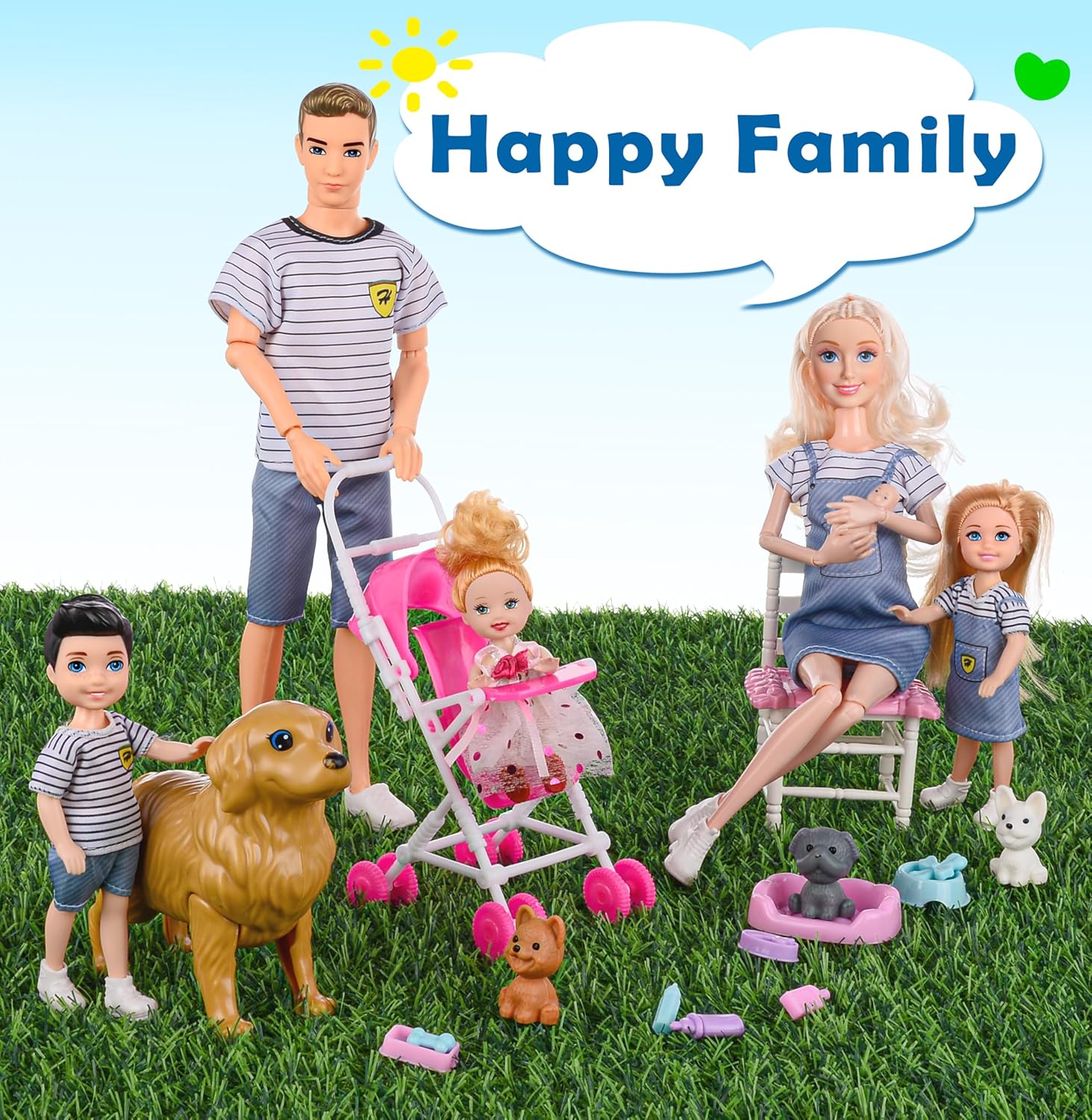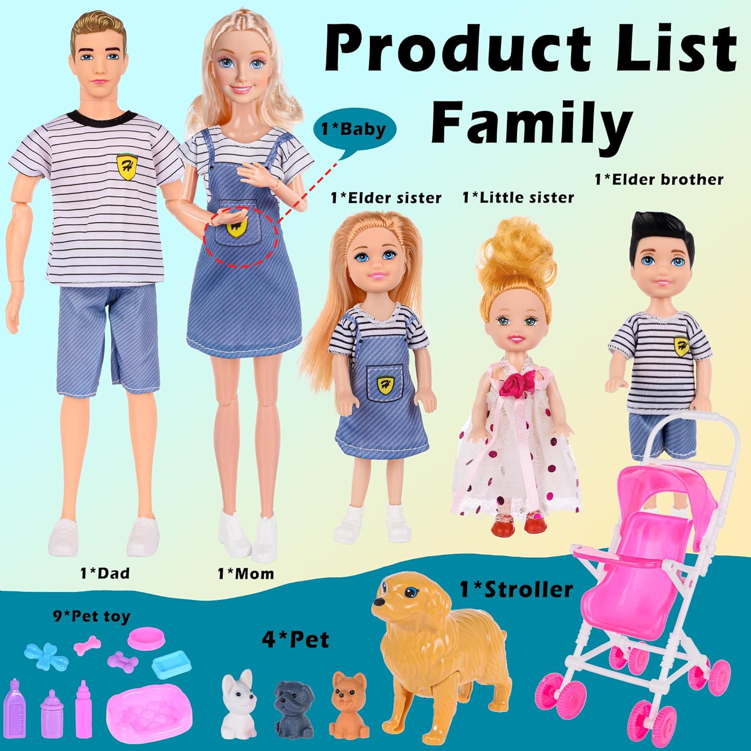 Riceverete: 1 bambola madre incinta con baby doll, 1 bambola del papà, 2 bambole figlia, 1 bambola figlio, 3 cuccioli, 1 cane grande, giocattolo per cani, accessori da bagno e 1 adorabile passeggino per infinite avventure di gioco di ruolo. Famiglia completa + set passeggino: creatività con una famiglia di bambole da 6 persone (mamma incinta, papà, 3 bambini e bambino) più 4 animali domestici, accessori e un nuovo passeggino. Perfetto per raccontare storie, mantenere e gioco fantasioso. Movimento dinamico e gioco realistico: le bambole hanno teste, braccia e gambe girevoli per una posa realistica. Il passeggino liscio aggiunge realismo e consente ai bambini di eseguire gite in famiglia, passeggiate e routine quotidiane. Design sicuro e durevole: queste bambole e passeggini sono realizzati in PVC di alta qualità atossico. Le superfici facili da pulire garantiscono divertimento senza problemi per i bambini e la pace per i genitori. Rafforzare la creatività e le abilità sociali: incoraggia a raccontare storie, empatia e lavoro di squadra mentre i bambini giocano la vita familiare, la cura degli animali domestici e le routine del bambino con il passeggino, ideale per le partite da solista o di gruppo. Avventure ispirate al passeggino: il passeggino incluso apre nuovi scenari: gite al parco, shopping o legami tra fratelli. Un regalo premuroso per compleanni, vacanze o bambini fantasiosi di età compresa tra 3 e 12 anni!