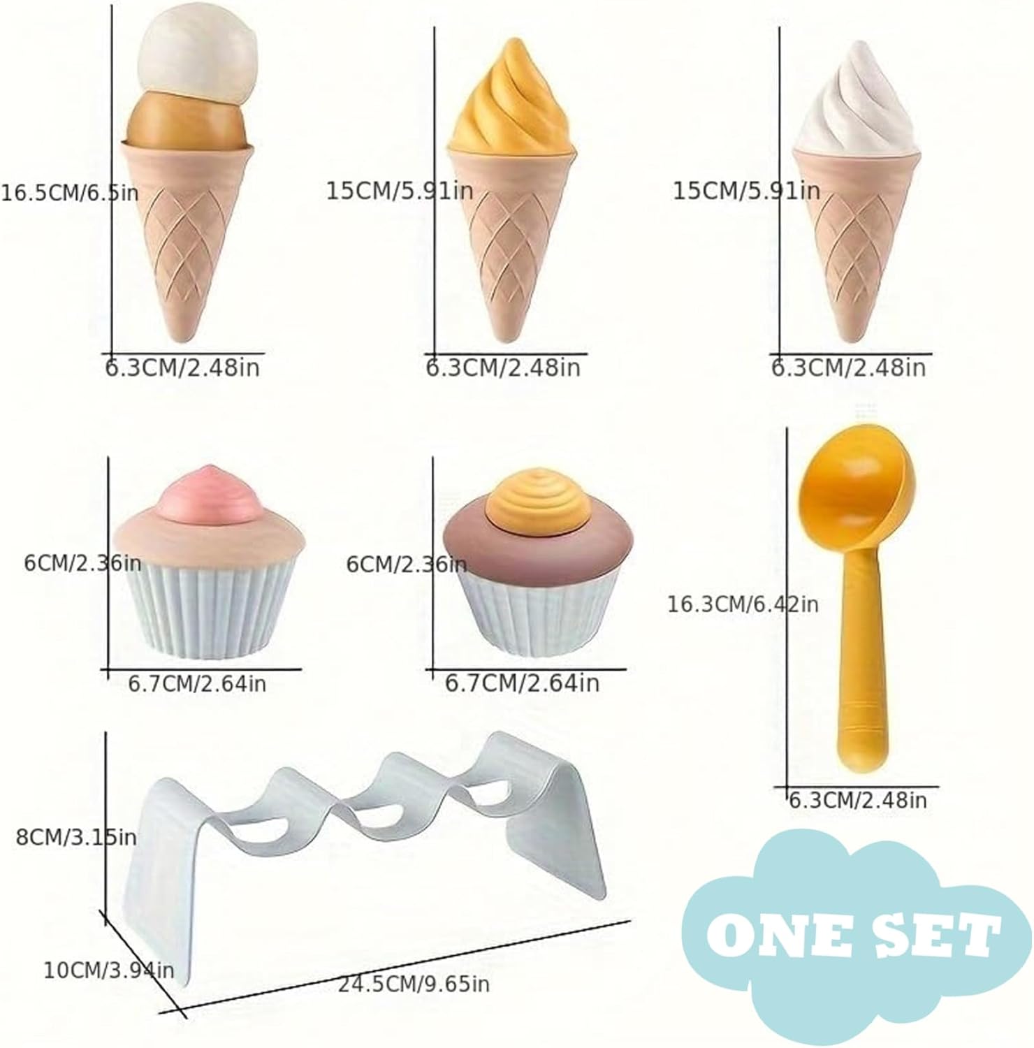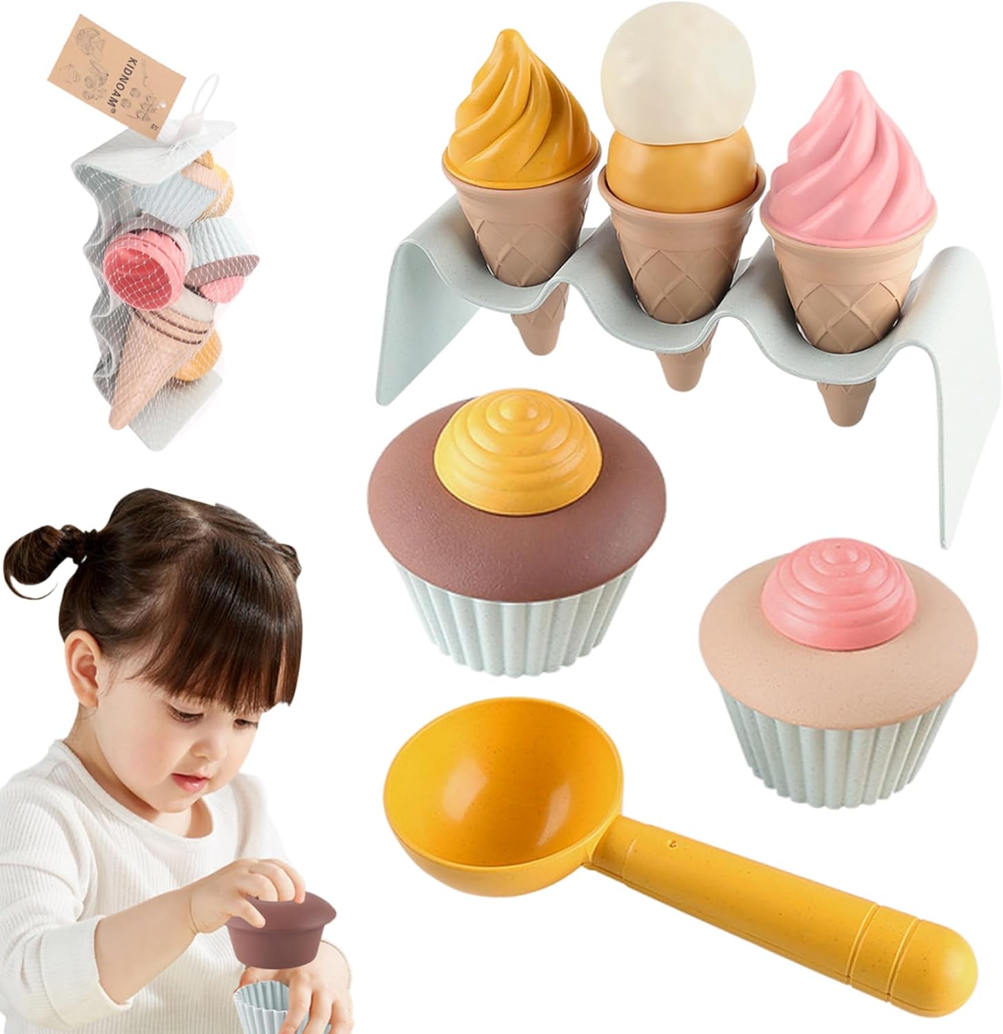 Design staccabile e interattivo: caratterizzato da un design staccabile, il set di gelati da gioco per bambini consente ai bambini di assemblare e personalizzare i loro gelati, favorendo la creatività e l'immaginazione durante il gioco. Versatile e adatto ai bambini: il set da gioco per il gelato è progettato con dimensioni a misura di bambino adatte a vari ambienti di gioco come casa, scuola materna, spiaggia e giardino, offrendo infinite opportunità di gioco al chiuso e all'aperto. Sicuro e robusto: realizzato in materiale di polipropilene (PP) solido, robusto e liscio, non tossico, sicuro per i bambini e può essere lavato con acqua calda, garantendo un uso duraturo. Vantaggi per lo sviluppo: questo set di giocattoli per il gelato non è solo divertente, è anche educativo!.Aiuta a sviluppare l'immaginazione, le capacità motorie, le abilità sociali, la coordinazione occhio-mano e rafforza le relazioni genitore-figlio attraverso il gioco interattivo. Set da 7 pezzi: regala al tuo piccolo un'esperienza di gelato realistica con questo set da 7 pezzi..Include 3 coni gelato colorati, 2 adorabili cupcake, 1 cucchiaio per servire e un pratico porta coni..Perfetto per scatenare giochi fantasiosi e creare dolci ricordi!