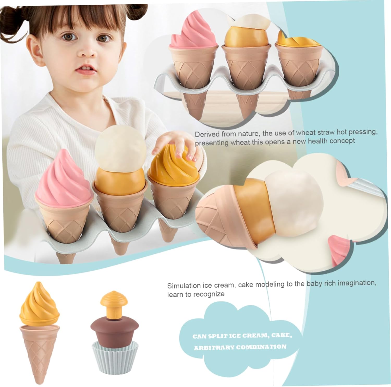 Vantaggi per lo sviluppo: questo set di giocattoli per il gelato non è solo divertente, è anche educativo!.Aiuta a sviluppare l'immaginazione, le capacità motorie, le abilità sociali, la coordinazione occhio-mano e rafforza le relazioni genitore-figlio attraverso il gioco interattivo. Set da 7 pezzi: regala al tuo piccolo un'esperienza di gelato realistica con questo set da 7 pezzi..Include 3 coni gelato colorati, 2 adorabili cupcake, 1 cucchiaio per servire e un pratico porta coni..Perfetto per scatenare giochi fantasiosi e creare dolci ricordi! Design staccabile e interattivo: caratterizzato da un design staccabile, il set di gelati da gioco per bambini consente ai bambini di assemblare e personalizzare i loro gelati, favorendo la creatività e l'immaginazione durante il gioco. Versatile e adatto ai bambini: il set da gioco per il gelato è progettato con dimensioni a misura di bambino adatte a vari ambienti di gioco come casa, scuola materna, spiaggia e giardino, offrendo infinite opportunità di gioco al chiuso e all'aperto. Sicuro e robusto: realizzato in materiale di polipropilene (PP) solido, robusto e liscio, non tossico, sicuro per i bambini e può essere lavato con acqua calda, garantendo un uso duraturo.