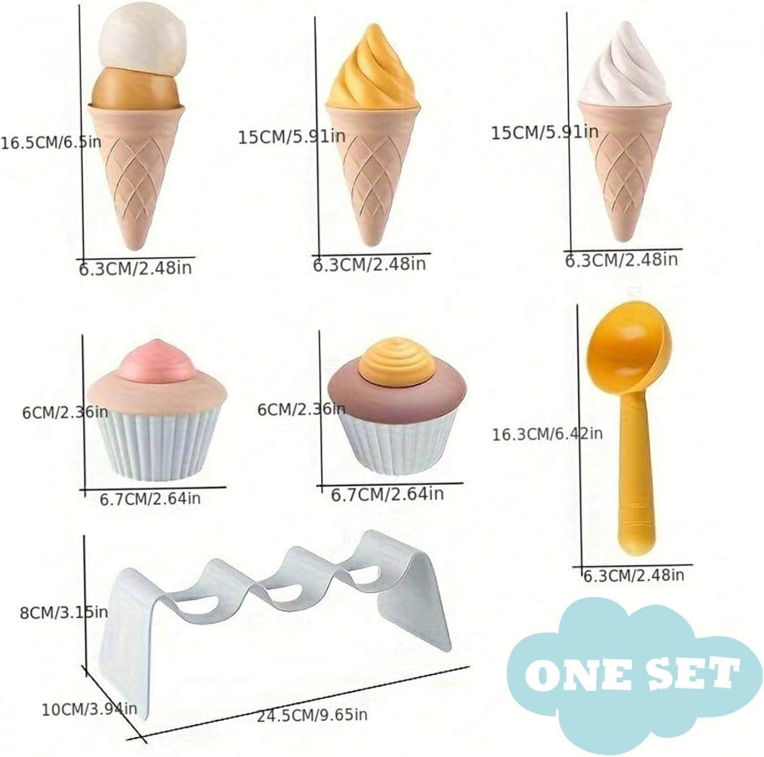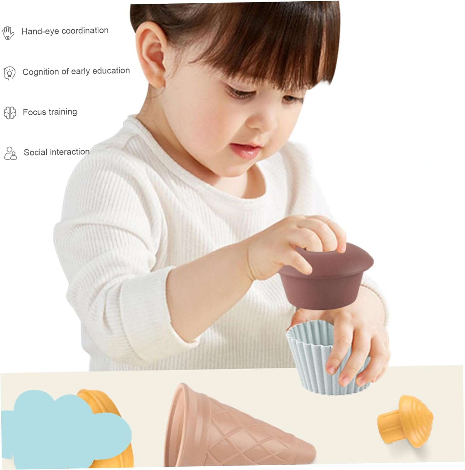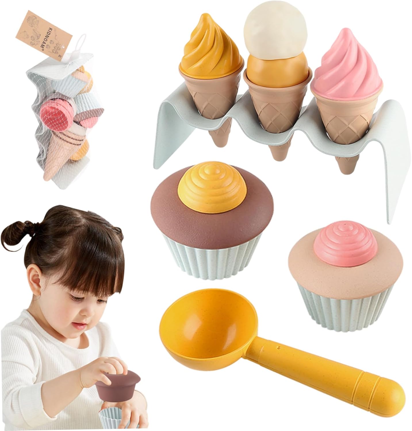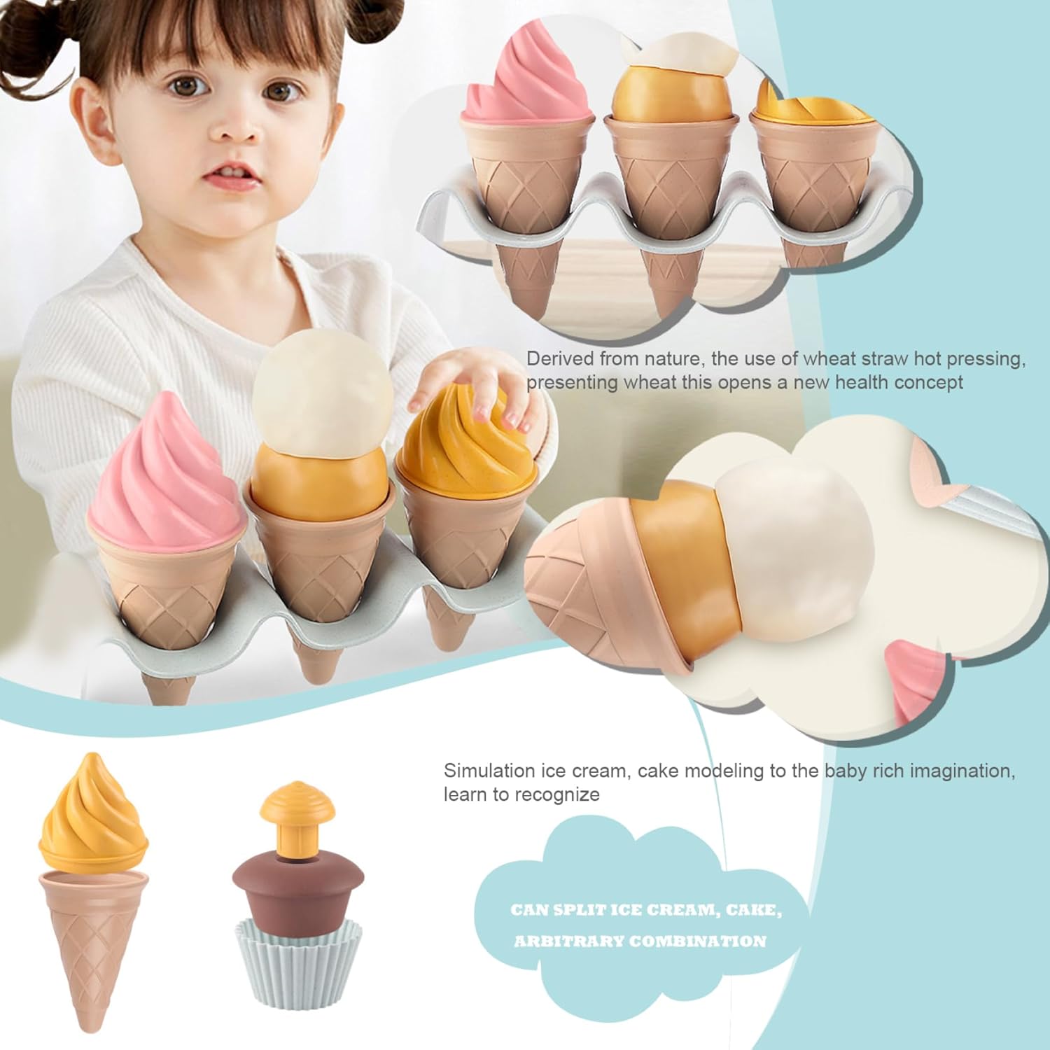 Set da 7 pezzi: regala al tuo piccolo un'esperienza di gelato realistica con questo set da 7 pezzi..Include 3 coni gelato colorati, 2 adorabili cupcake, 1 cucchiaio per servire e un pratico porta coni..Perfetto per scatenare giochi fantasiosi e creare dolci ricordi! Vantaggi per lo sviluppo: questo set di giocattoli per il gelato non è solo divertente, è anche educativo!.Aiuta a sviluppare l'immaginazione, le capacità motorie, le abilità sociali, la coordinazione occhio-mano e rafforza le relazioni genitore-figlio attraverso il gioco interattivo. Design staccabile e interattivo: caratterizzato da un design staccabile, il set di gelati da gioco per bambini consente ai bambini di assemblare e personalizzare i loro gelati, favorendo la creatività e l'immaginazione durante il gioco. Sicuro e robusto: realizzato in materiale di polipropilene (PP) solido, robusto e liscio, non tossico, sicuro per i bambini e può essere lavato con acqua calda, garantendo un uso duraturo. Versatile e adatto ai bambini: il set da gioco per il gelato è progettato con dimensioni a misura di bambino adatte a vari ambienti di gioco come casa, scuola materna, spiaggia e giardino, offrendo infinite opportunità di gioco al chiuso e all'aperto.