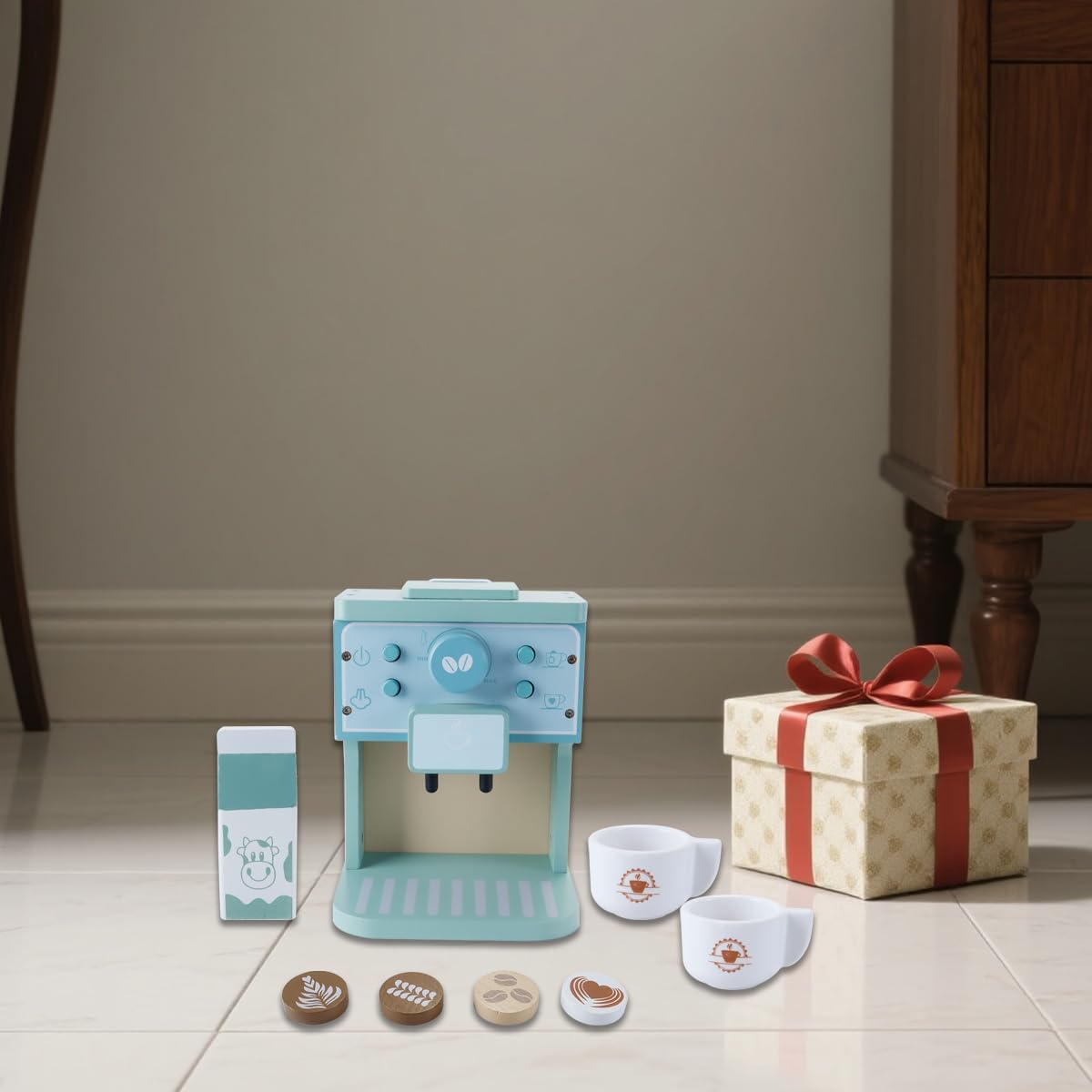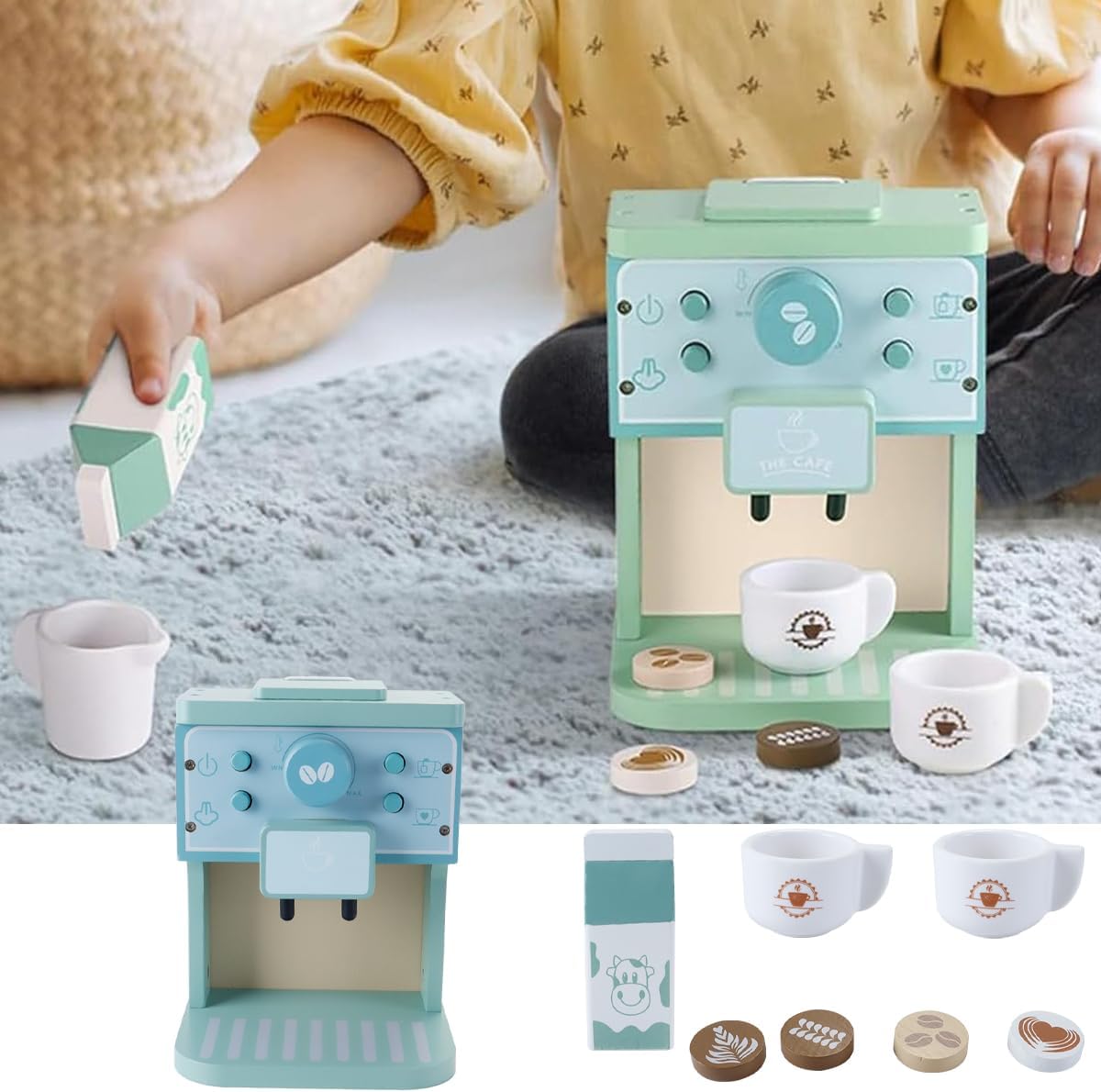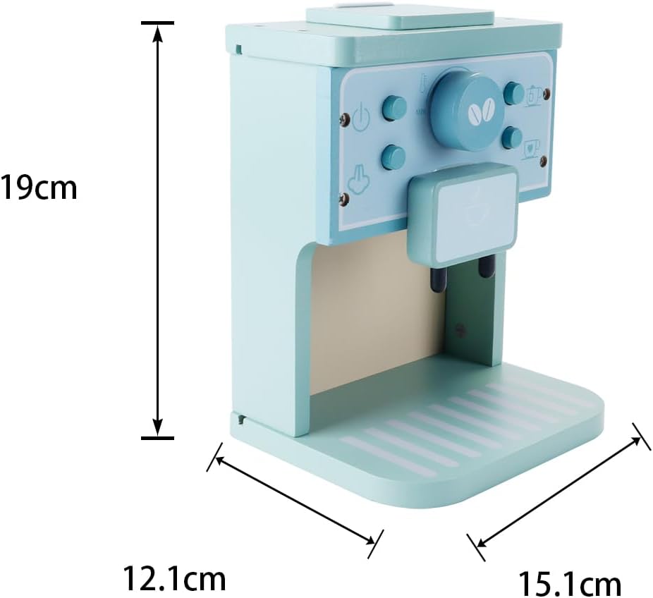 Materiale e design di sicurezza: macchina da caffè in legno, il colore è caldo e morbido e non presenta anomalie. Un angolo è stato lucidato. La forma previene le forature e può essere utilizzata senza esitazione. Pulsanti premuti: la macchina da caffè in legno è dotata di ricchi abiti e accessori completi, e anche i pulsanti della macchina da caffè in legno da cucina giocattolo sono premuti. È possibile ruotare i pulsanti della macchina da caffè per regolare il livello di macinatura e la temperatura del caffè. Divertimento assicurato: con pulsanti rotanti, pulsanti e un pratico macinacaffè, questo set offre infinite possibilità di gioco creativo. I 4 diversi design per la Latte Art stimolano la creatività. Macchina da caffè per la cucina giocattolo: fai conoscere ai più piccoli il mondo della preparazione del caffè con il set per la cucina giocattolo! Questa macchina da caffè realistica contiene tutto il necessario per divertirsi! 1 macchina da caffè, 2 tazze, 1 cartone del latte e 4 decorazioni per la Latte Art. Significato educativo: con la macchina da caffè Play, è possibile apprendere l'intero processo di preparazione del caffè, trasformandolo in un'esperienza di apprendimento entusiasmante.