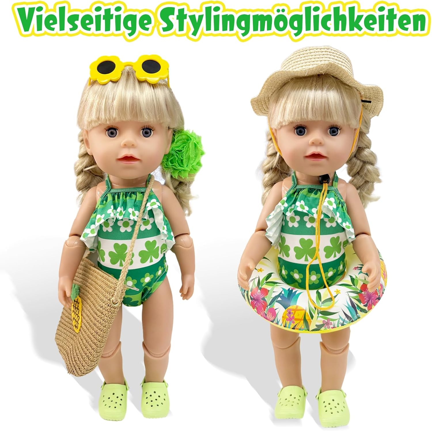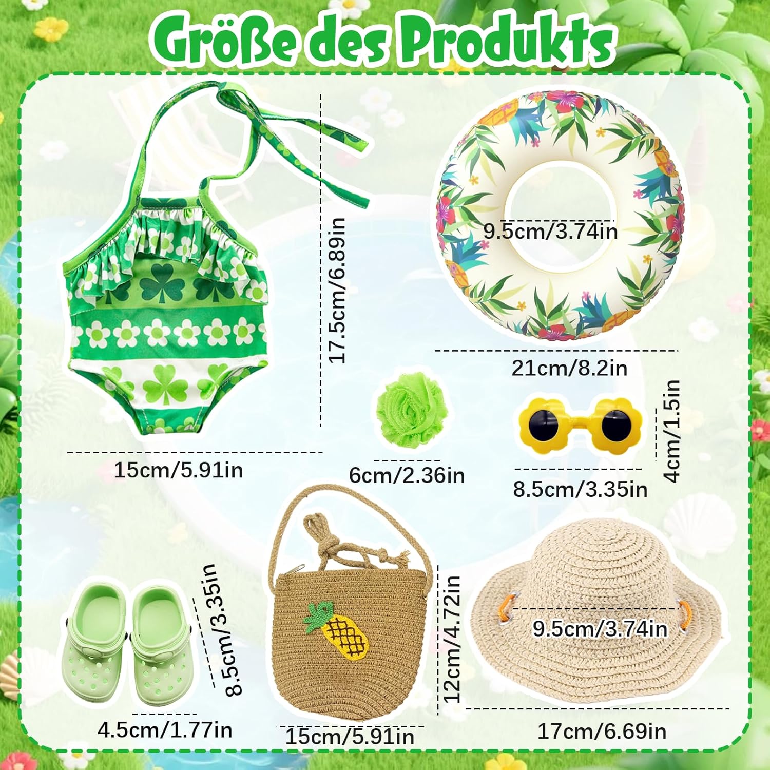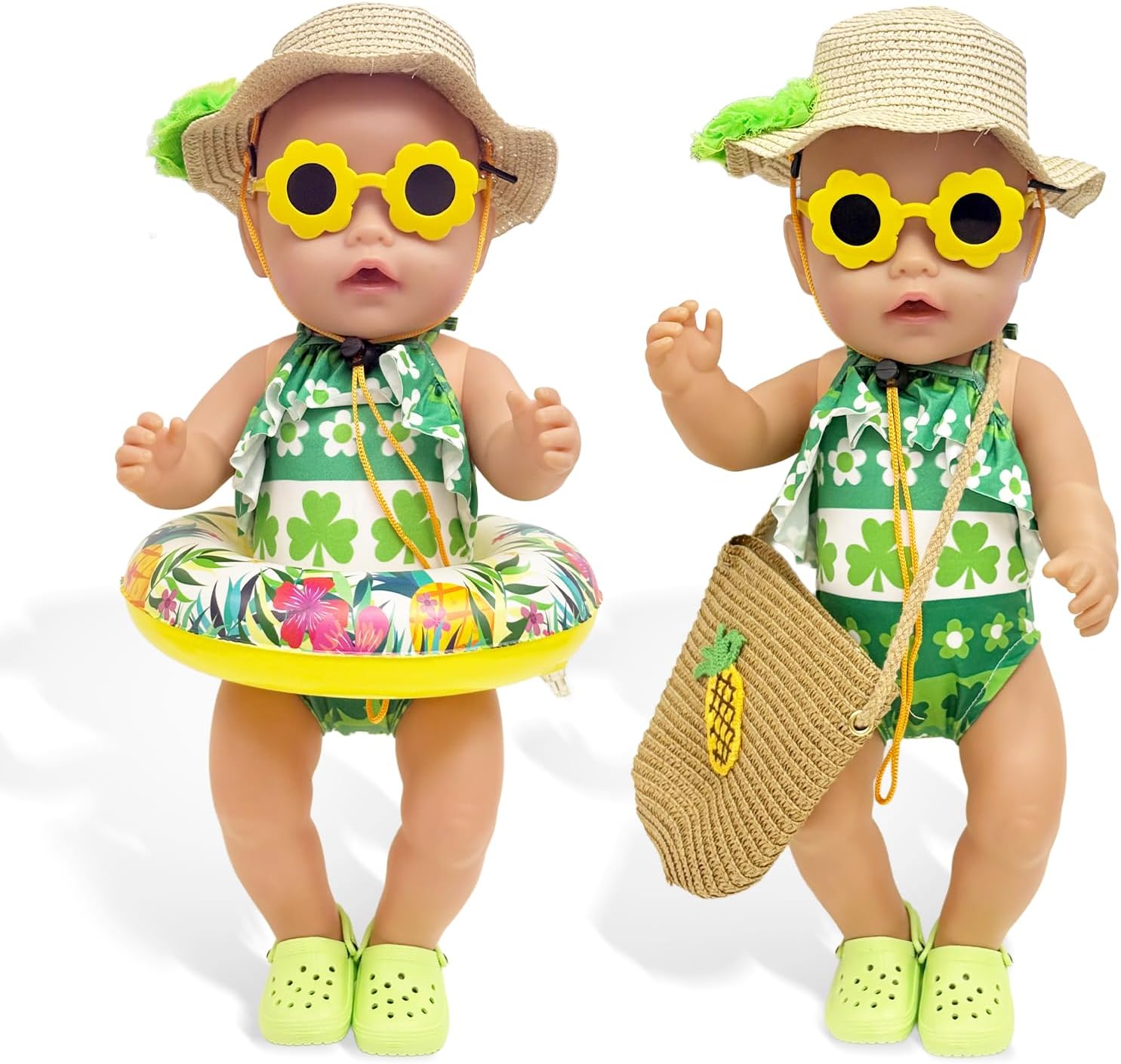 Vestiti estivi per bambole con motivo a trifoglio: questo adorabile set da bagno verde per bambole con motivo a trifoglio dona il look estivo perfetto per le bambole. La tuta è progettata con cura e ideale per giochi di ruolo in spiaggia o in piscina. 【Tutto è qui per una giornata soleggiata con le bambole】 Il kit include: 1 costume da bagno, 1 anello da nuoto realistico, 1 paio di scarpe verdi, 1 paio di occhiali da sole, 1 fermaglio per capelli, 1 cappello di paglia e 1 borsa intrecciata ad ananas: accessori ideali per le bambole per i giochi estivi. (Bambola non inclusa) Vestibilità perfetta e facile da usare: si adatta a bambole da 35-45 cm, facile da indossare, facile da abbinare ad altri accessori. (La borsa intrecciata ha una lunghezza regolabile, bambole giocattolo e bambini dell'età appropriata possono usarla.) Promuovi il gioco di ruolo creativo: con questo vestito estivo per bambole, l'immaginazione dei bambini viene stimolata. Perfetto per il gioco educativo quotidiano prezioso e fantasioso. Qualità premium e lavabile: realizzato in tessuto morbido e resistente. Lavabile e resistente: ideale per il piacere di gioco a lungo termine. Idea regalo con valore aggiunto: che si tratti del compleanno, del ritorno a scuola o dell'inizio delle vacanze, questo set di costumi da bagno per bambole offre opportunità di divertimento e apprendimento.