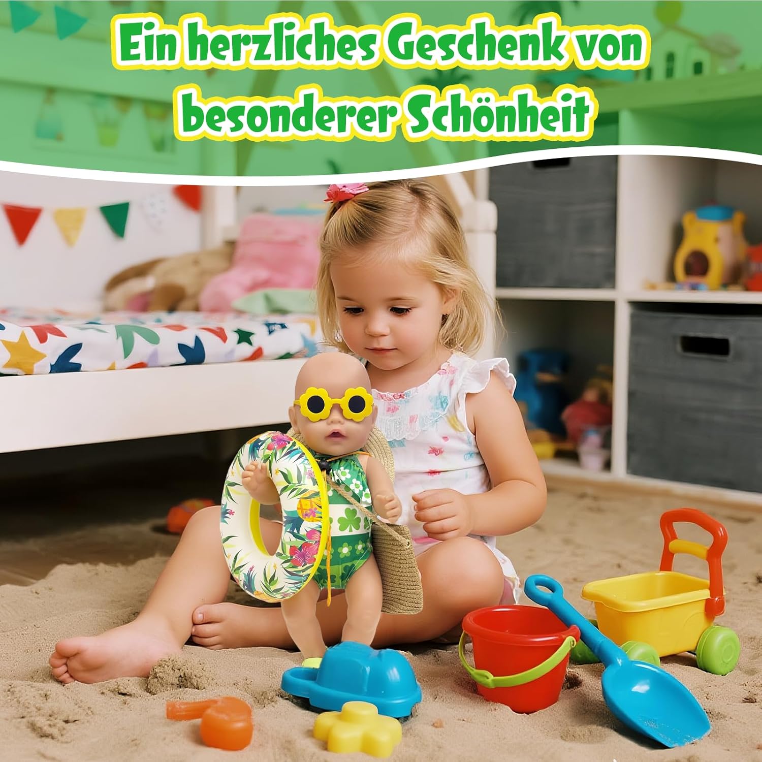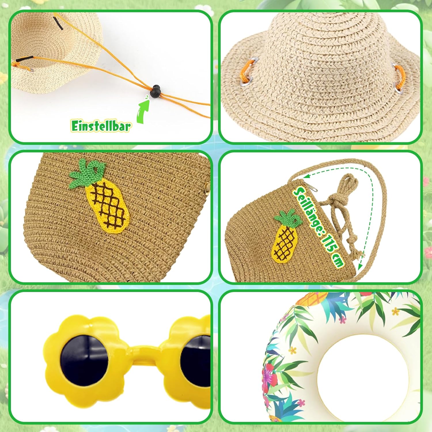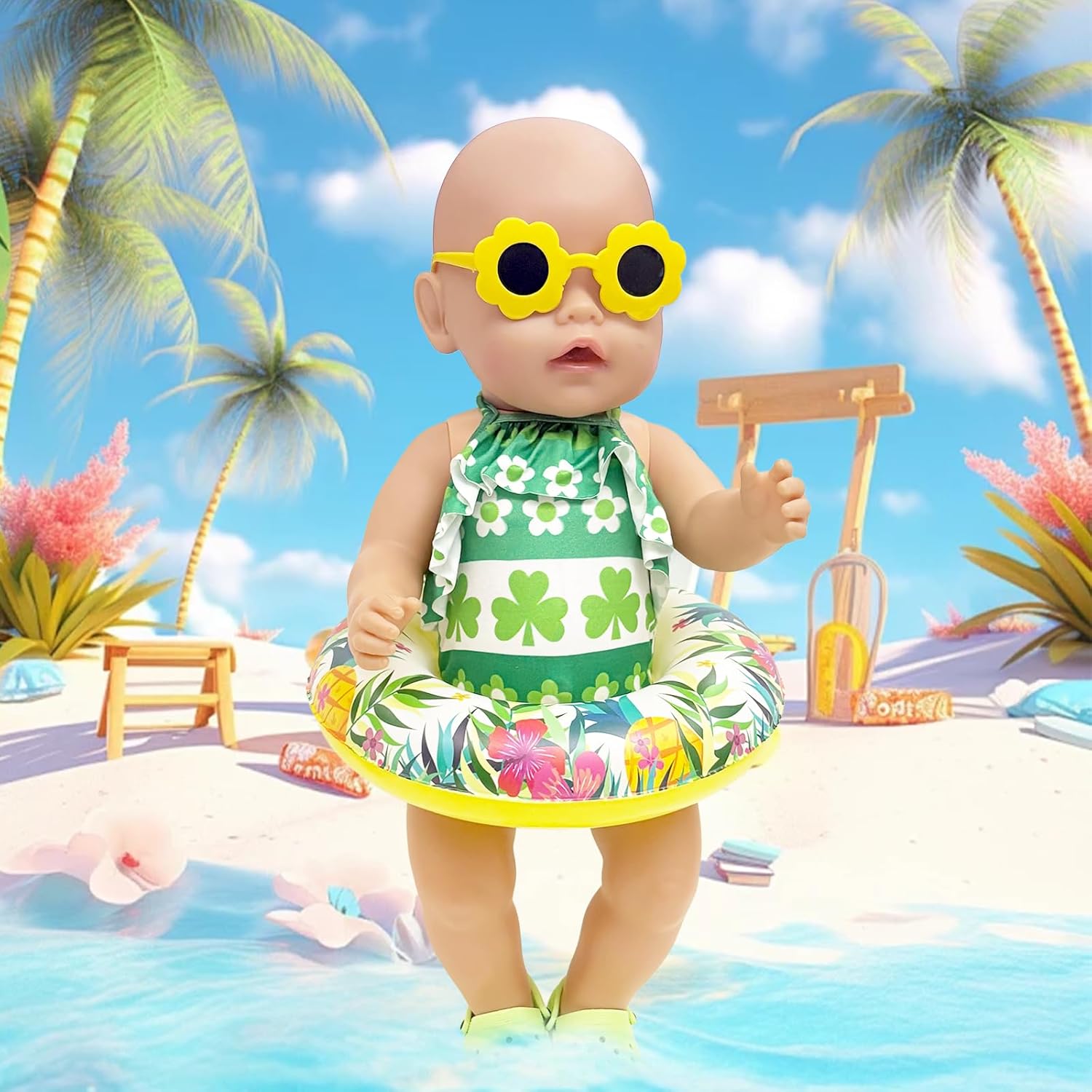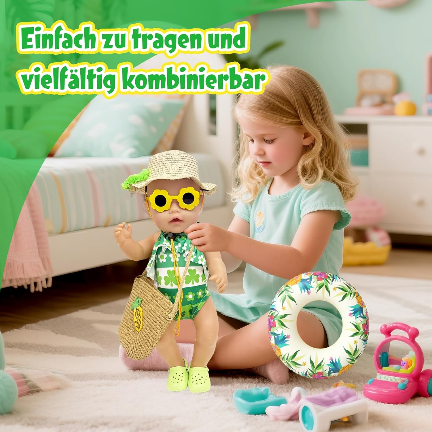 Vestiti estivi per bambole con motivo a trifoglio: questo adorabile set da bagno verde per bambole con motivo a trifoglio dona il look estivo perfetto per le bambole. La tuta è progettata con cura e ideale per giochi di ruolo in spiaggia o in piscina. 【Tutto è qui per una giornata soleggiata con le bambole】 Il kit include: 1 costume da bagno, 1 anello da nuoto realistico, 1 paio di scarpe verdi, 1 paio di occhiali da sole, 1 fermaglio per capelli, 1 cappello di paglia e 1 borsa intrecciata ad ananas: accessori ideali per le bambole per i giochi estivi. (Bambola non inclusa) Vestibilità perfetta e facile da usare: si adatta a bambole da 35-45 cm, facile da indossare, facile da abbinare ad altri accessori. (La borsa intrecciata ha una lunghezza regolabile, bambole giocattolo e bambini dell'età appropriata possono usarla.) Promuovi il gioco di ruolo creativo: con questo vestito estivo per bambole, l'immaginazione dei bambini viene stimolata. Perfetto per il gioco educativo quotidiano prezioso e fantasioso. Qualità premium e lavabile: realizzato in tessuto morbido e resistente. Lavabile e resistente: ideale per il piacere di gioco a lungo termine. Idea regalo con valore aggiunto: che si tratti del compleanno, del ritorno a scuola o dell'inizio delle vacanze, questo set di costumi da bagno per bambole offre opportunità di divertimento e apprendimento.