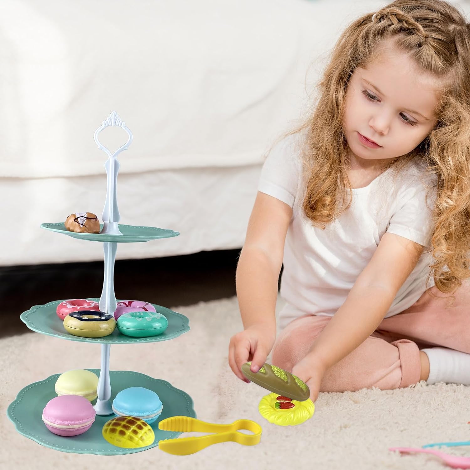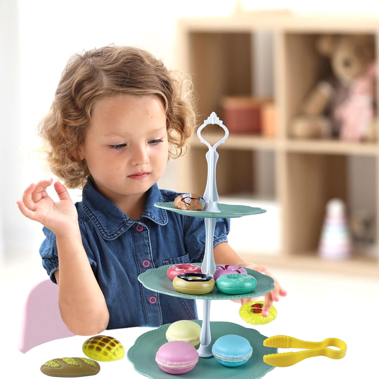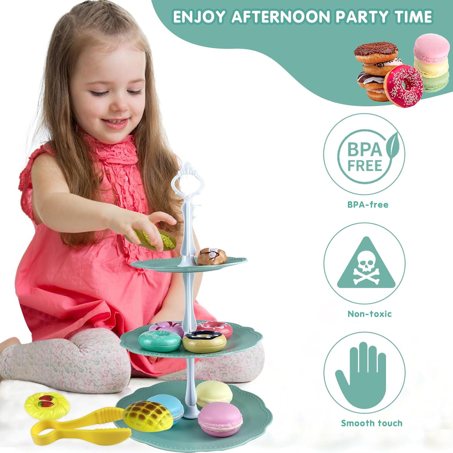 【accessori cucina giocattolo】Riceverai un giocattolo modello di torta in plastica, un set da tè, 18 accessori tra cui: 4 ciambelle, 3 torte, 3 pagnotte, 1 biscotto, 1 piatto da dessert a 3 livelli, 1 pinza, 3 supporti da dessert . Lascia che i bambini sperimentino il divertimento di un pasticciere nei giochi di ruolo e stimolino creatività e immaginazione illimitate 【frutta dessert giocattolo per bambini】Set di dolci per il tè pomeridiano, elementi educativi come il riconoscimento dei colori e lo sviluppo di abilità pratiche consentono ai bambini di apprendere il senso comune della vita attraverso i giochi, promuovere lo sviluppo della coordinazione occhio-mano e del pensiero logico e gettare buone basi per l'apprendimento futuro 【set cucina giocattolo 】Set da dessert per accessori da cucina, tutte le parti sono facili da smontare e pulire, mantenendo i giocattoli igienici e privi di germi. La scatola portaoggetti allegata facilita l'organizzazione e l'organizzazione, aiutando i bambini a sviluppare abitudini ordinate fin dalla tenera età. Il materiale robusto e durevole può resistere al gioco ripetuto dei bambini e accompagnerà a lungo la crescita del tuo bambino 【mini food gioco】Il giocattolo alimentare è un prodotto che i genitori possono accompagnare i propri figli per godersi l'ora del tè insieme e rafforzare il legame genitore-figlio. Bellissimo gioco giocattolo per bambine di 3 4 5 anni. Non è solo un giocattolo, ma anche un ponte che collega le emozioni familiari. È molto adatto come regalo per bambini per compleanni, Natale, Ringraziamento, Pasqua, ecc. 【set da tè giocattoli】Questo set da tè da dessert da cucina è realizzato in materiale plastico/plastico di alta qualità, resistente e con angoli arrotondati per evitare graffi e fornire la protezione più delicata per il tuo bambino