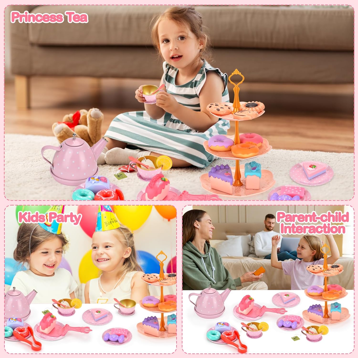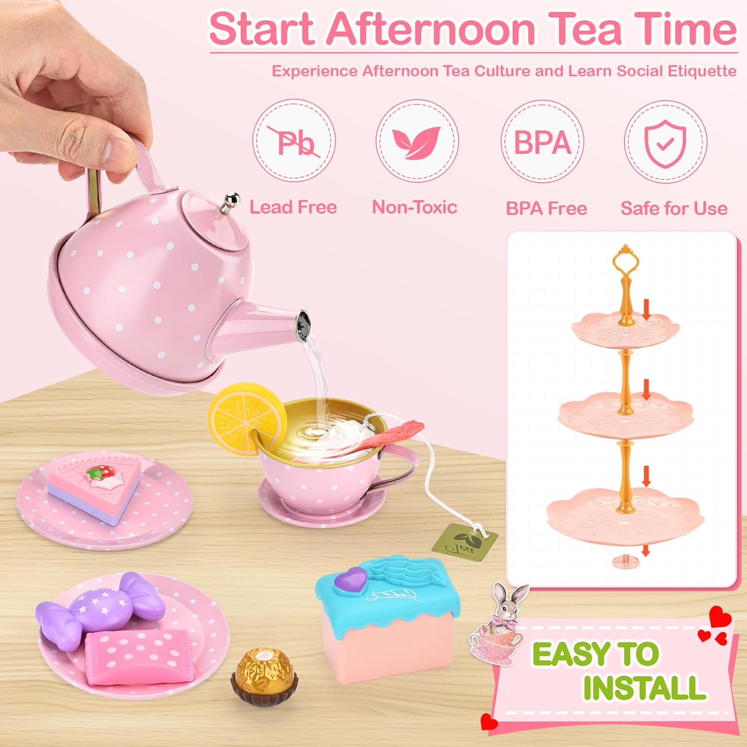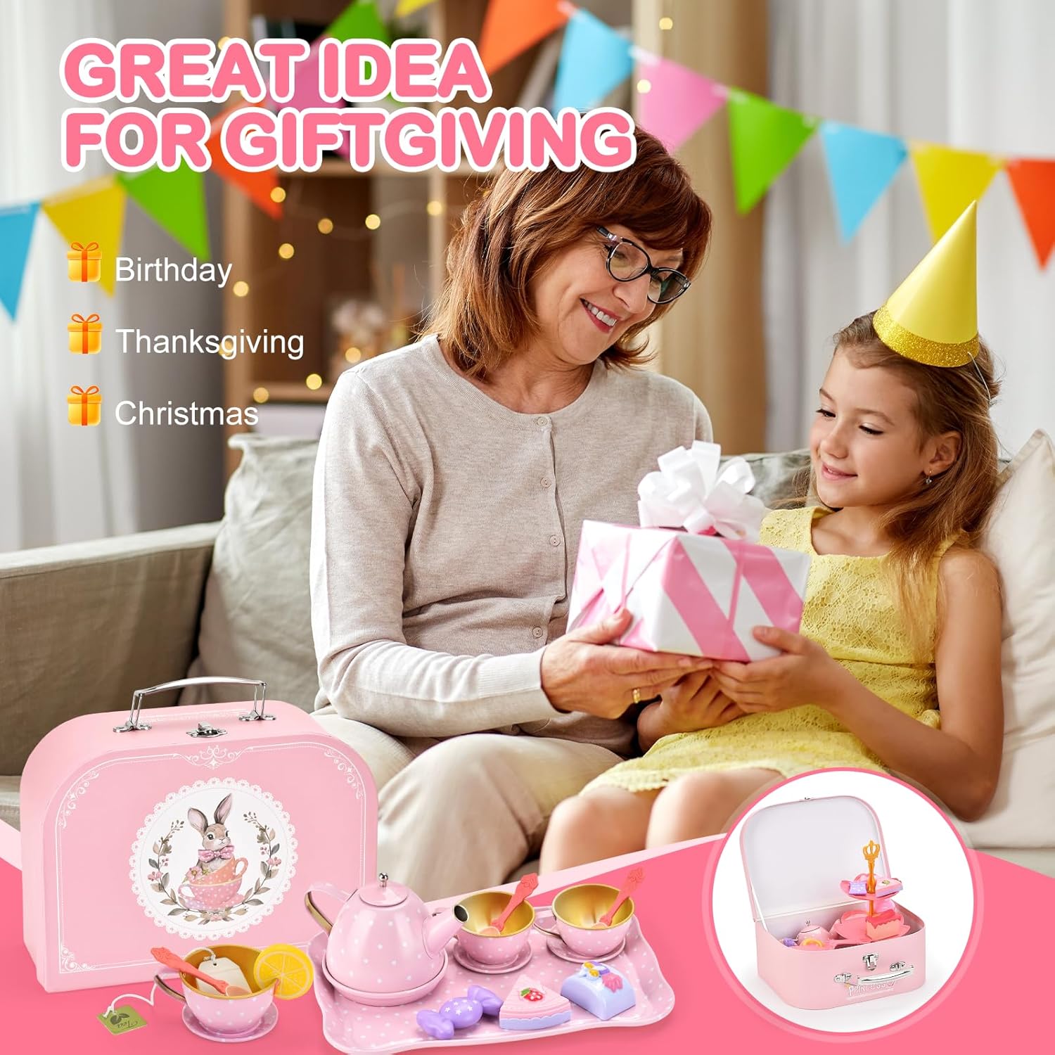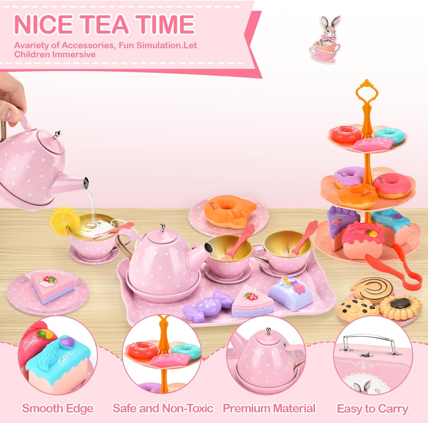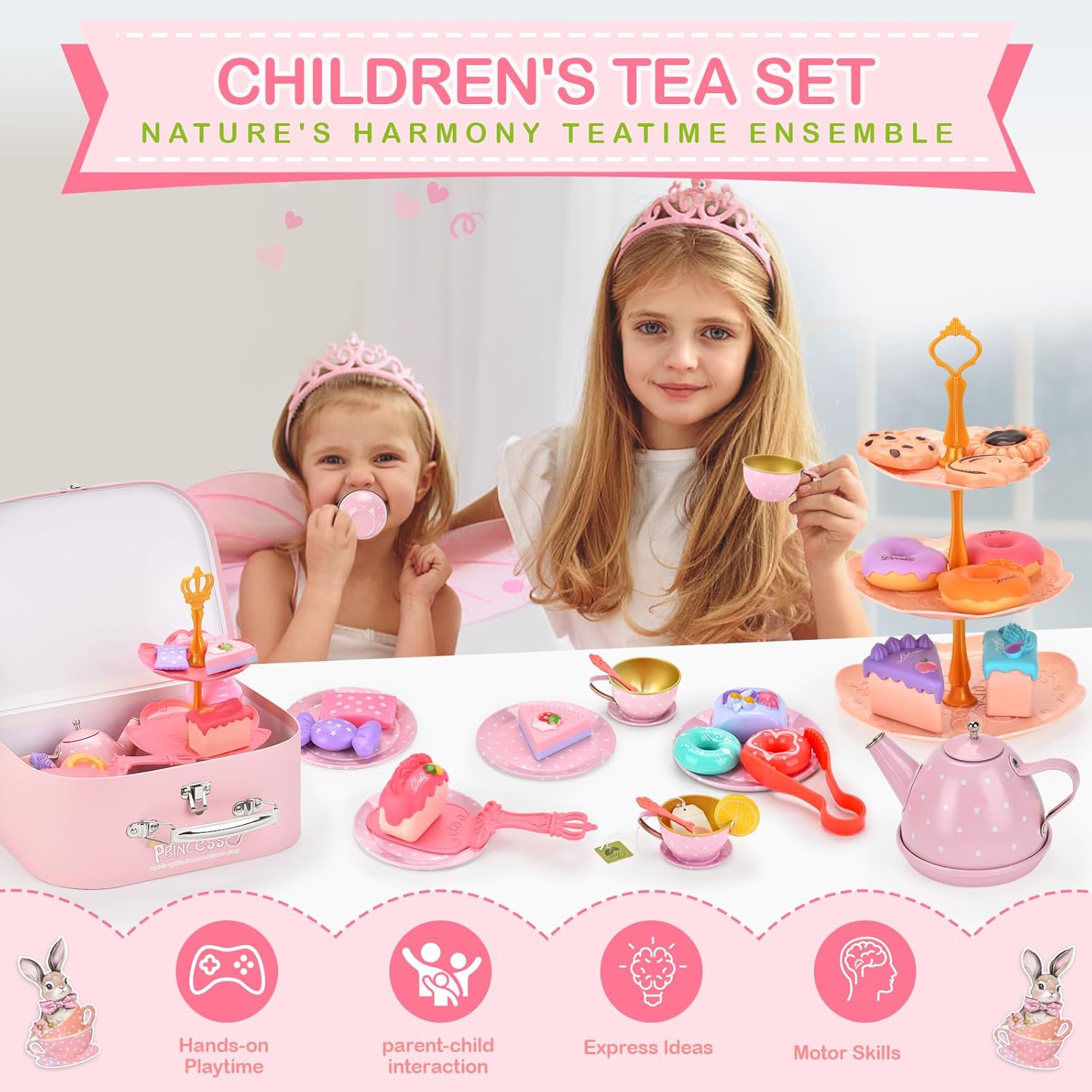 【Il Set Include】Il nostro set da tè in latta include una valigia,una teiera,4 tazze da tè in latta,4 sottobicchieri in latta,4 piatti in latta,4 cucchiai,un porta ciambelle,un vassoio in latta,una spatola per dolci,4 ciambella,5 torta,una molletta per alimenti,2 cupcake,3 biscotti,2 caramelle,1 cioccolato,2 limoni,2 bustine di tè e 3 lecca-lecca. 【Gioco di Finzione del Tè Sicuro】Realizzato in latta di alta qualità e atossico,questo set da tè è sicuro per I bambini.Gli accessori hanno bordi lisci e arrotondati per proteggerli durante il gioco.(nota: Tutti I pezzi possono essere facilmente puliti con un panno umido dopo l'uso e asciugati all'aria.) 【Festa di Finzione del Tè Perfetta】Il nostro set trasforma l'ora del tè in un'esperienza divertente.Il set per la festa del tè include stoviglie sufficienti per 4 persone,così I bambini possono giocare di ruolo con amici o familiari e godersi una magica ora del tè! 【Imparare Giocando】Questo set da tè in latta è perfetto per simulare un piacevole momento del tè pomeridiano,sviluppando le capacità cognitive,sociali ed emotive dei bambini attraverso il gioco e incoraggiando il pensiero,l'apprendimento e la risoluzione dei problemi. 【Un Regalo Prezioso per la Tua Principessa】Ogni bambina ama I giochi di ruolo e il nostro set da tè è progettato per bambine dai 3 agli 8 anni.Il design fantasioso le trasporterà in un mondo da favola e permetterà loro di realizzare I loro sogni da principessa.È un regalo ideale per compleanni,festa dei bambini,halloween,natale o il ringraziamento e porterà alla tua bambina una gioia infinita!