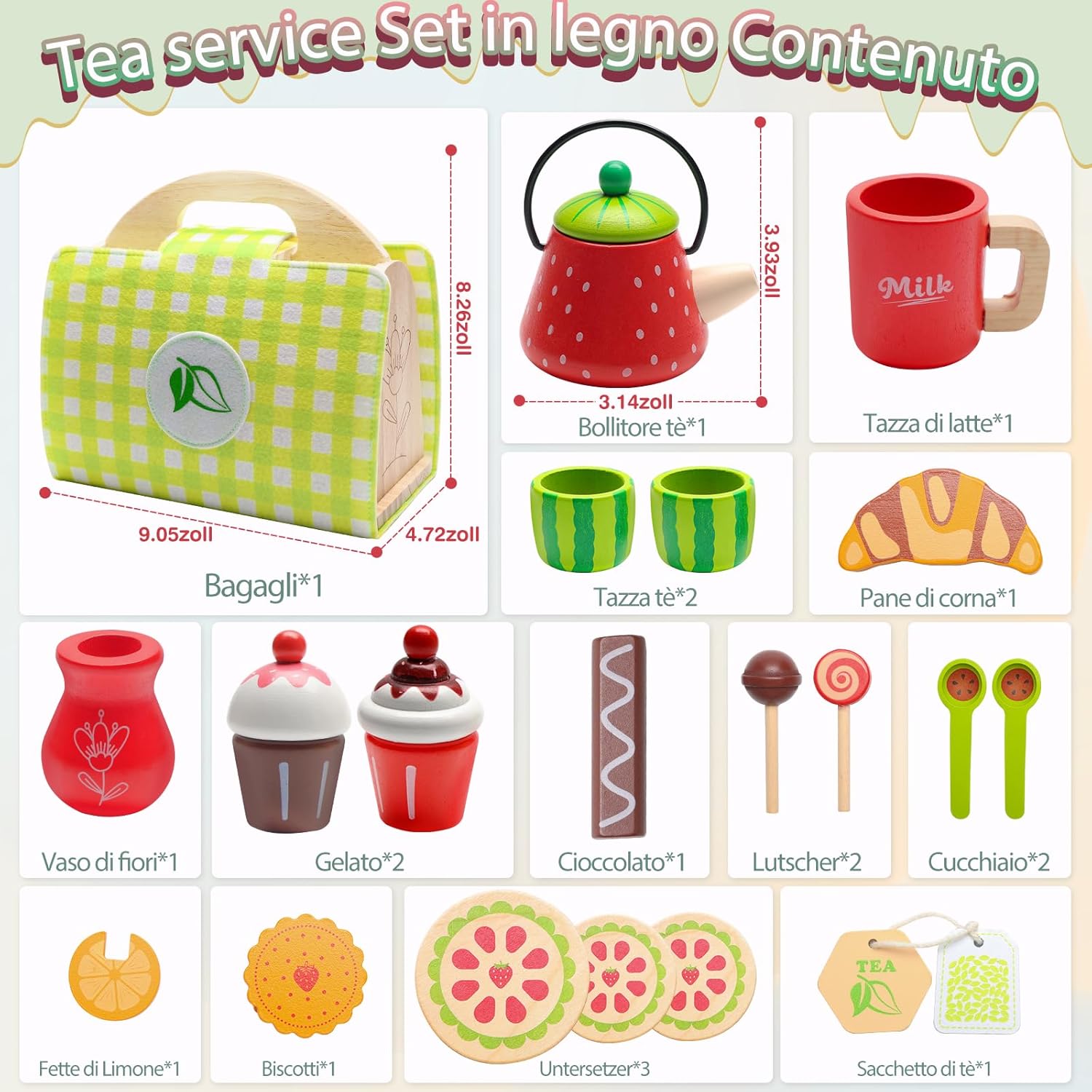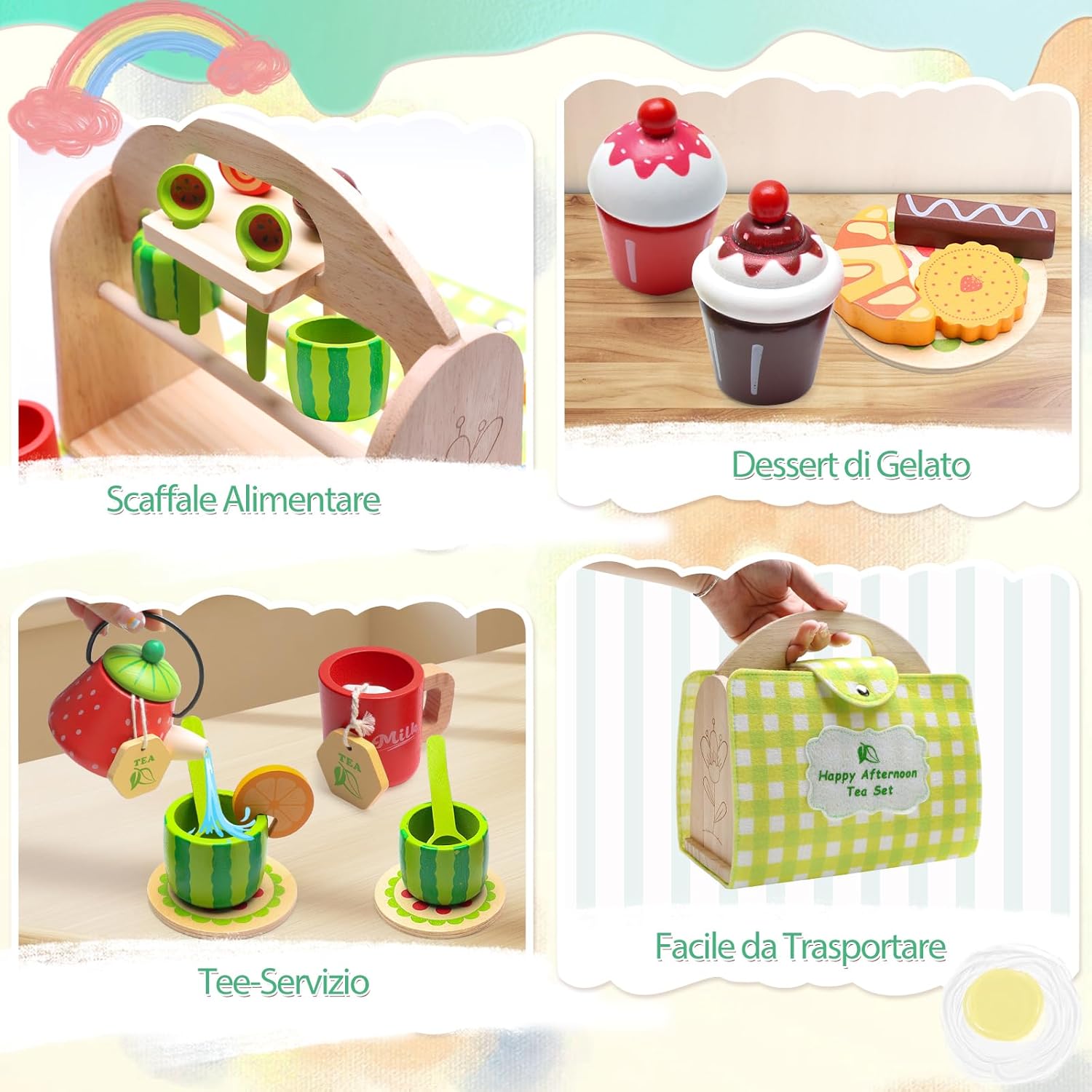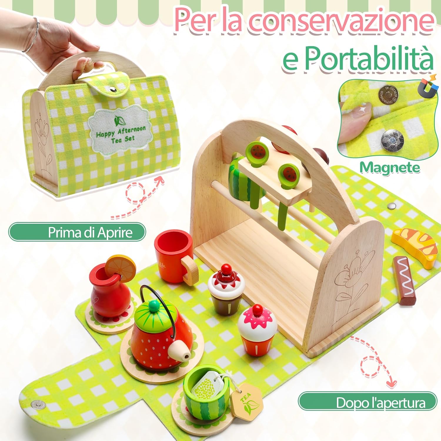 Set da tè per bambini VBACALA: Il set da tè per bambini VBACALA è composto da 23 pezzi, tra cui: valigetta di legno verde*1, teiera*1, tazza*3, ghiaccio*2, fette di limone*1, bustine di tè*1, cioccolato*1, cornetto*1, lecca-lecca*2, cucchiaio*2, biscotti*1, sottobicchiere*3. Gli accessori da cucina per bambini perfetti per far giocare bambine e bambini dai 3 anni in su. Scoprite il divertimento di bere il tè e giocate di ruolo con il vostro bambino Materiale in legno di alta qualità: i nostri accessori da cucina per bambini sono realizzati in legno sicuro che soddisfa i più alti standard di qualità. La superficie liscia è adatta alle mani dei più piccoli ed è il regalo ideale per la cucina dei bambini per un gioco sostenibile Gioco di ruolo creativo: questa valigia giocattolo in legno verde stimola la creatività e lo spirito di scoperta del bambino. Lasciate che costruisca la sua piccola cucina, che serva il tè del pomeriggio e che giochi di ruolo con i più piccoli per sviluppare le abilità sociali e il lavoro di squadra Sorpresa in valigia: il set da tè per bambini viene fornito con una valigia di legno verde in cui i bambini possono facilmente portare con sé i loro “tesori”. Quando si apre la valigia di legno verde, questa viene sostituita da un tappetino verde e da un vassoio per gli utensili da cucina, in modo che i bambini possano divertirsi a cucinare sempre e ovunque Giocattolo da tè all'aperto: che si tratti di una riunione di famiglia o di una gita con gli amici, questo set da gioco per il tè pomeridiano in legno è la scelta perfetta per i bambini. Il set da tè per bambini di VBACALA è adatto a bambini e bambine dai 3 anni in su ed è un regalo ideale per compleanni, Natale, Halloween, Festa dei bambini e altre ricorrenze