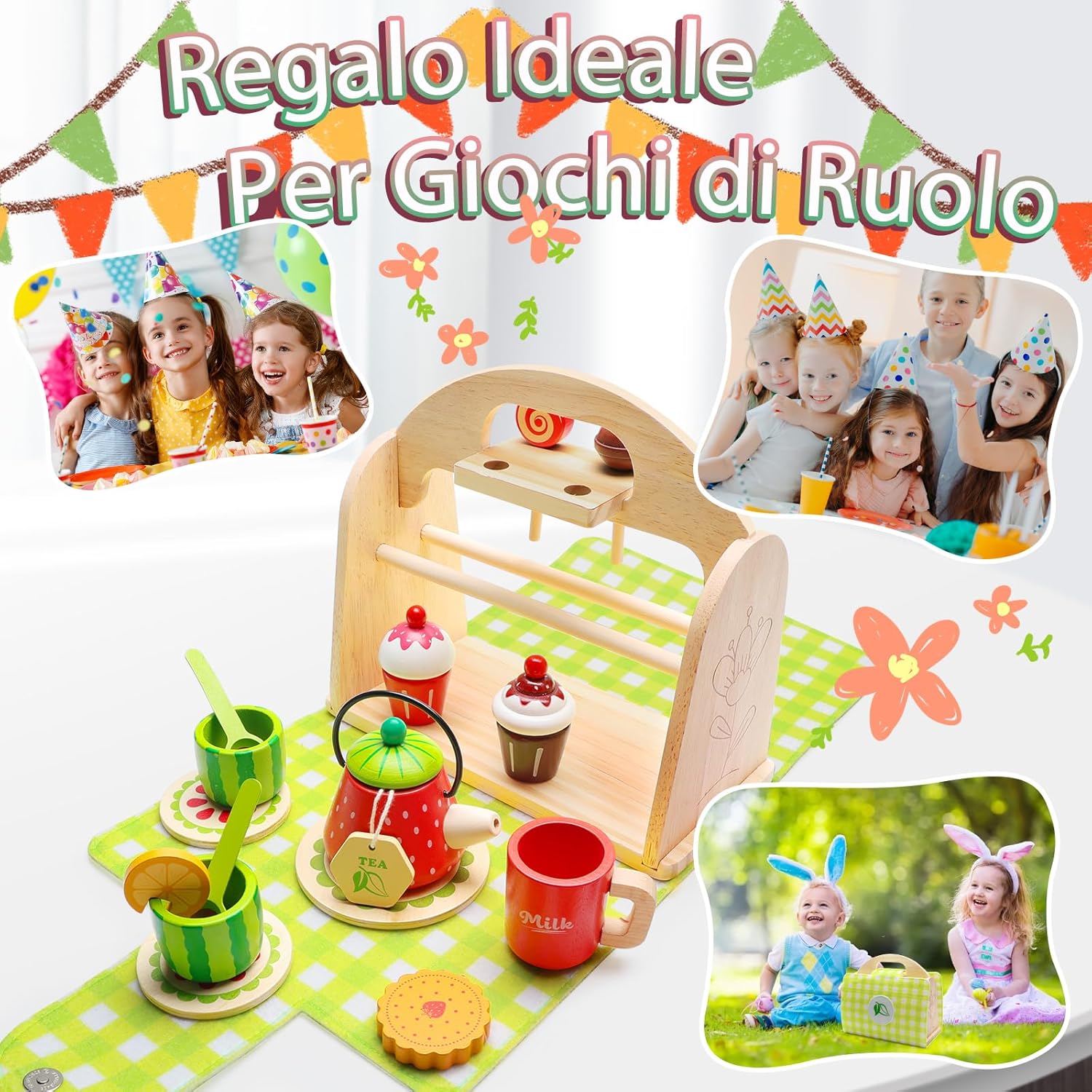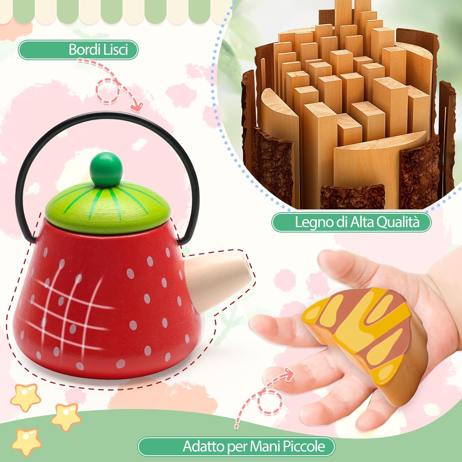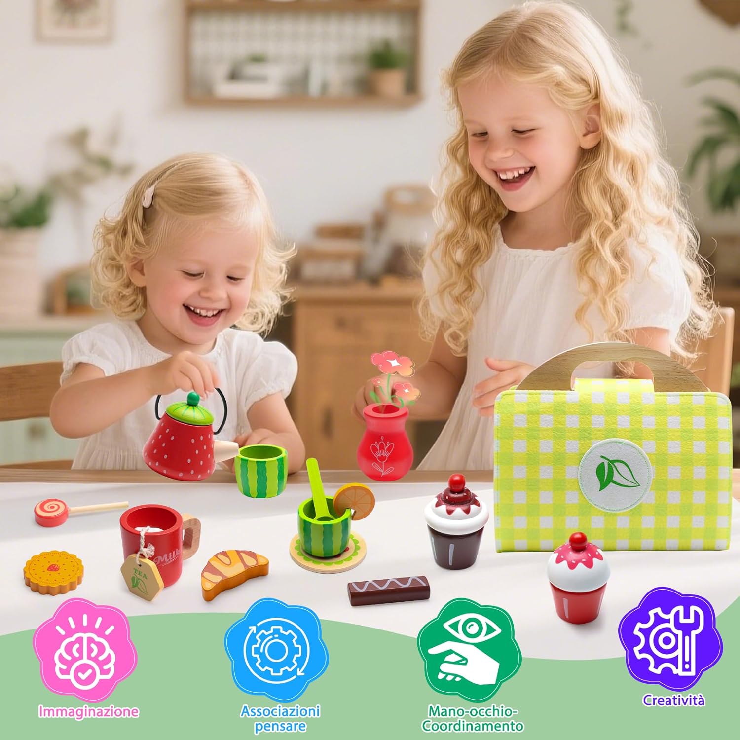 Set da tè per bambini VBACALA: Il set da tè per bambini VBACALA è composto da 23 pezzi, tra cui: valigetta di legno verde*1, teiera*1, tazza*3, ghiaccio*2, fette di limone*1, bustine di tè*1, cioccolato*1, cornetto*1, lecca-lecca*2, cucchiaio*2, biscotti*1, sottobicchiere*3. Gli accessori da cucina per bambini perfetti per far giocare bambine e bambini dai 3 anni in su. Scoprite il divertimento di bere il tè e giocate di ruolo con il vostro bambino Materiale in legno di alta qualità: i nostri accessori da cucina per bambini sono realizzati in legno sicuro che soddisfa i più alti standard di qualità. La superficie liscia è adatta alle mani dei più piccoli ed è il regalo ideale per la cucina dei bambini per un gioco sostenibile Gioco di ruolo creativo: questa valigia giocattolo in legno verde stimola la creatività e lo spirito di scoperta del bambino. Lasciate che costruisca la sua piccola cucina, che serva il tè del pomeriggio e che giochi di ruolo con i più piccoli per sviluppare le abilità sociali e il lavoro di squadra Sorpresa in valigia: il set da tè per bambini viene fornito con una valigia di legno verde in cui i bambini possono facilmente portare con sé i loro “tesori”. Quando si apre la valigia di legno verde, questa viene sostituita da un tappetino verde e da un vassoio per gli utensili da cucina, in modo che i bambini possano divertirsi a cucinare sempre e ovunque Giocattolo da tè all'aperto: che si tratti di una riunione di famiglia o di una gita con gli amici, questo set da gioco per il tè pomeridiano in legno è la scelta perfetta per i bambini. Il set da tè per bambini di VBACALA è adatto a bambini e bambine dai 3 anni in su ed è un regalo ideale per compleanni, Natale, Halloween, Festa dei bambini e altre ricorrenze