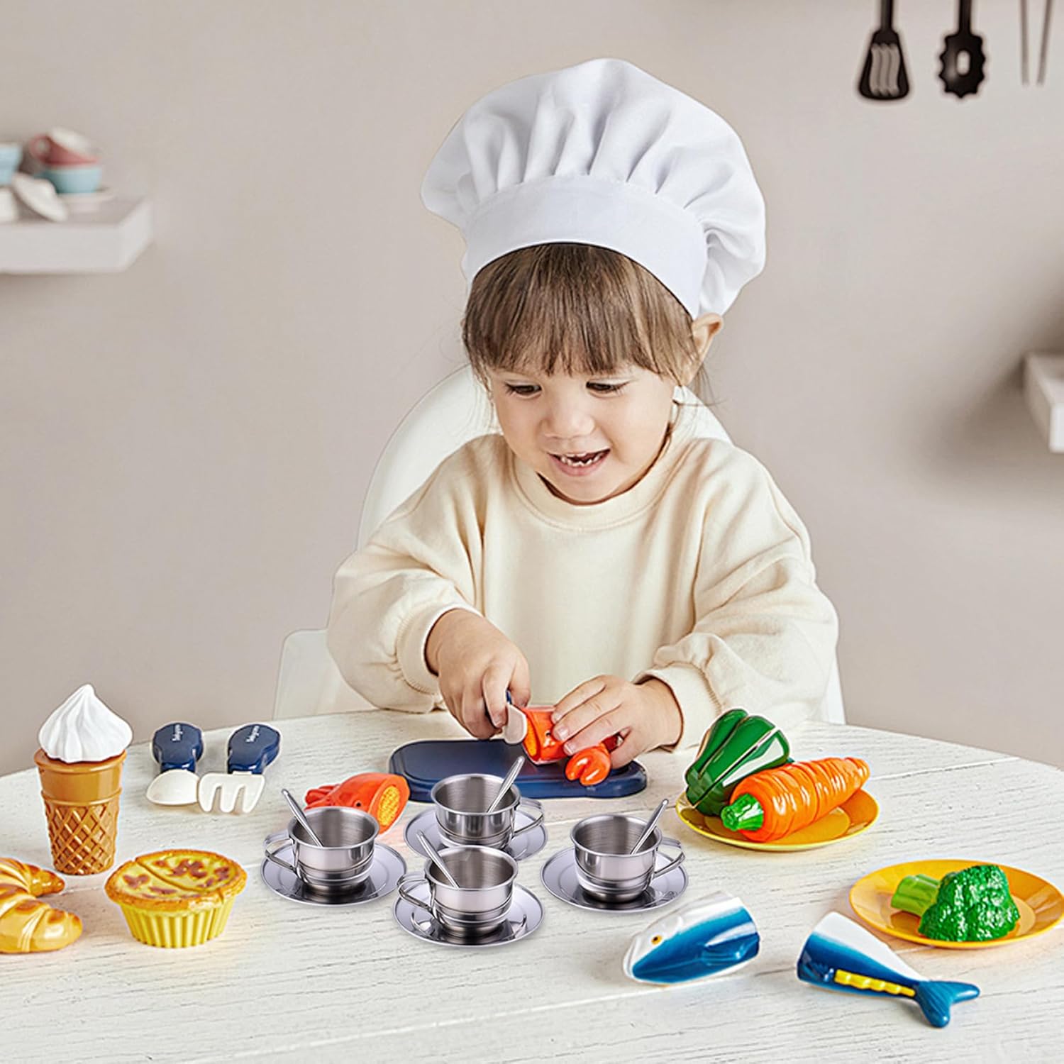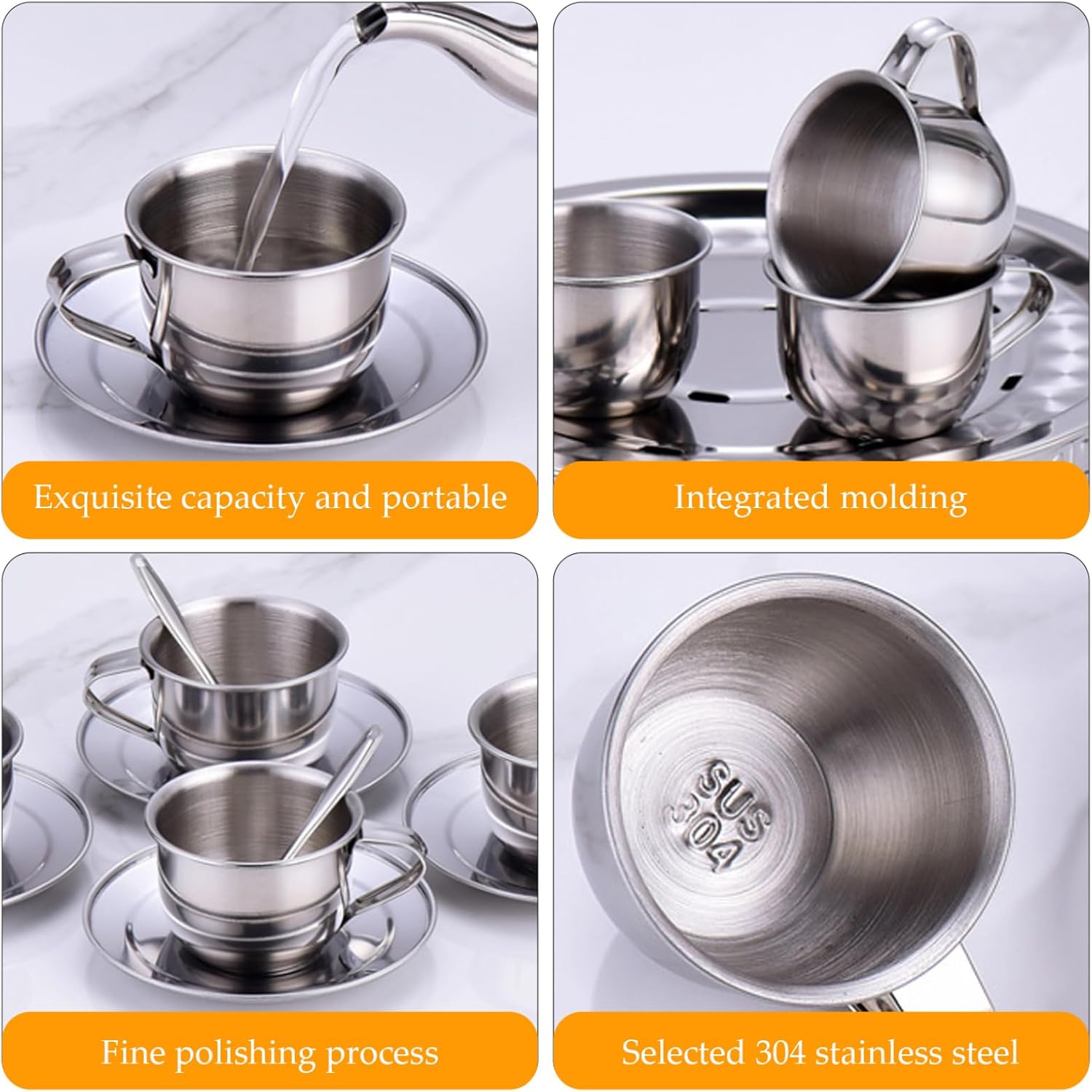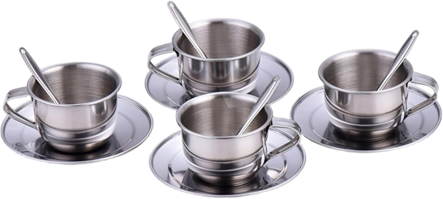Robusto e facile da pulire: la struttura in acciaio inossidabile garantisce durata e manutenzione senza problemi; i panni superficiali lisci e resistenti alla ruggine si puliscono rapidamente per mantenere l'igiene una priorità assoluta. Genere neutro ed elegante: progettato per ragazze e ragazzi, questo elegante set da tè offre una finitura in acciaio inossidabile senza tempo che si abbina a qualsiasi stanza dei giochi con fascino moderno e inclusività. Design sicuro e resistente al calore: questo set da tè per bambini è realizzato in acciaio inossidabile resistente al calore, garantendo un gioco sicuro senza il rischio di bruciature o rotture. Lo rendono ideale per l'immaginazione attiva dei bambini Elementi essenziali del set completo: il set comprende quattro tazze, quattro piattini e quattro cucchiai, fornendo tutto il necessario per un'esperienza coinvolgente del tea party che incoraggia la condivisione e il gioco di ruolo Tazze compatte da 70 ml: Ogni set contiene quattro tazze da 70 ml, perfettamente dimensionate per le mani dei più piccoli, consentendo impugnature comode e facile manipolazione promuovendo al tempo stesso il gioco sociale tra i bambini