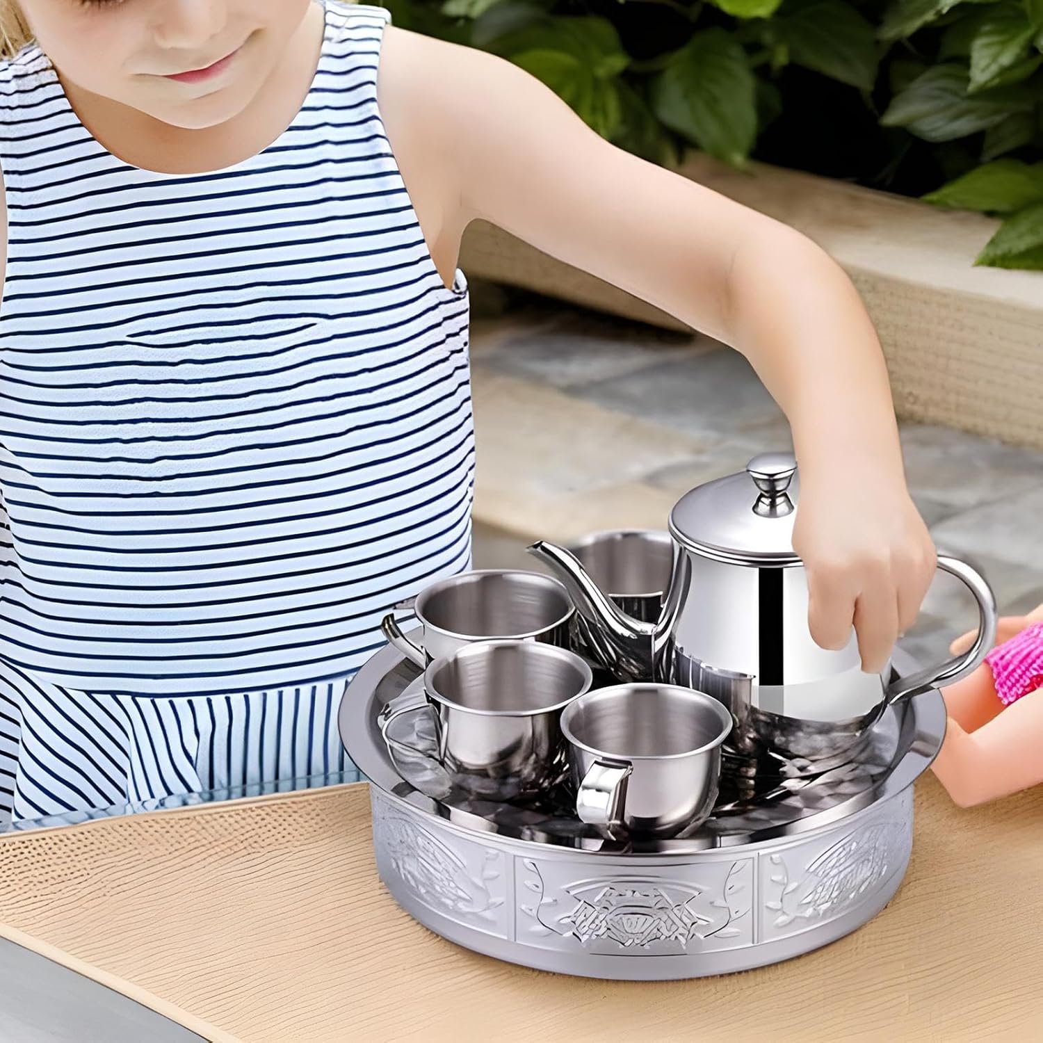 Sviluppo Abilità: Prodotto per favorire l'interazione sociale e potenziare le capacità motorie grazie al design ergonomico adatto ai bambini, ideale per attività educative e giochi interattivi di formazione Esperienza Didattica: Questo servizio da tè in acciaio inossidabile stimola la creatività incoraggiando il gioco di ruolo, risultando strumento educativo e divertente per coltivare le buone maniere durante momenti di gioco interattivo. Design pratico e affidabile: Set da tè in acciaio inossidabile con design portatile ideale per interni ed esterni, offre mobilità senza grazie al vassoio dedicato che organizza teiera e tazze in modo sicuro durante viaggi o incontri Materiale Durevole: Realizzato in acciaio inossidabile 304, resiste a ruggine e usura per utilizzo a lungo termine, mantenendo integrità strutturale e sicurezza per tutti gli utenti Filtro Preciso: Maglia fine integrata trattiene particelle di tè assicurando bevanda limpida mantenendo la preparazione scorrevole