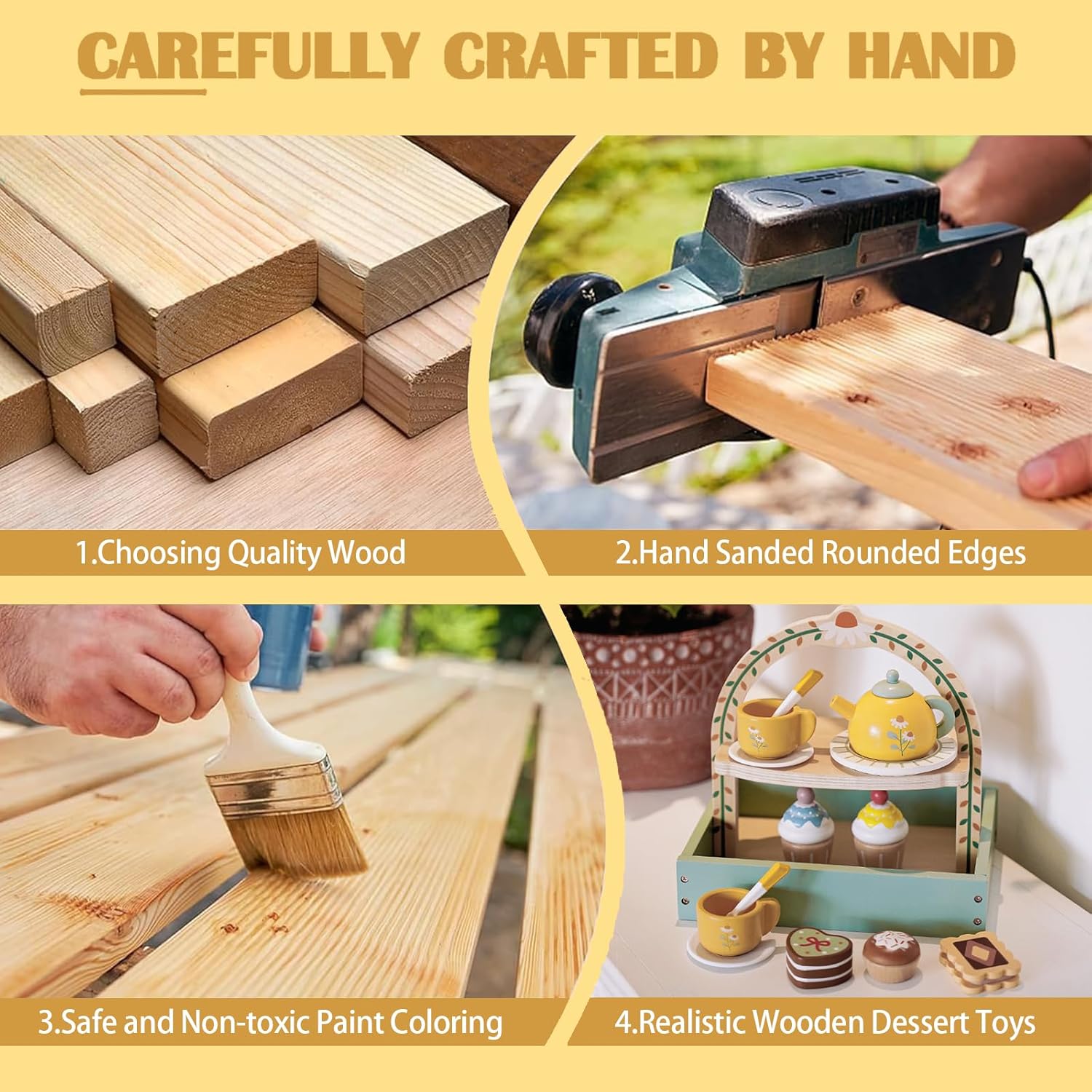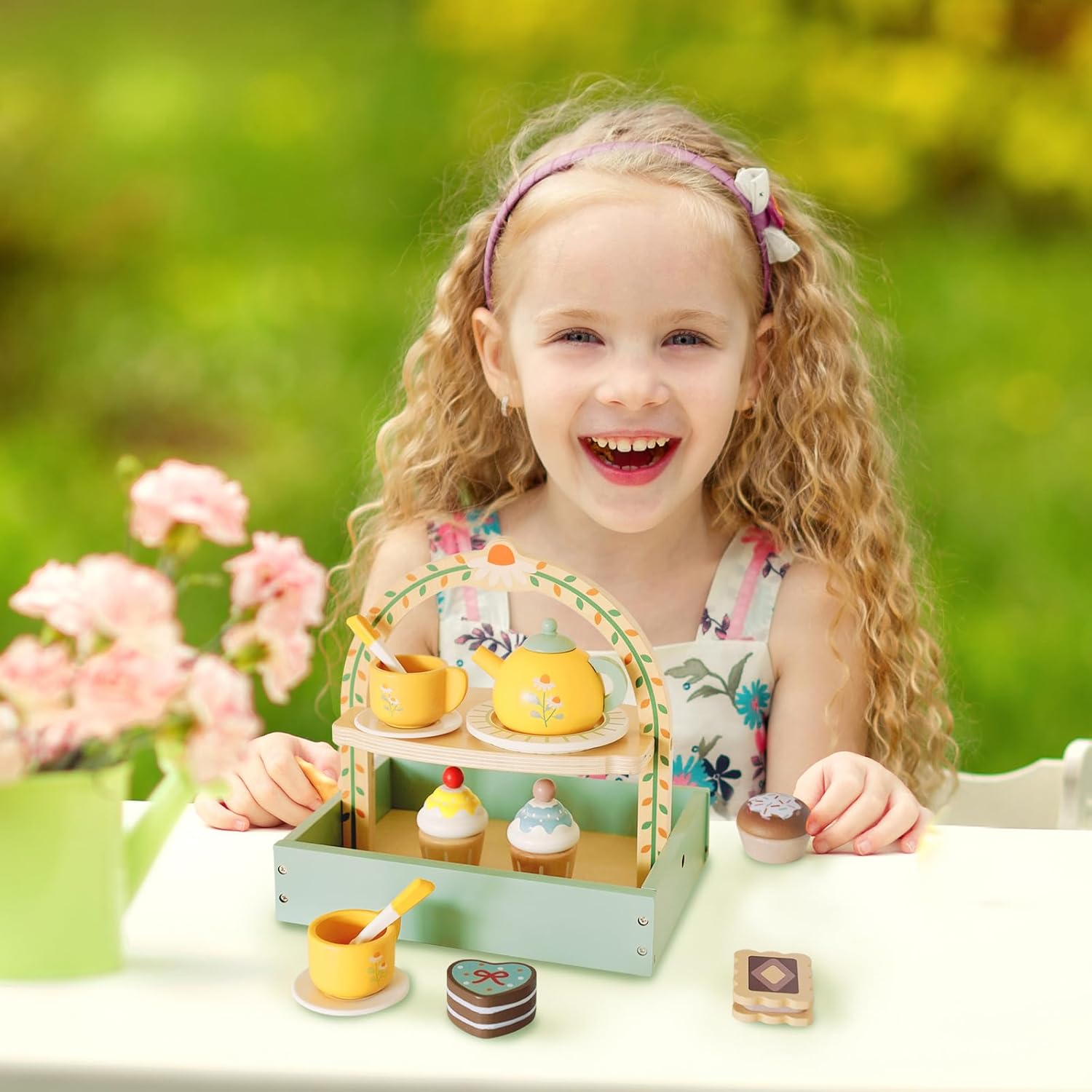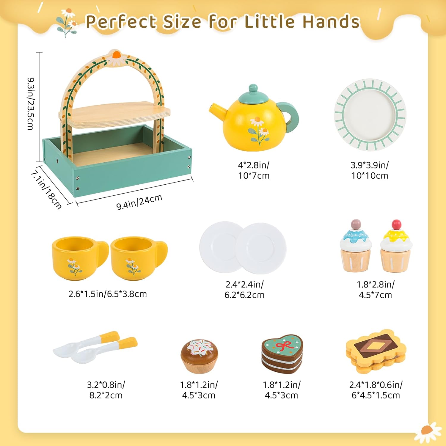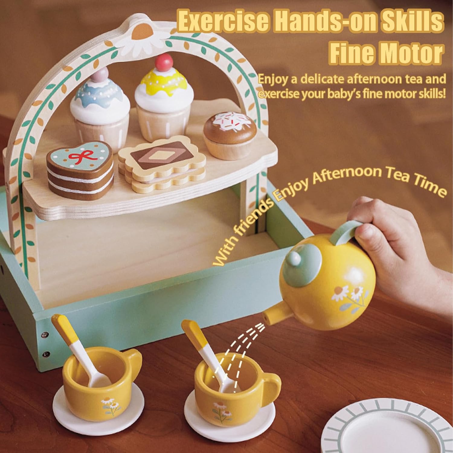 Materiali sicuri e durevoli: questo set da tè per ragazze è realizzato in legno. I bordi lisci del set da tè proteggono le piccole mani dei bambini. La sua struttura robusta è più durevole e resistente alle cadute rispetto ai giocattoli di plastica. Fornisce divertimento senza fine ai bambini garantendo la loro sicurezza. Vero gioco di ruolo: il set da tè in legno è appositamente progettato per il divertimento dei bambini. I colori vivaci del set da tè per bambini attirano l'attenzione dei bambini e simulano la scena più realistica di un tea party, i giocattoli in legno per bambini dai 3 ai 5 anni permettono ai bambini di godersi appieno il momento rilassante dell'ora del tè. Imparare divertendosi: il set da tè per ragazze consente ai bambini di acquisire nuove conoscenze divertendosi, sviluppare la propria indipendenza, migliorare la coordinazione occhio-mano e li incoraggia attivamente a socializzare e comunicare con i loro coetanei e familiari. I migliori regali per i più piccoli: il set da tè per bambini è un giocattolo che i bambini adoreranno. Regalato ai bambini a Natale, Halloween e alle feste di compleanno, il set da tè per ragazze sarà un regalo ideale per i bambini. Il set da tè per bambini permetterà ai vostri bambini di godersi uno spuntino senza schermi. Cosa riceverai? -- Riceverai 1 custodia per lo snack, 1 piatto, 1 teiera, 2 piattini, 2 tazze, 2 cucchiai, 2 bustine di tè, 3 biscotti, 2 cupcakes e 4 dessert. Il servizio da tè per bambine dai 2 ai 4 anni ti permette di trascorrere più tempo da sola con i tuoi bambini. Questo set da tè per bambine dai 4 ai 6 anni sarà il miglior regalo per i tuoi bambini.